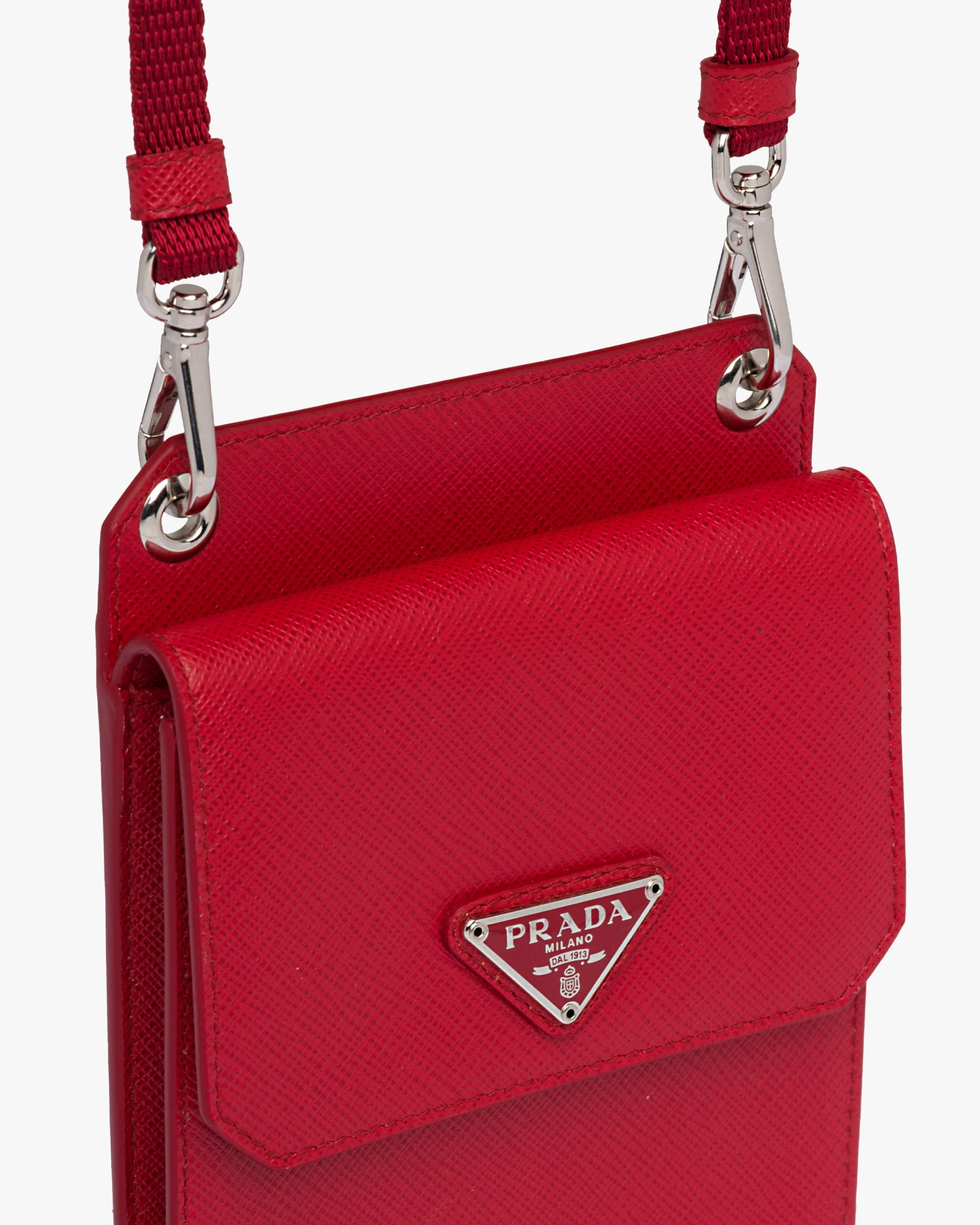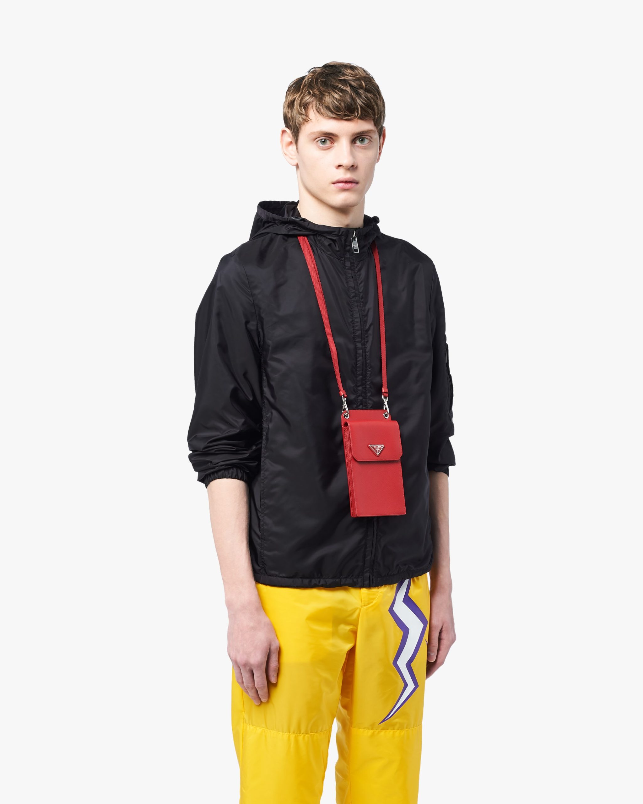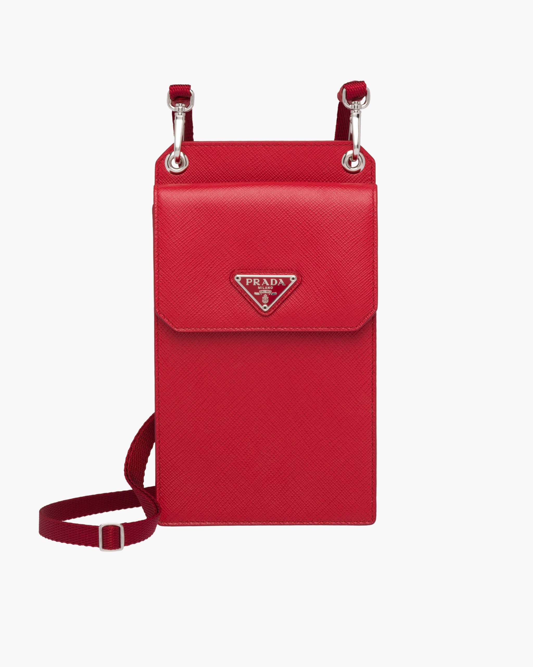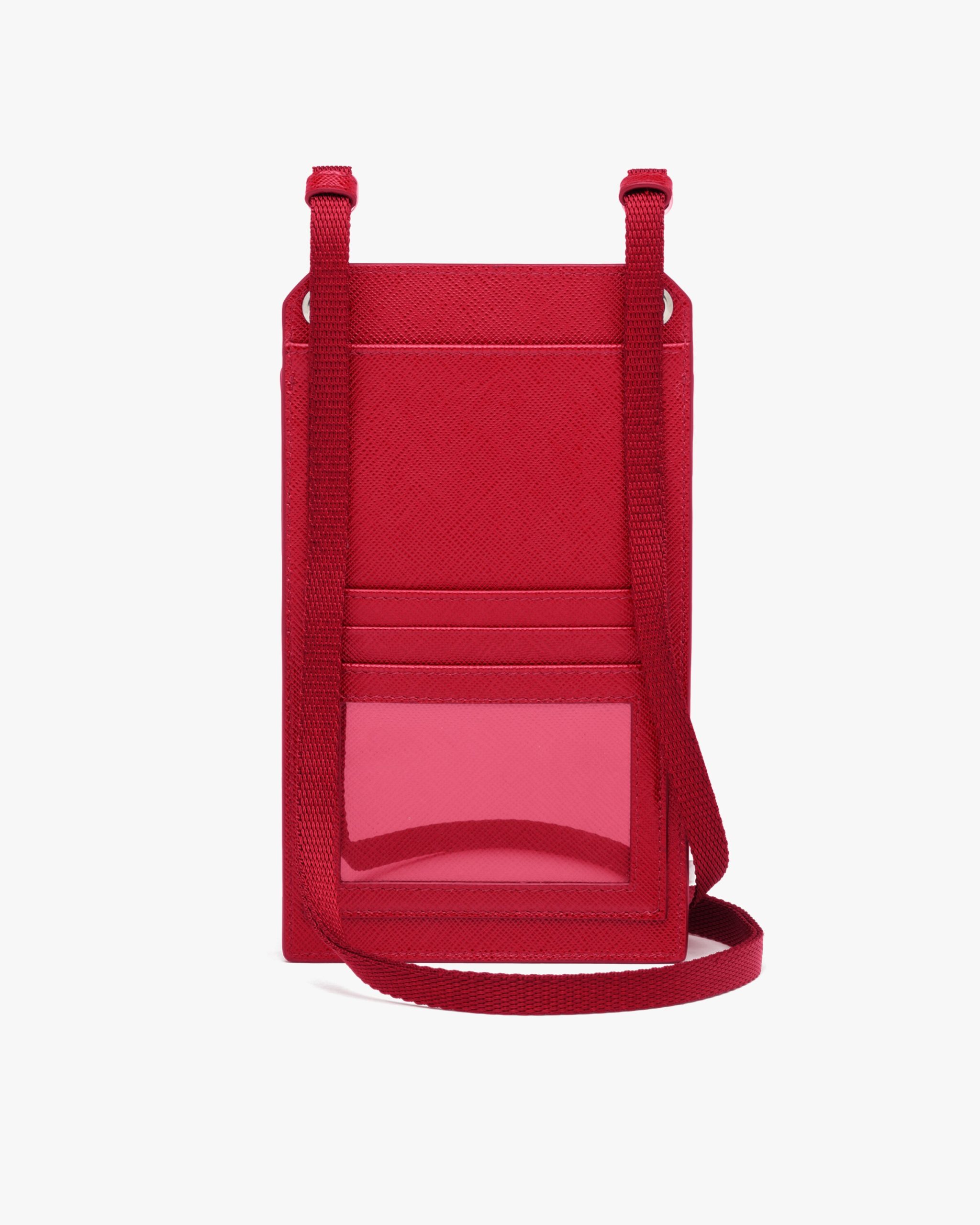 This Saffiano leather cellphone case can be conveniently worn with a shoulder strap and has a badge holder on the back. The flap closure with snap is decorated with the metal lettering logo.