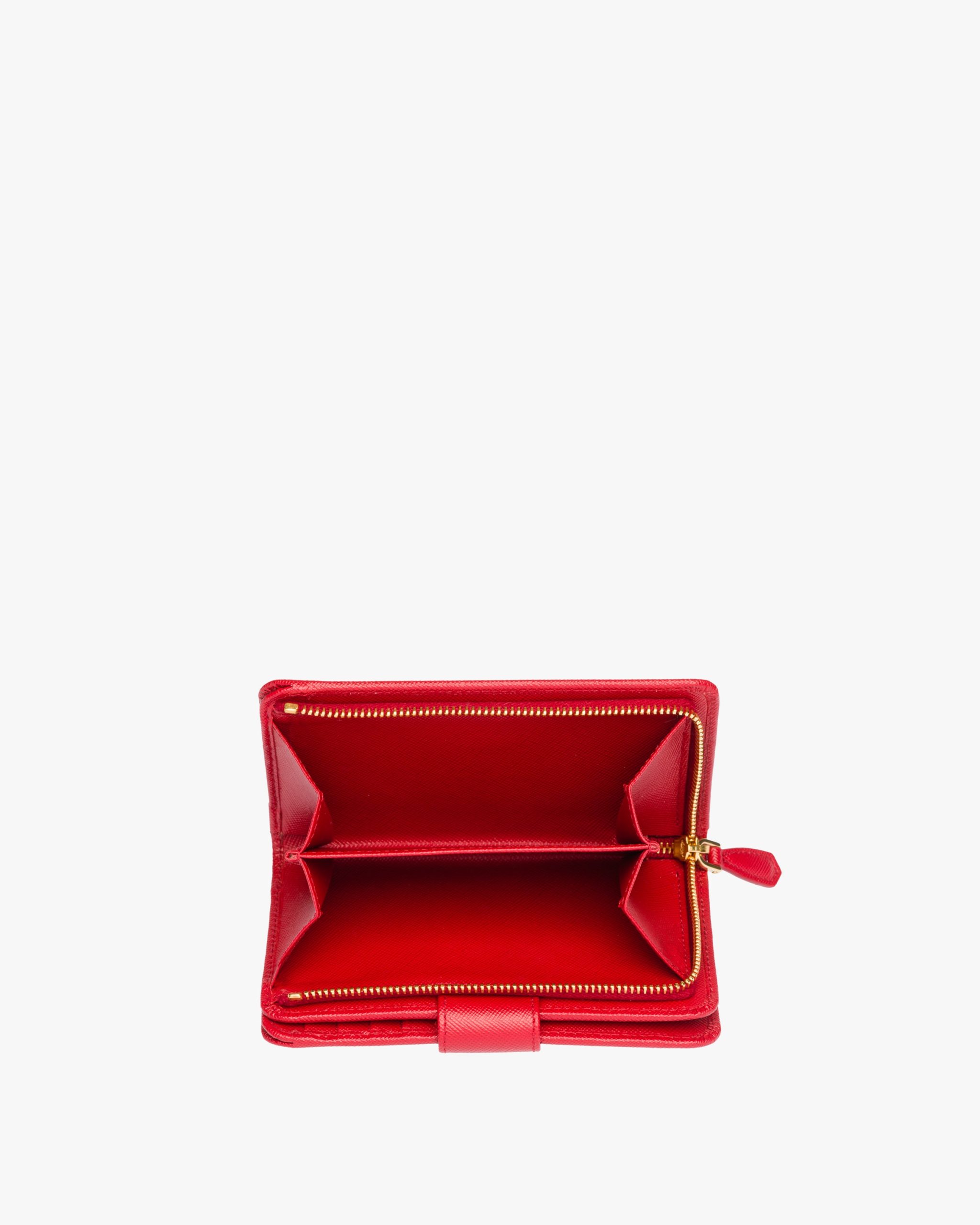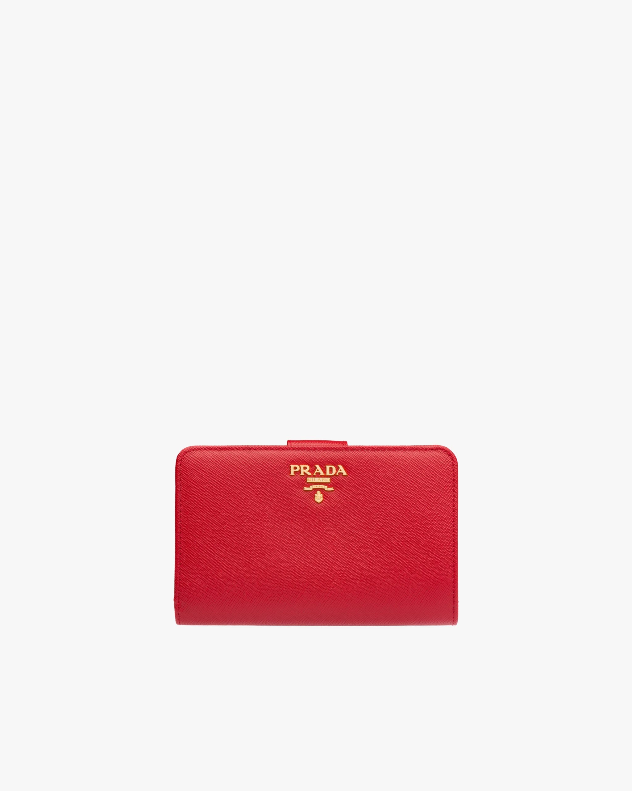 Decorated with Prada lettering, this Saffiano leather wallet closes on the back. Inside there are various compartments and pockets, in addition to a zippered coin compartment.