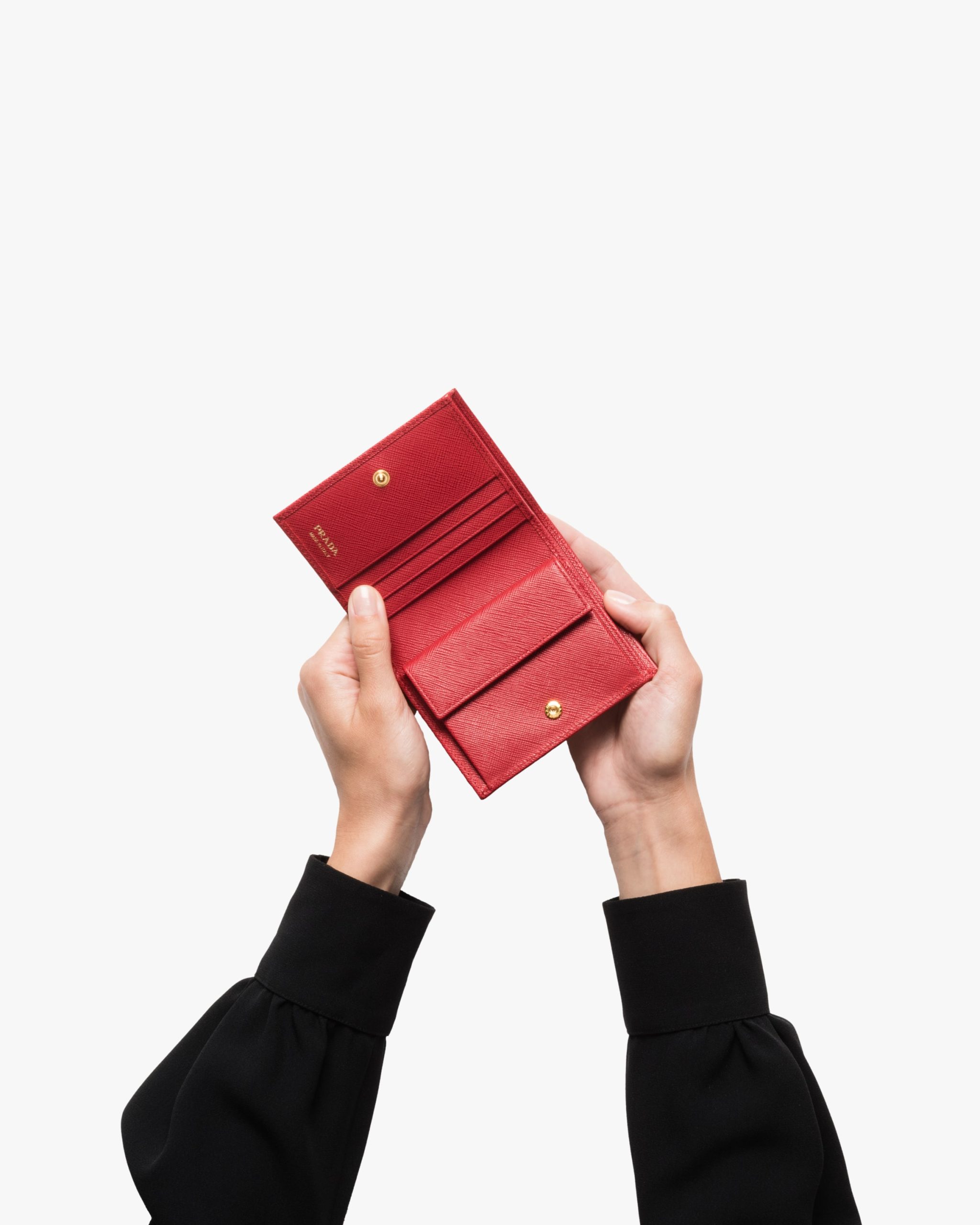 This monochrome wallet in fine Saffiano leather has an elegant minimalist design enhanced by the lustrous gold-tone lettering logo. There are several compartments and pockets inside.