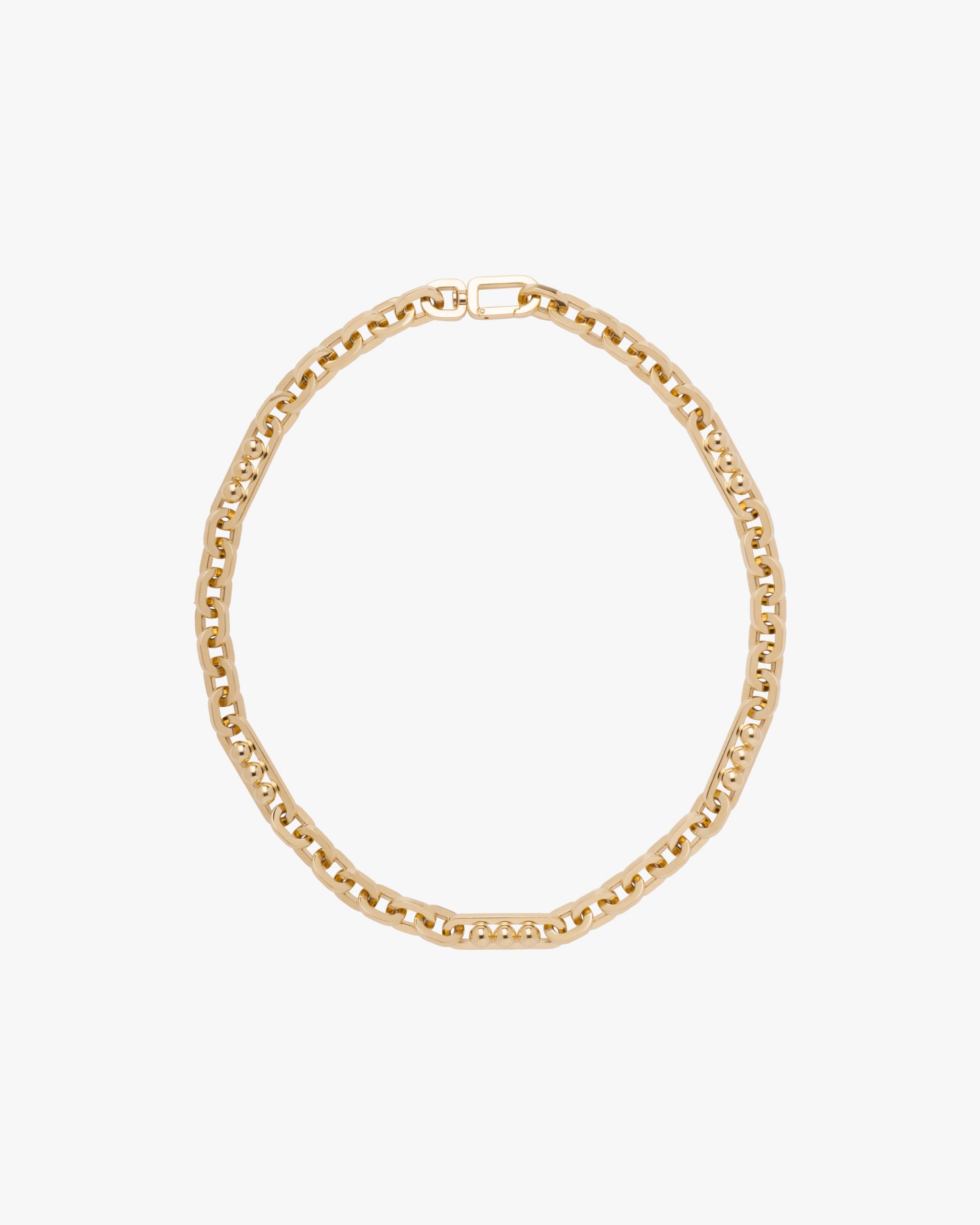 This metal necklace has a chain design with geometric inserts and lobster claw clasp.