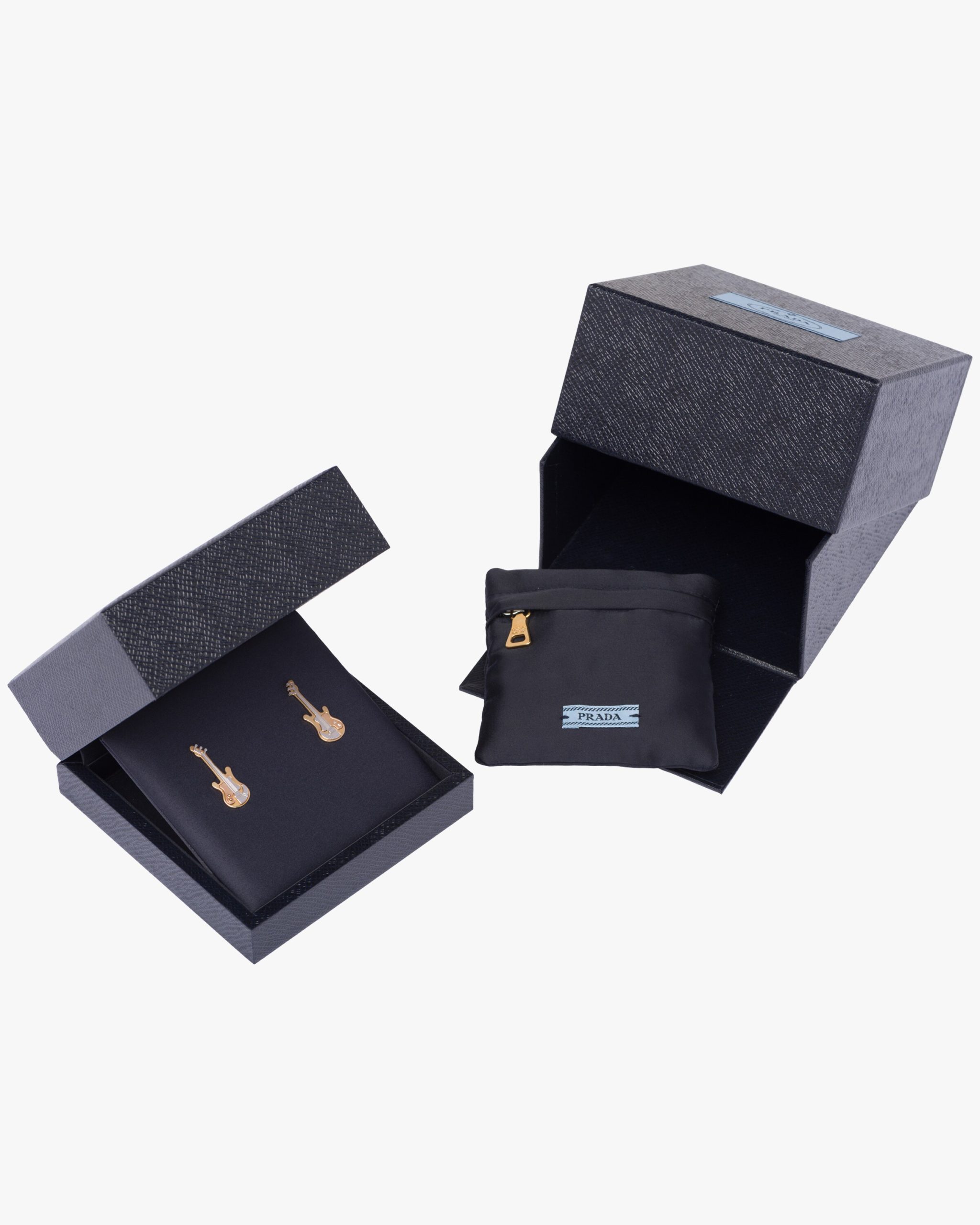 These gold earrings have a guitar-shaped charm embellished with diamonds.