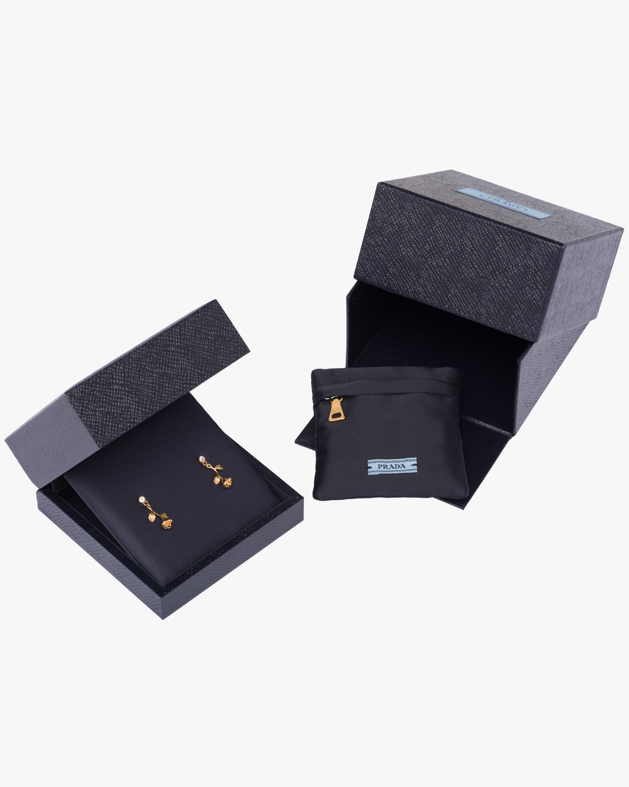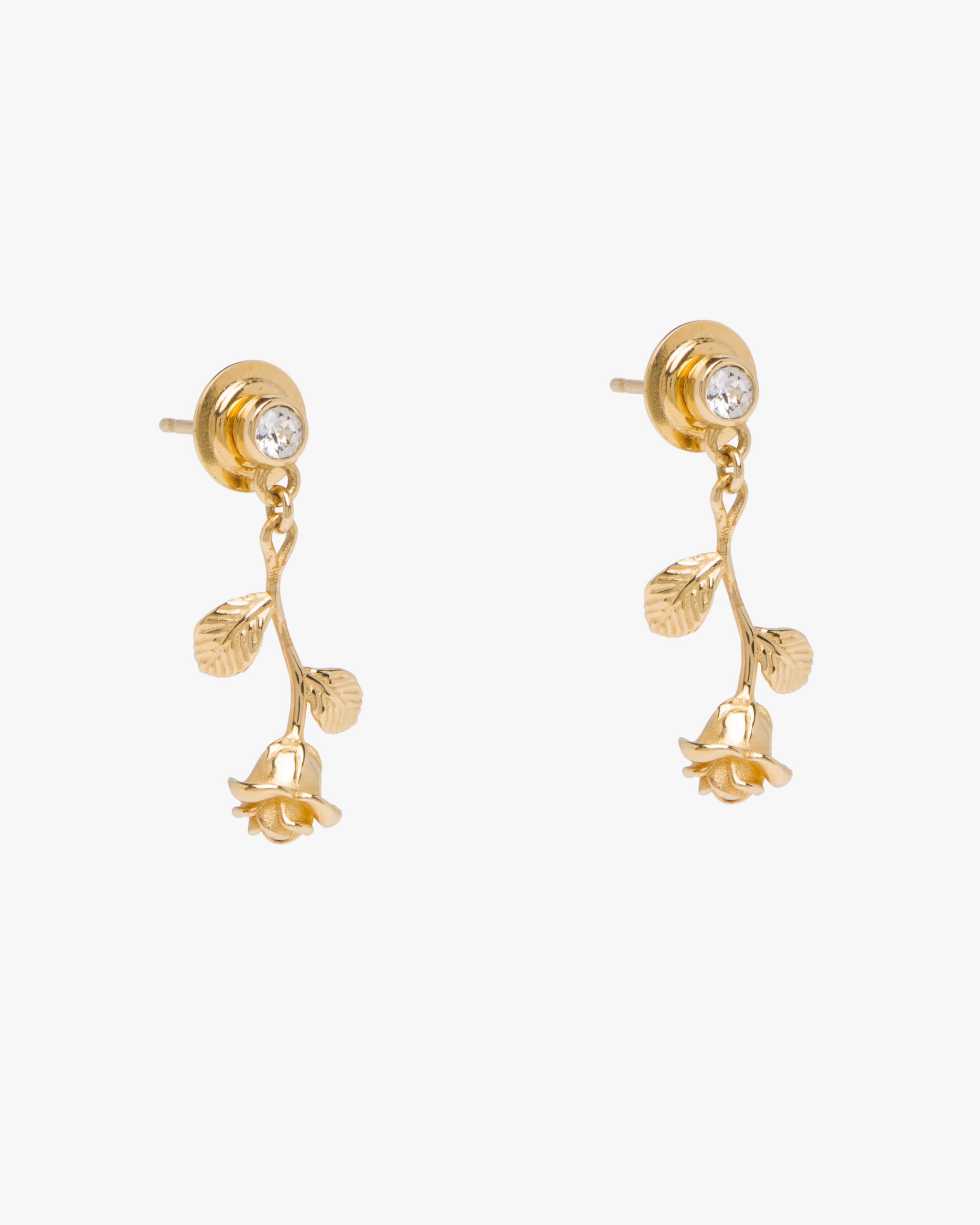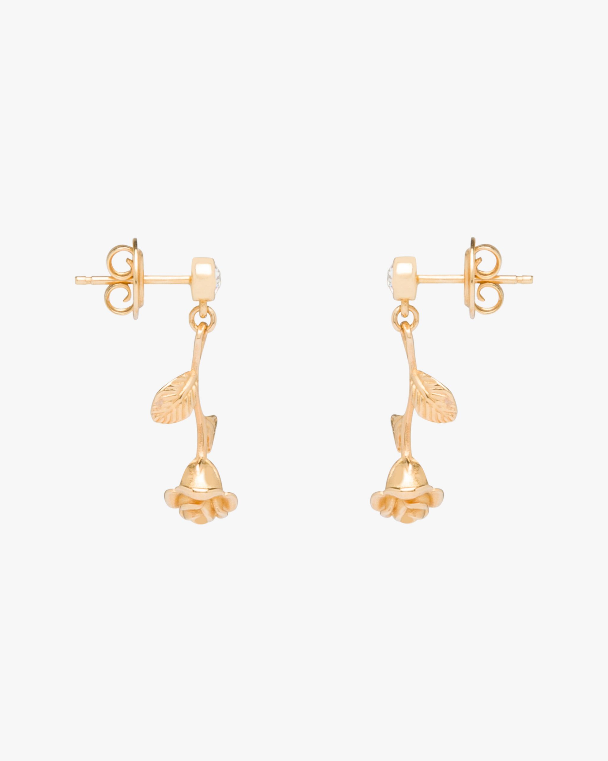 These gold earrings with rose-shaped charm are embellished with diamonds.