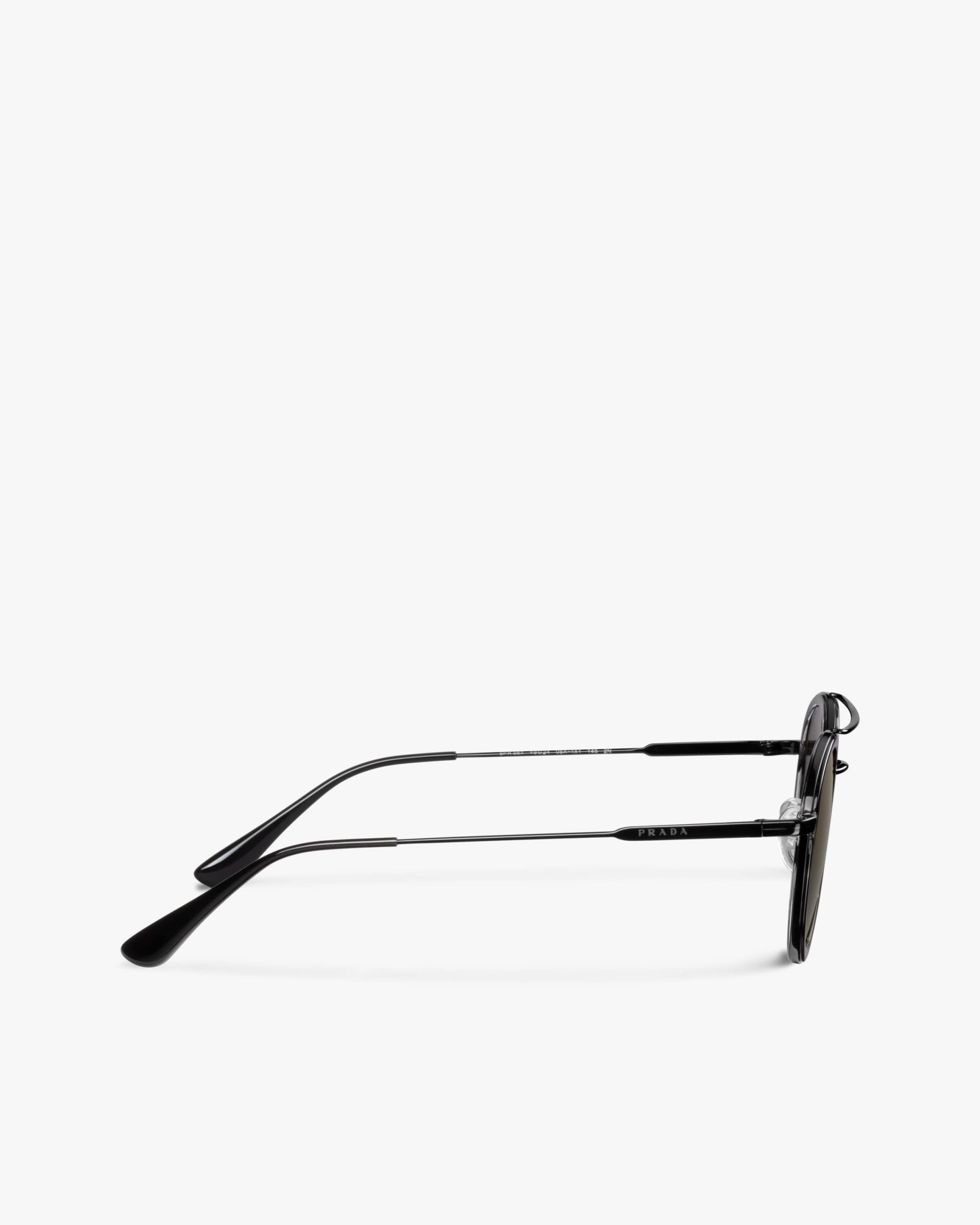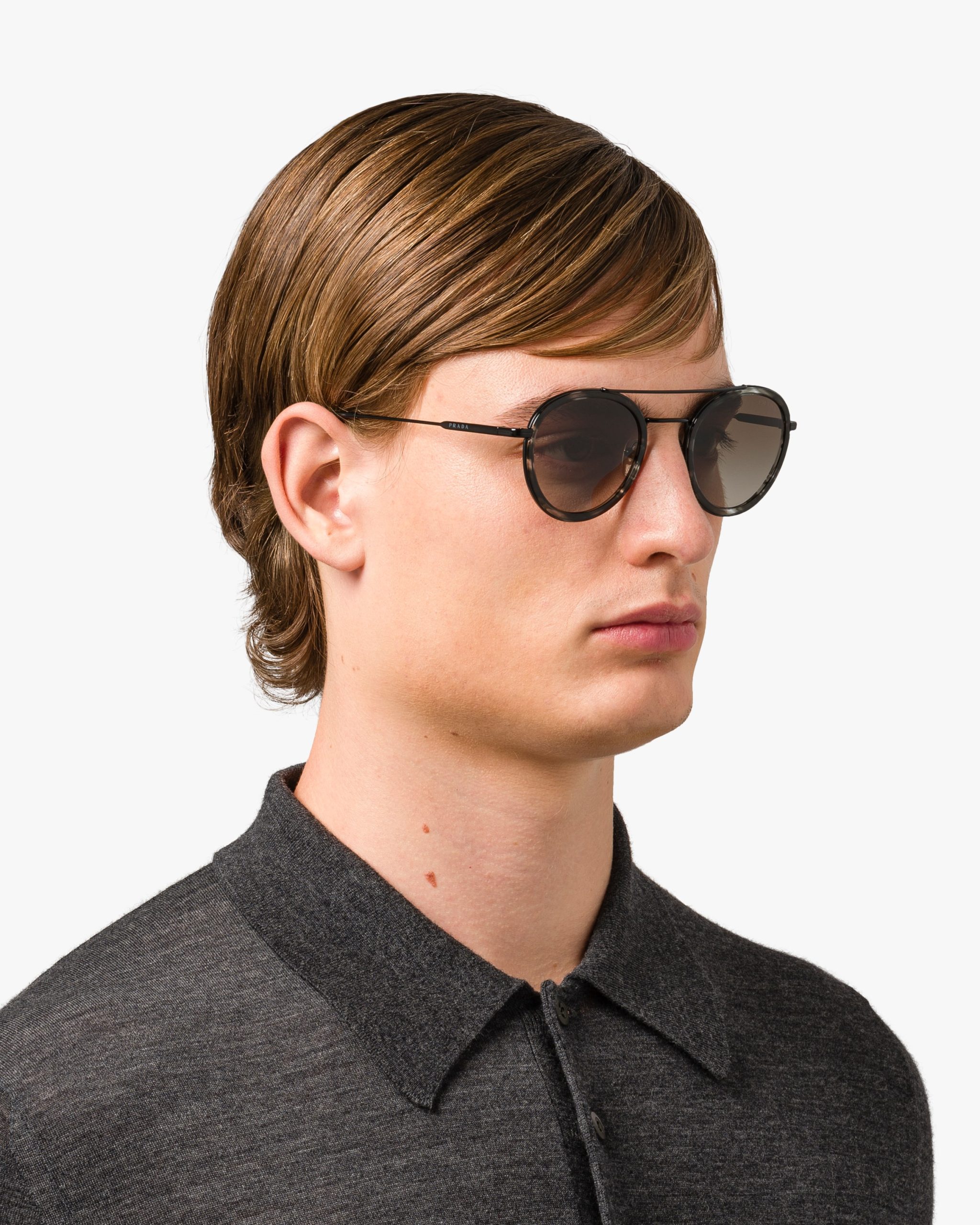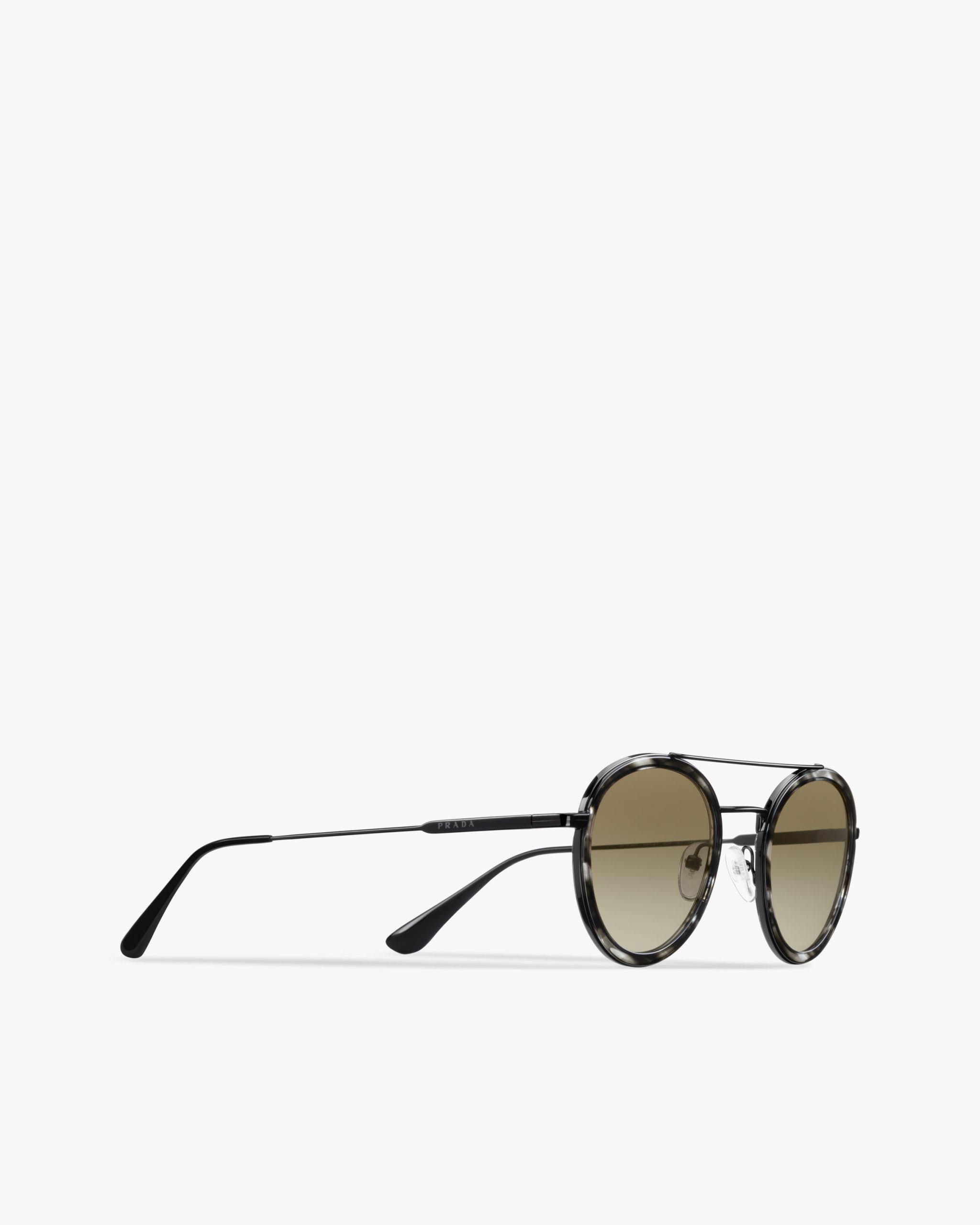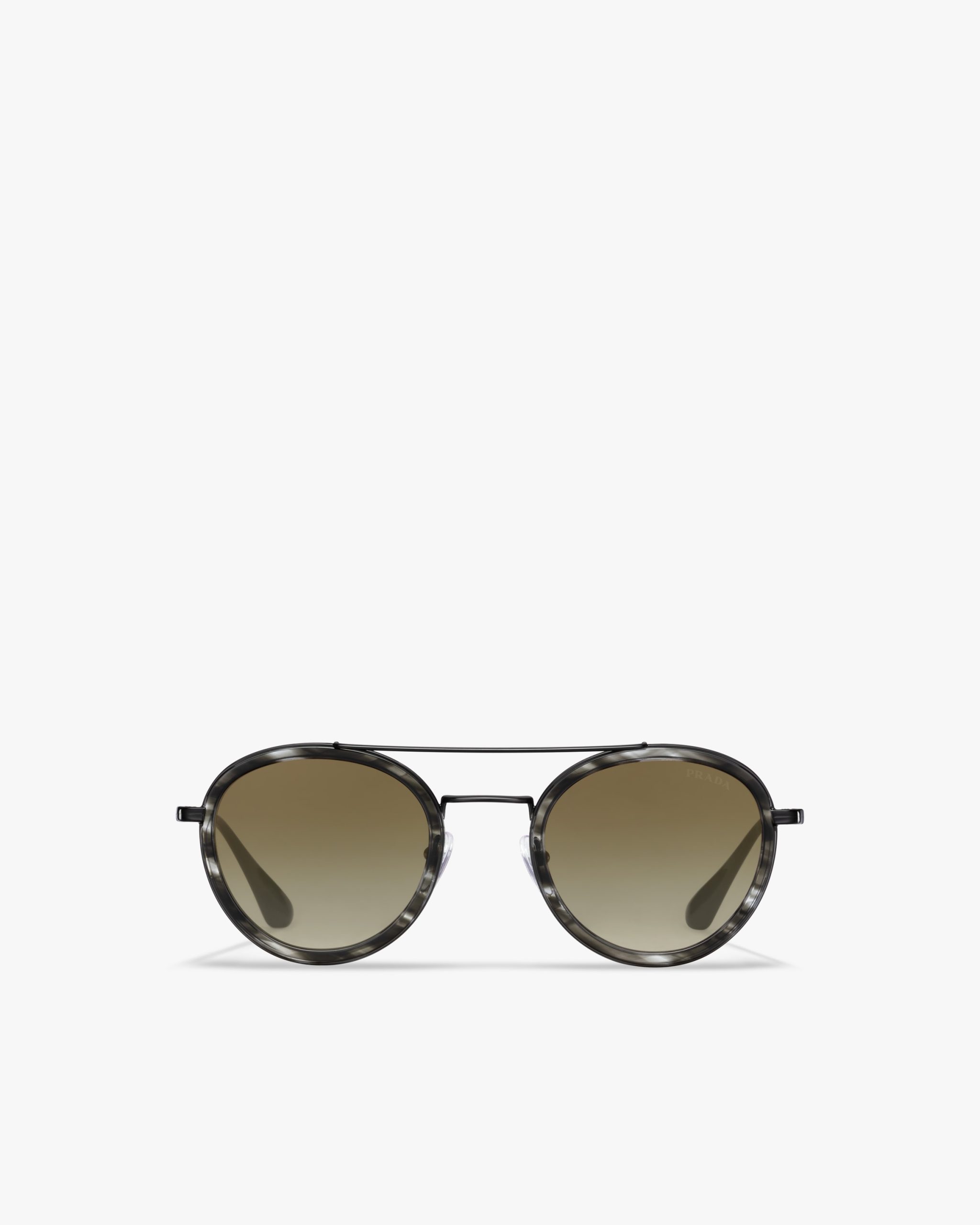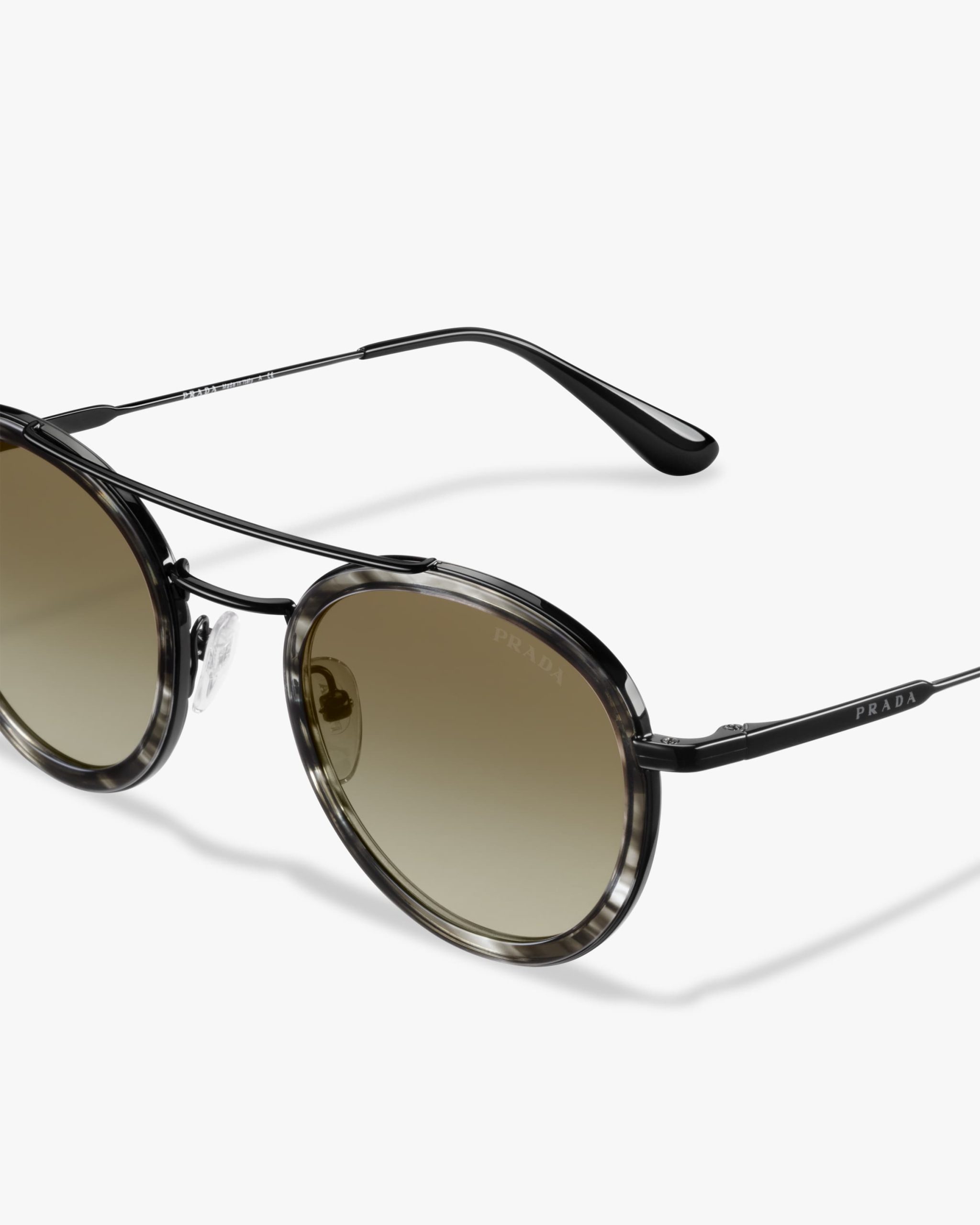 These sunglasses are defined by their pantos silhouette, elegant acetate rims and a double metal bridge with a contemporary touch. Prada lettering logo.