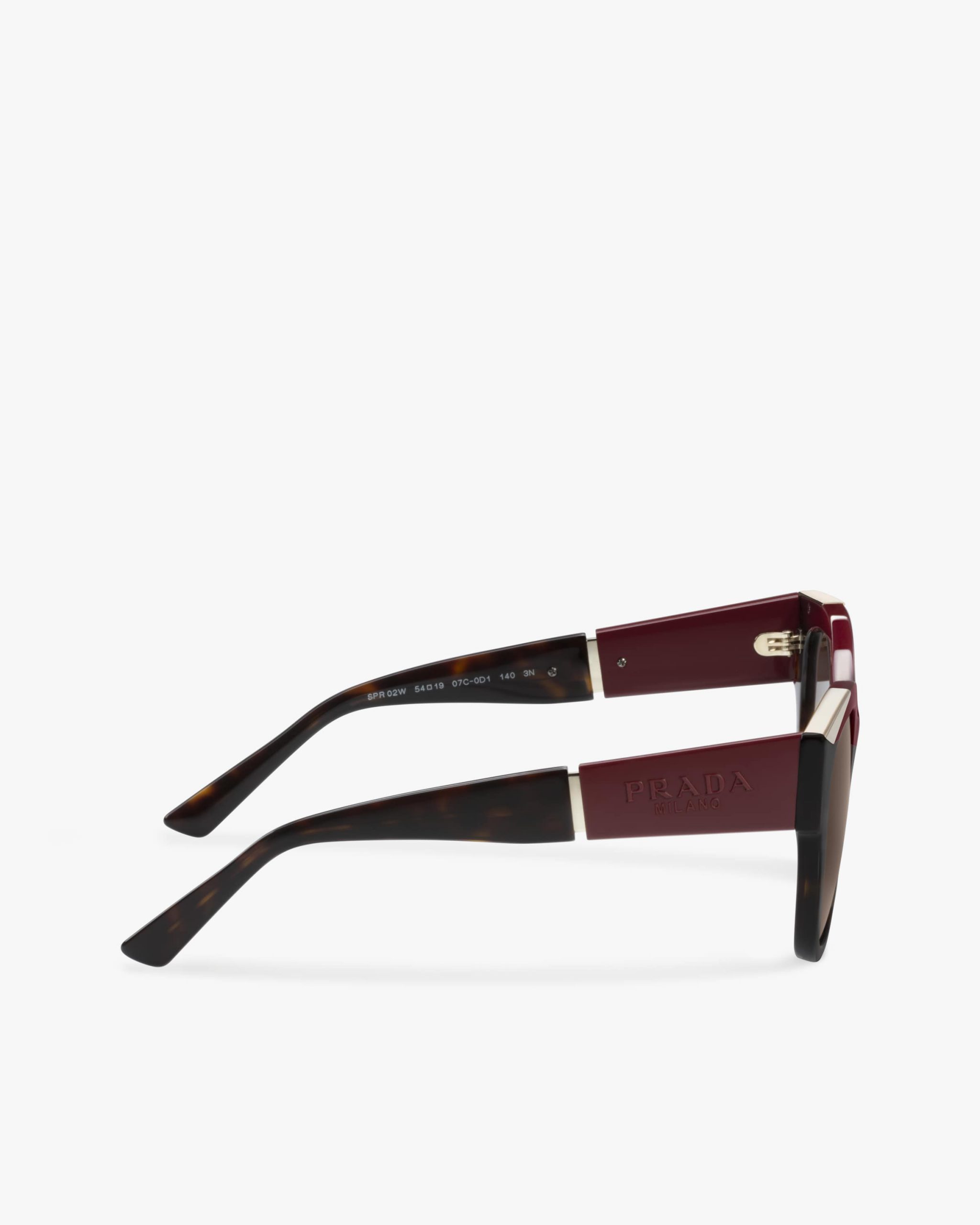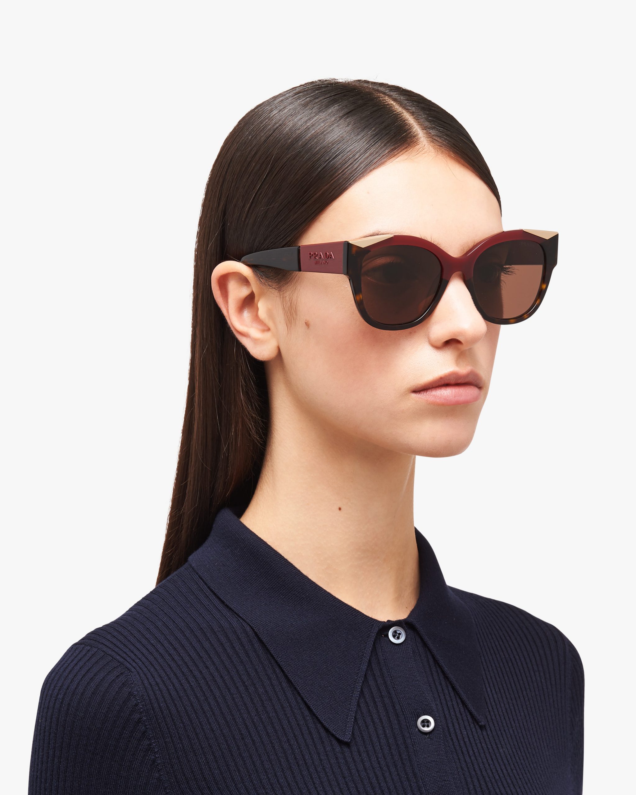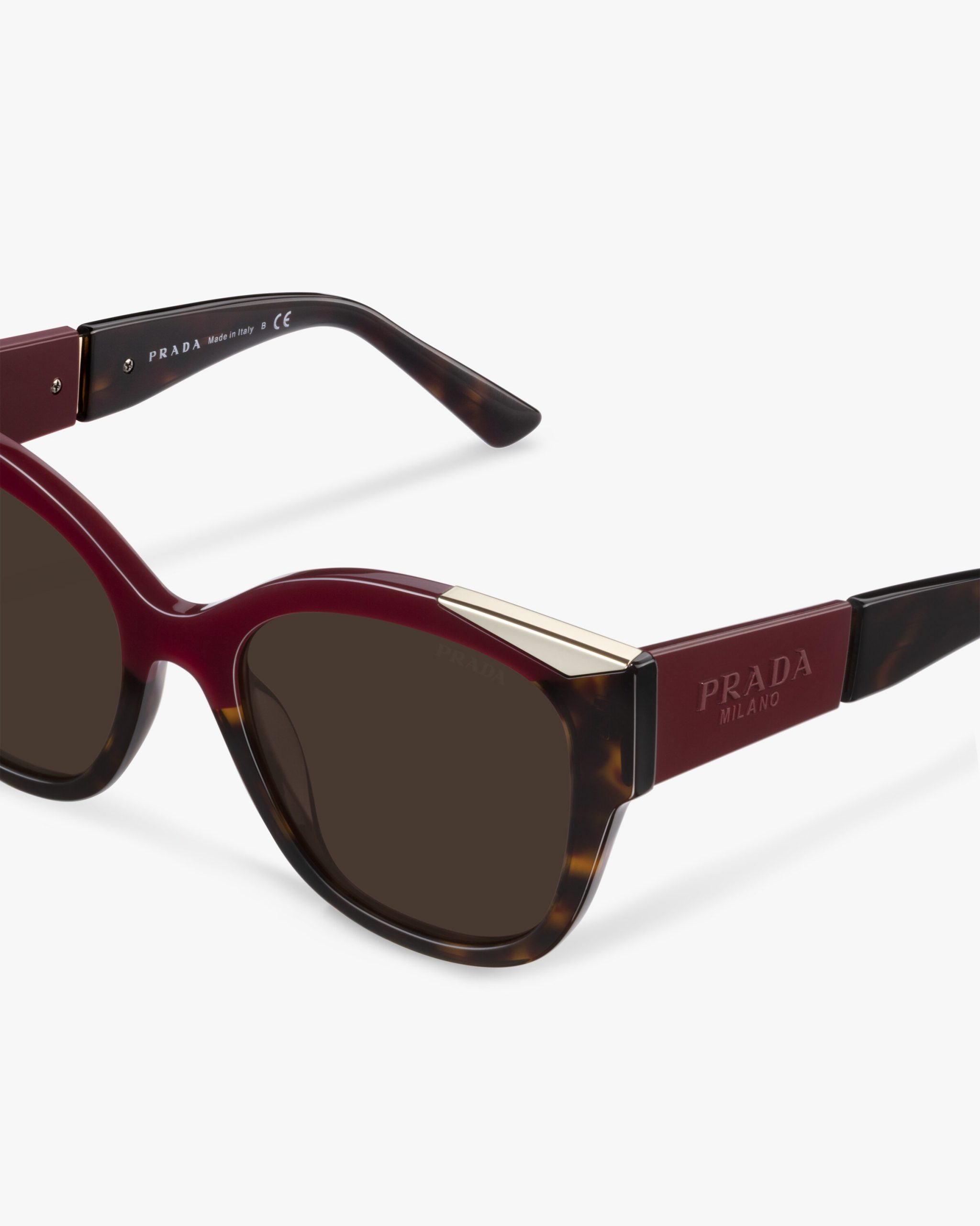Sunglasses with a cat-eye shape featuring a sophisticated combination of acetate layers and exclusive metal details. The temples reveal the exclusive application of the tonal Prada lettering logo in synergy with the accessories from the ?Monochrome? collectsion.