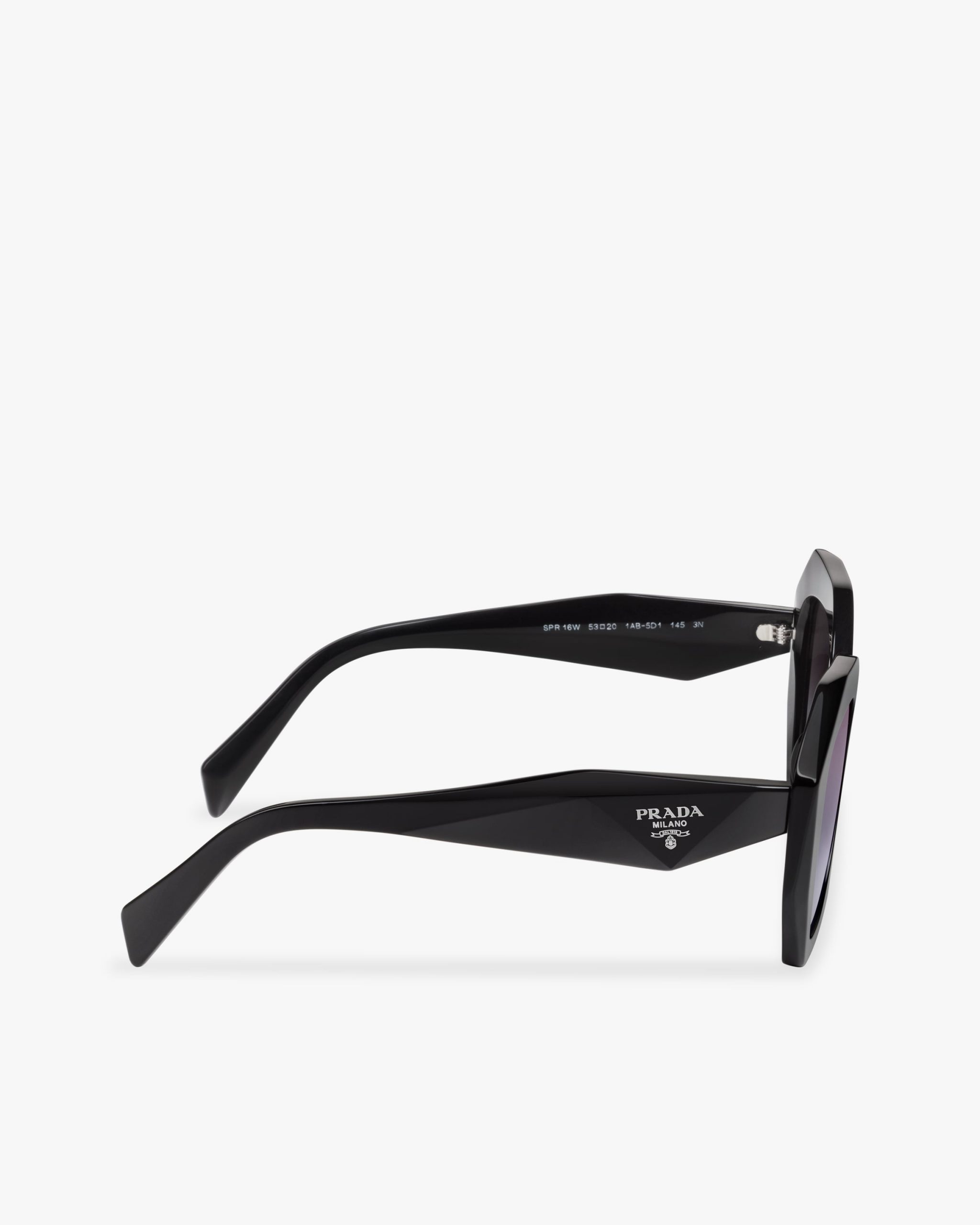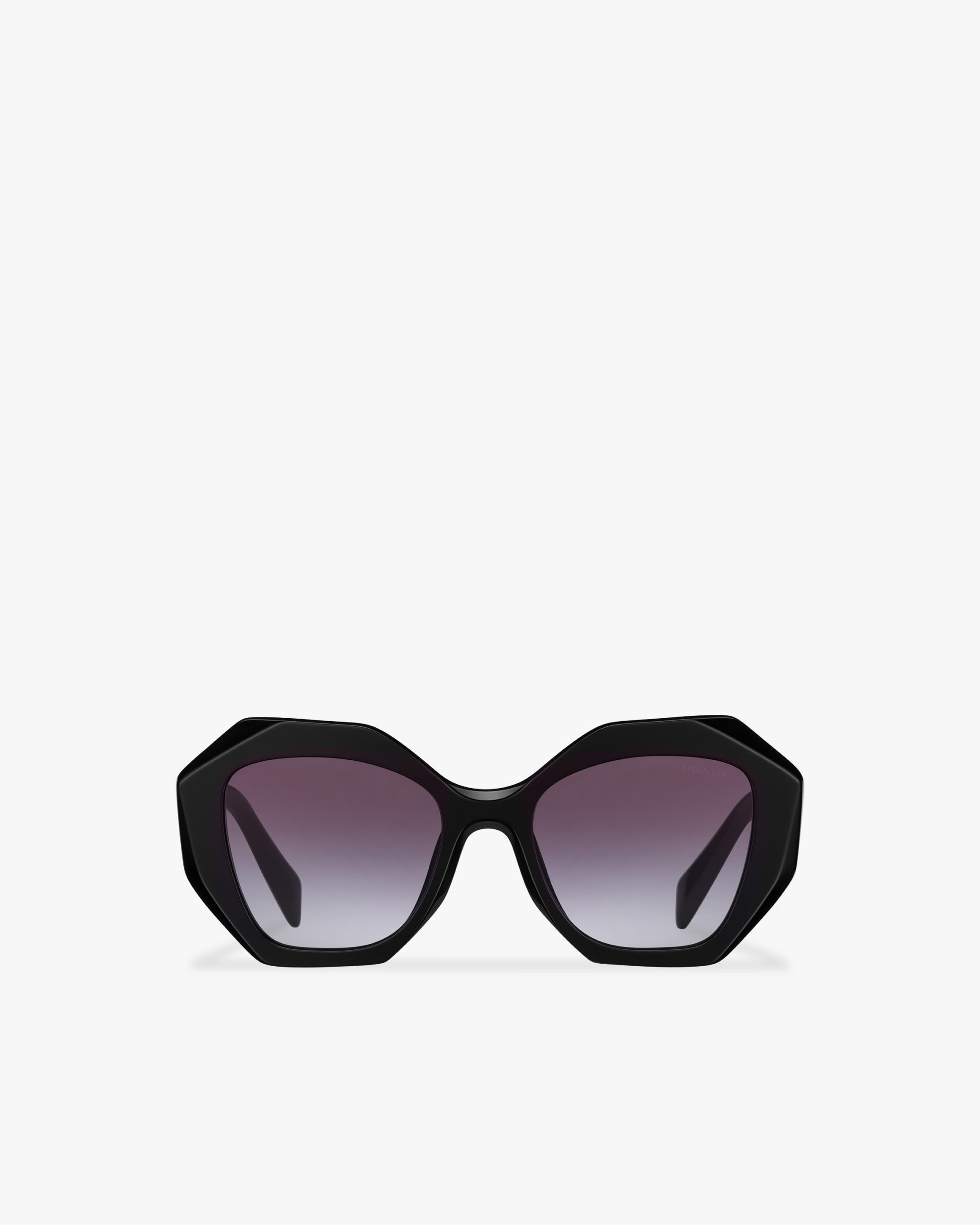 Oversized acetate sunglasses characterized by thick geometric lines and chunky volumes. The bold frame highlights a refined production technique defined by beveled angles on the outer corners. Three-dimensional faceting on the temples features an iconographic interpretation of the traditional Prada triangle logo.