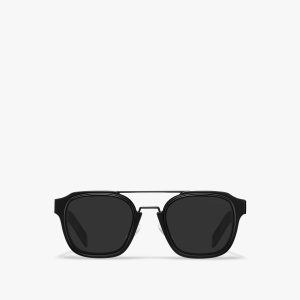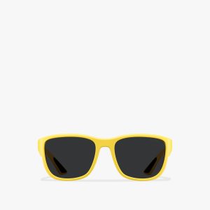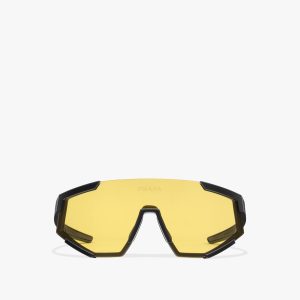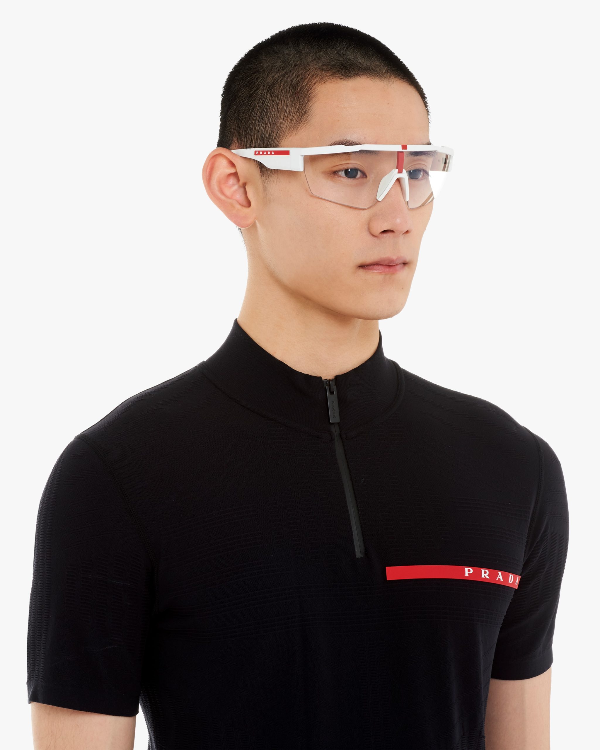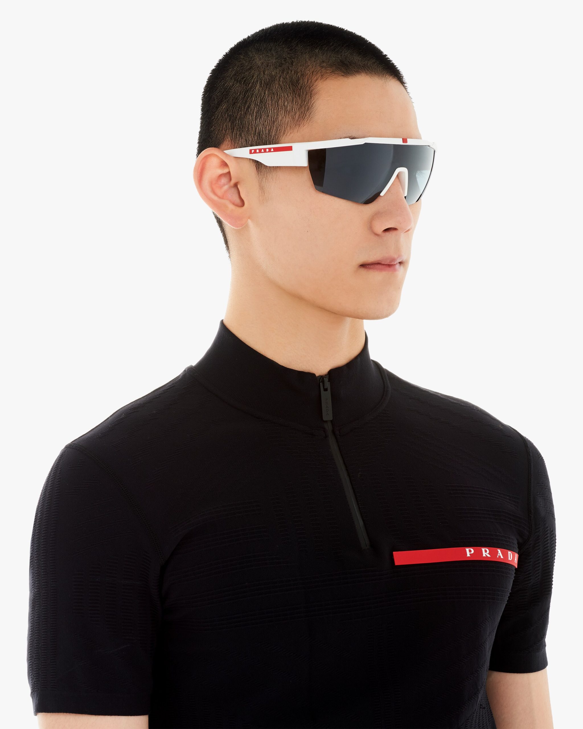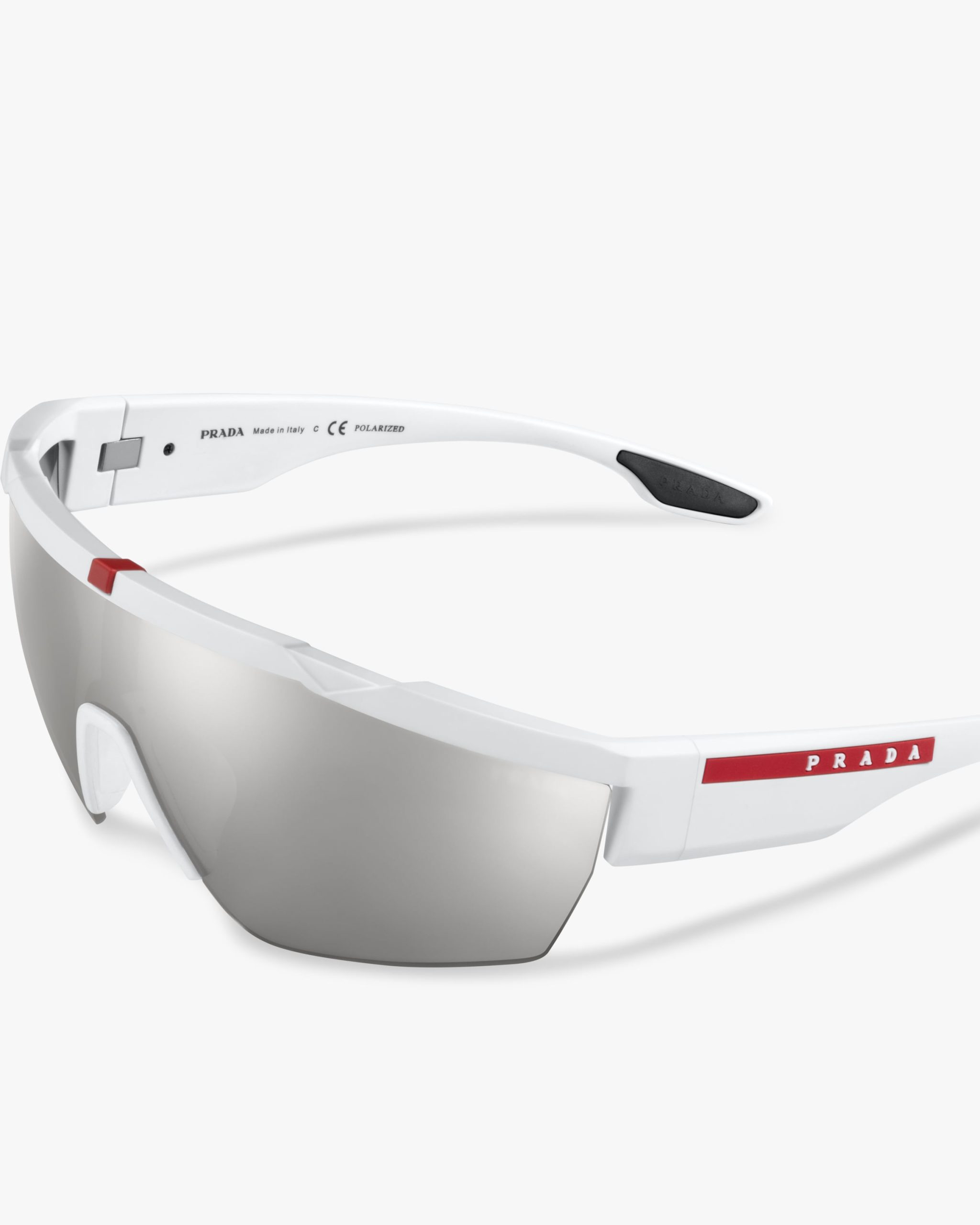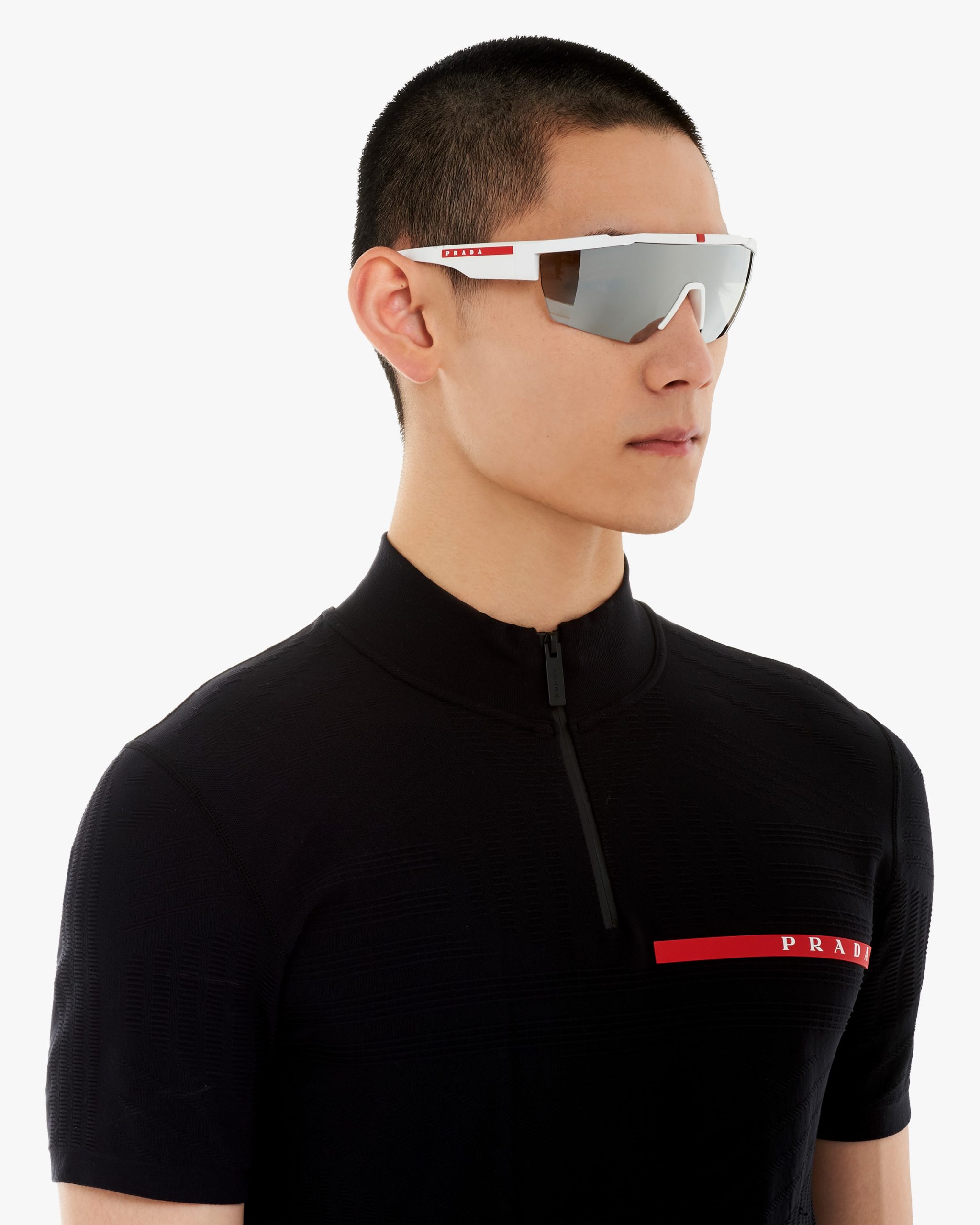 Alternative fit. Wraparound sunglasses with an active style. The ultra-light wraparound frame comes with an innovative system of interchangeable lenses in three different colors: polarized black, mirrored silver, and transparent. Rubberized finishes ensure resistance and a comfortable fit. Prada Linea Rossa logo.