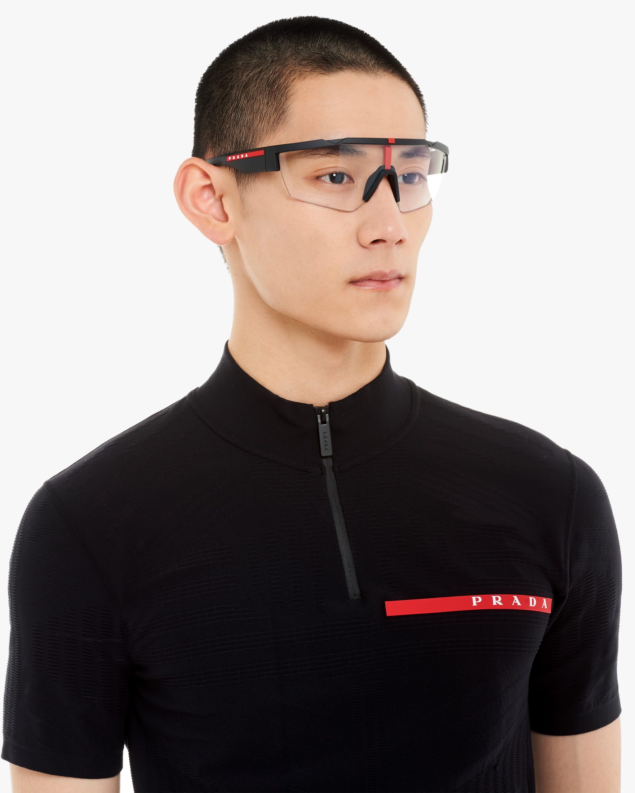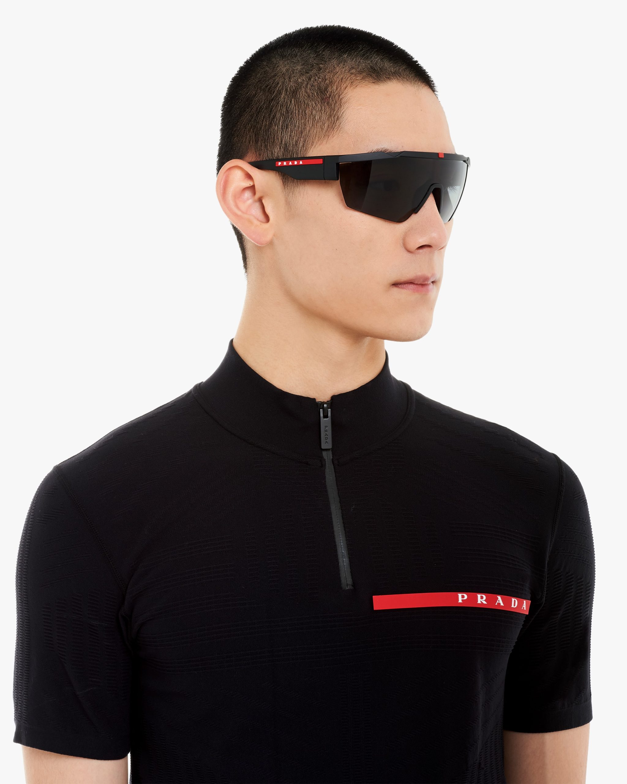 Alternative fit. Wraparound sunglasses with an active style. The ultra-light wraparound frame comes with an innovative system of interchangeable lenses in three different colors: polarized black, bright red, and transparent. Rubberized finishes ensure resistance and a comfortable fit. Prada Linea Rossa logo.