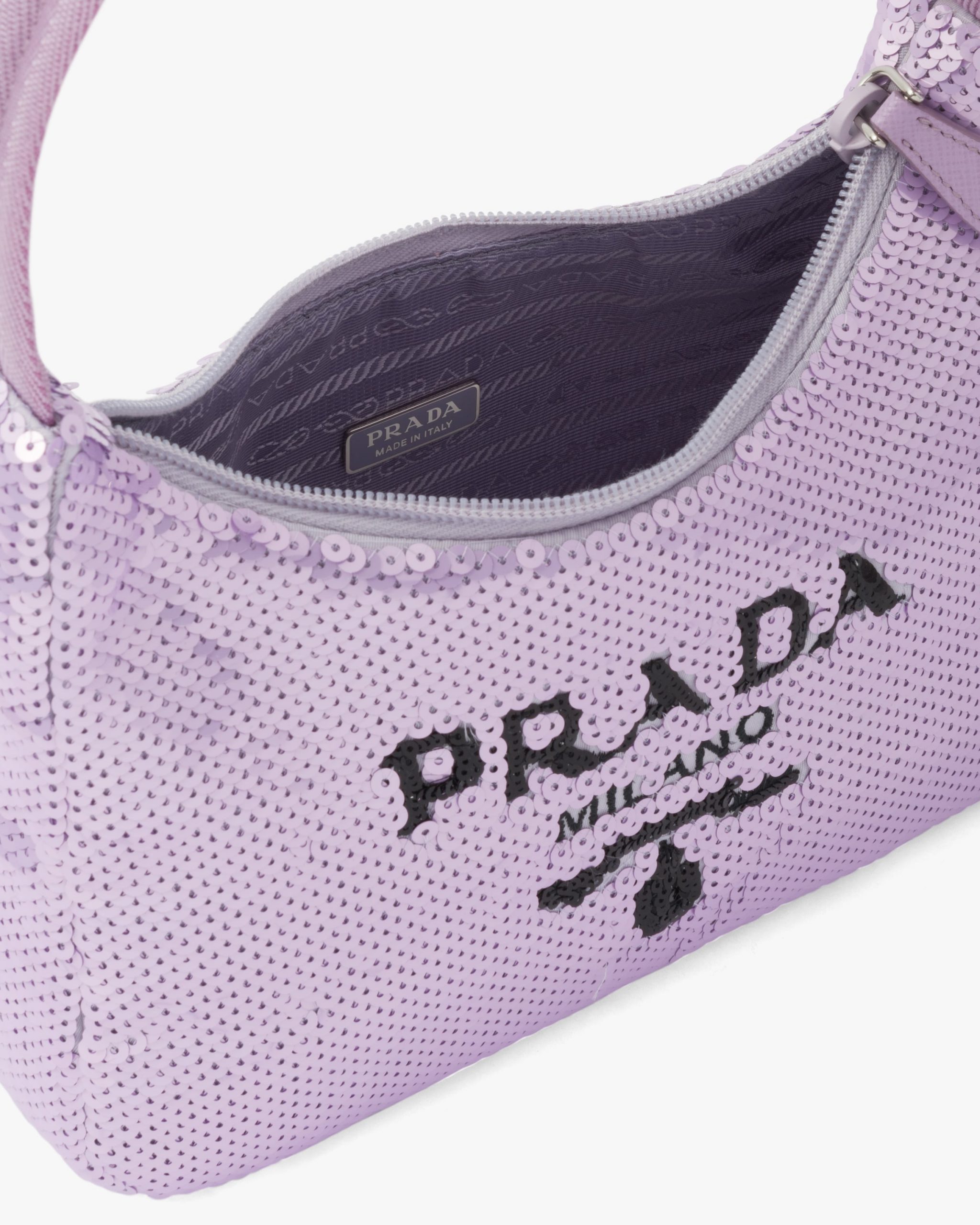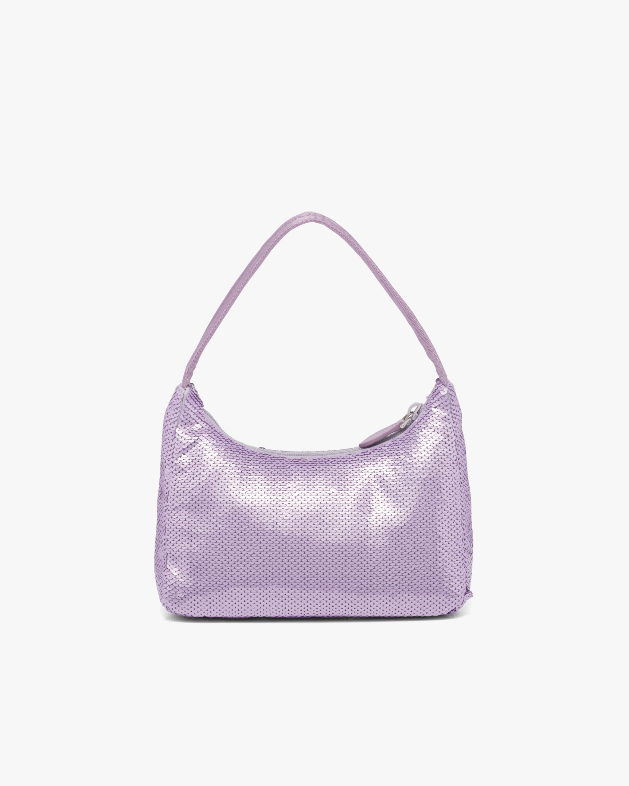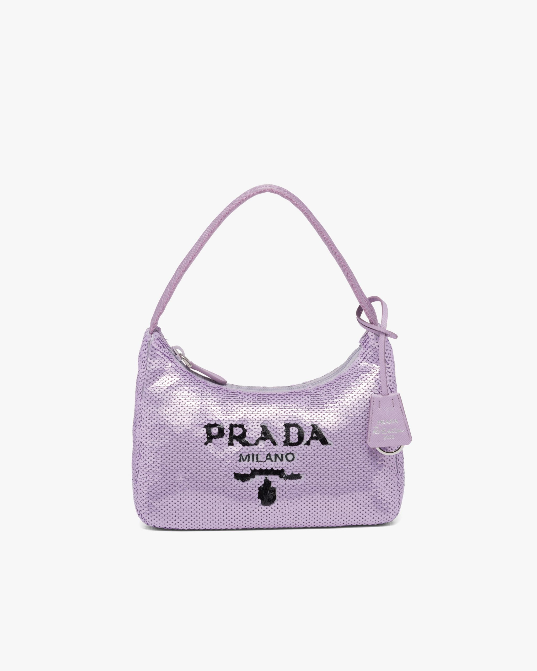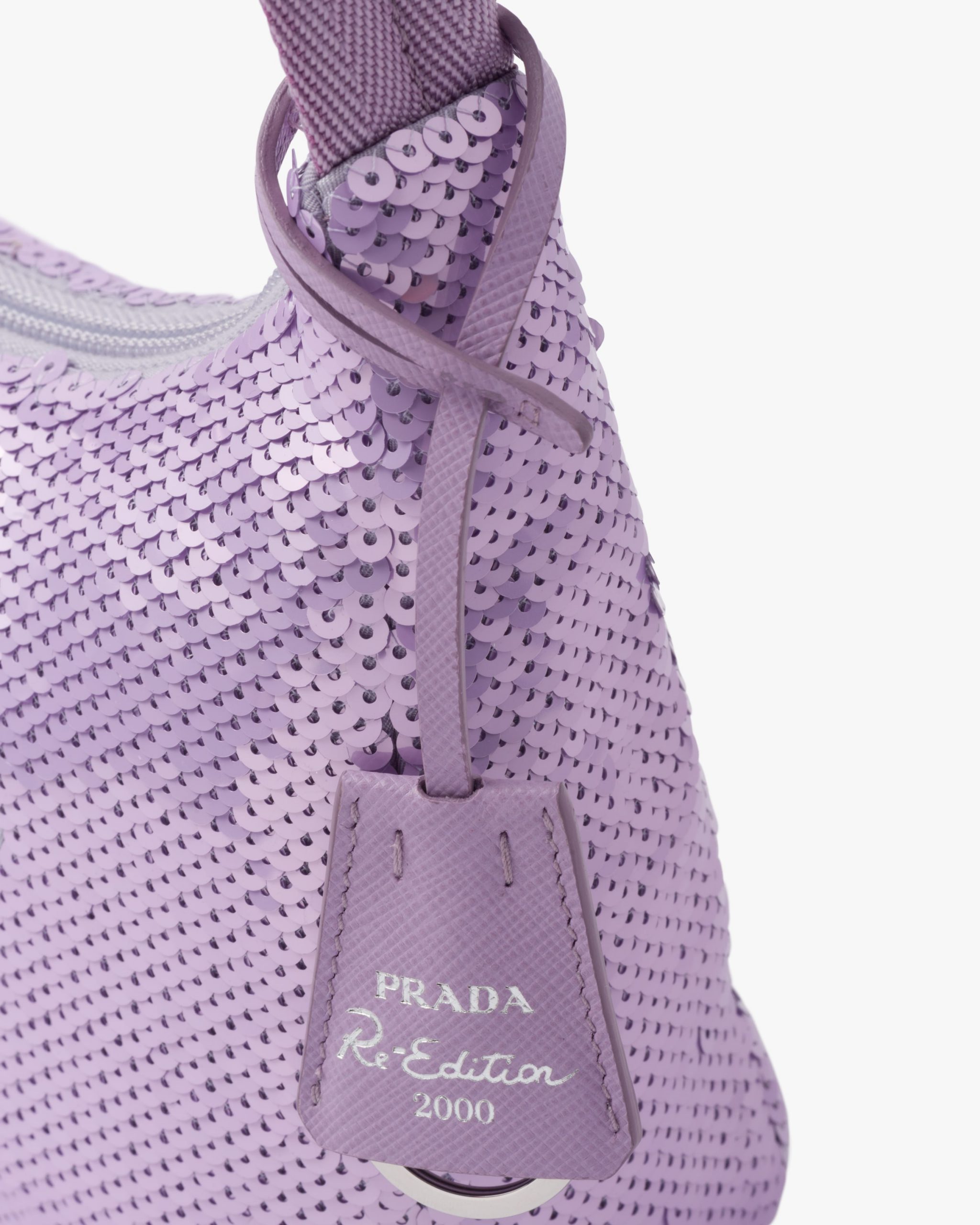 A new interpretation of an iconic Prada style, the Re-Edition 2000 mini-bag is covered with all-over sequins that create a play of light and iridescent glimmers on the surface. The design is made of innovative Re-Nylon, produced from recycled, purified plastic materials collectsed in the ocean, fishing nets, and textile fibers. The accessory with zipper closure and woven tape handle is enhanced with the distinctive enameled metal triangle logo.