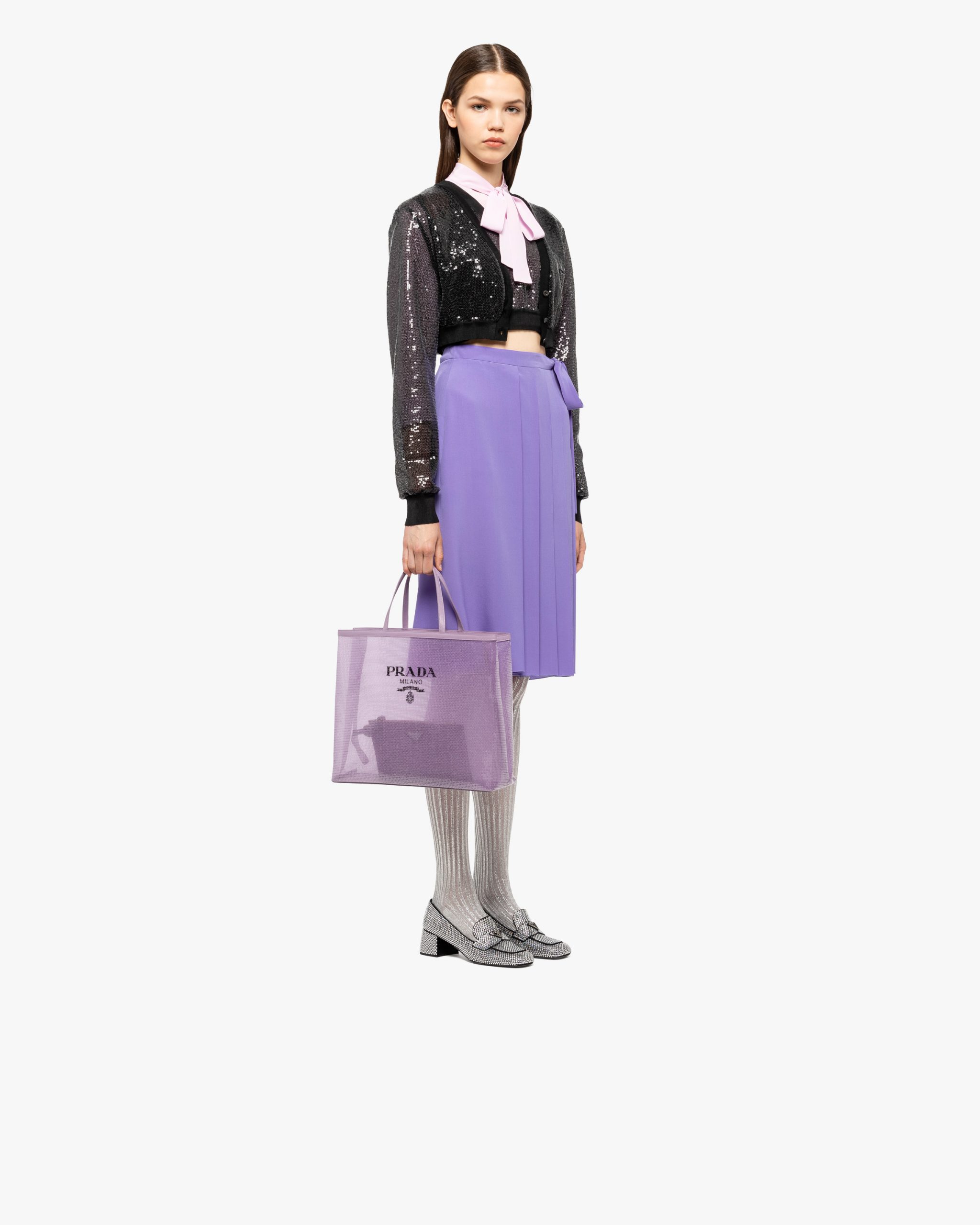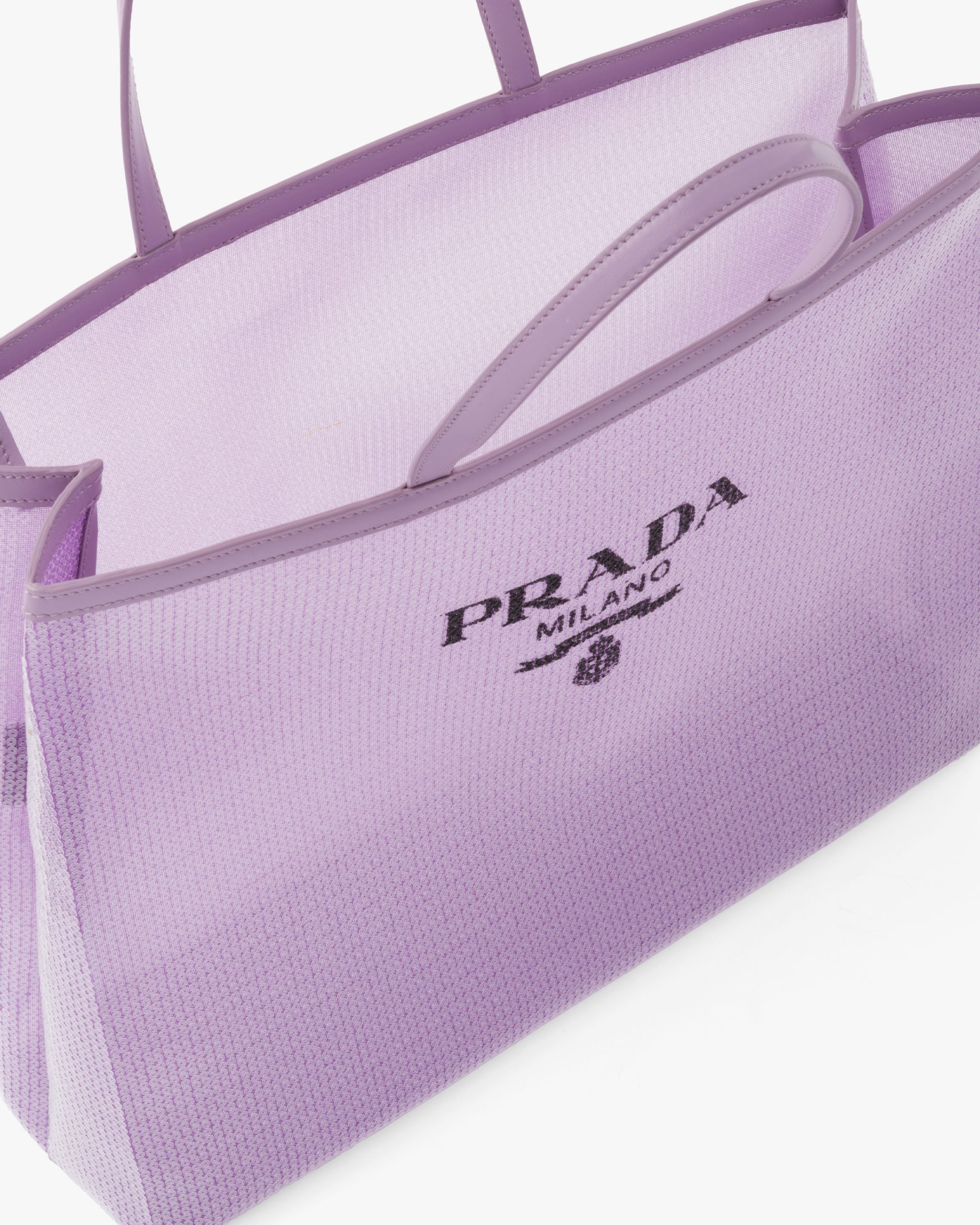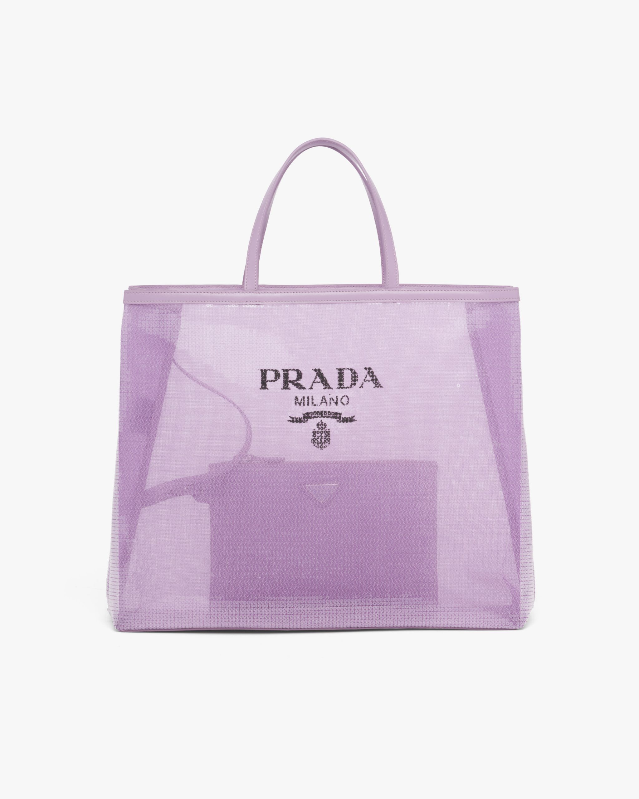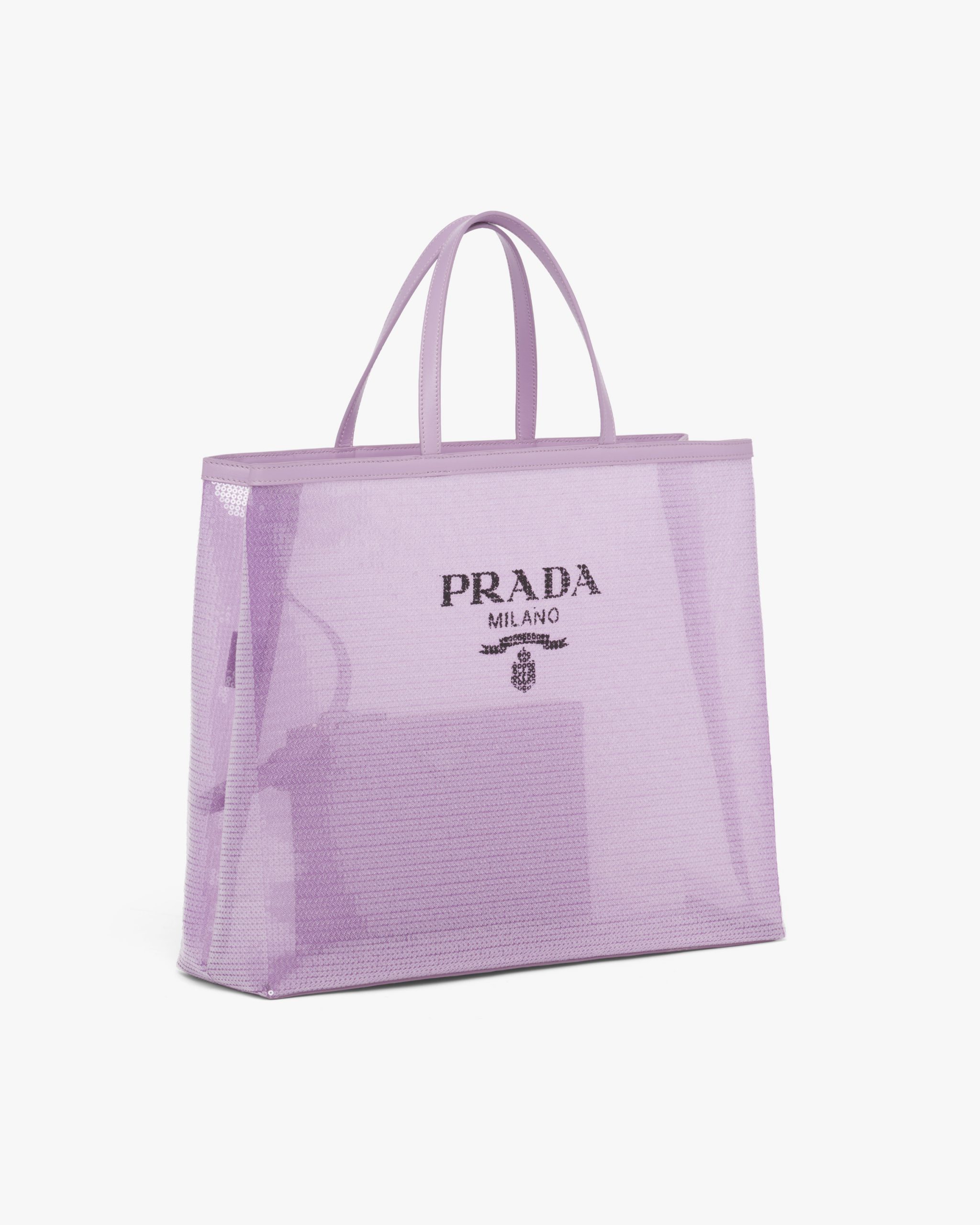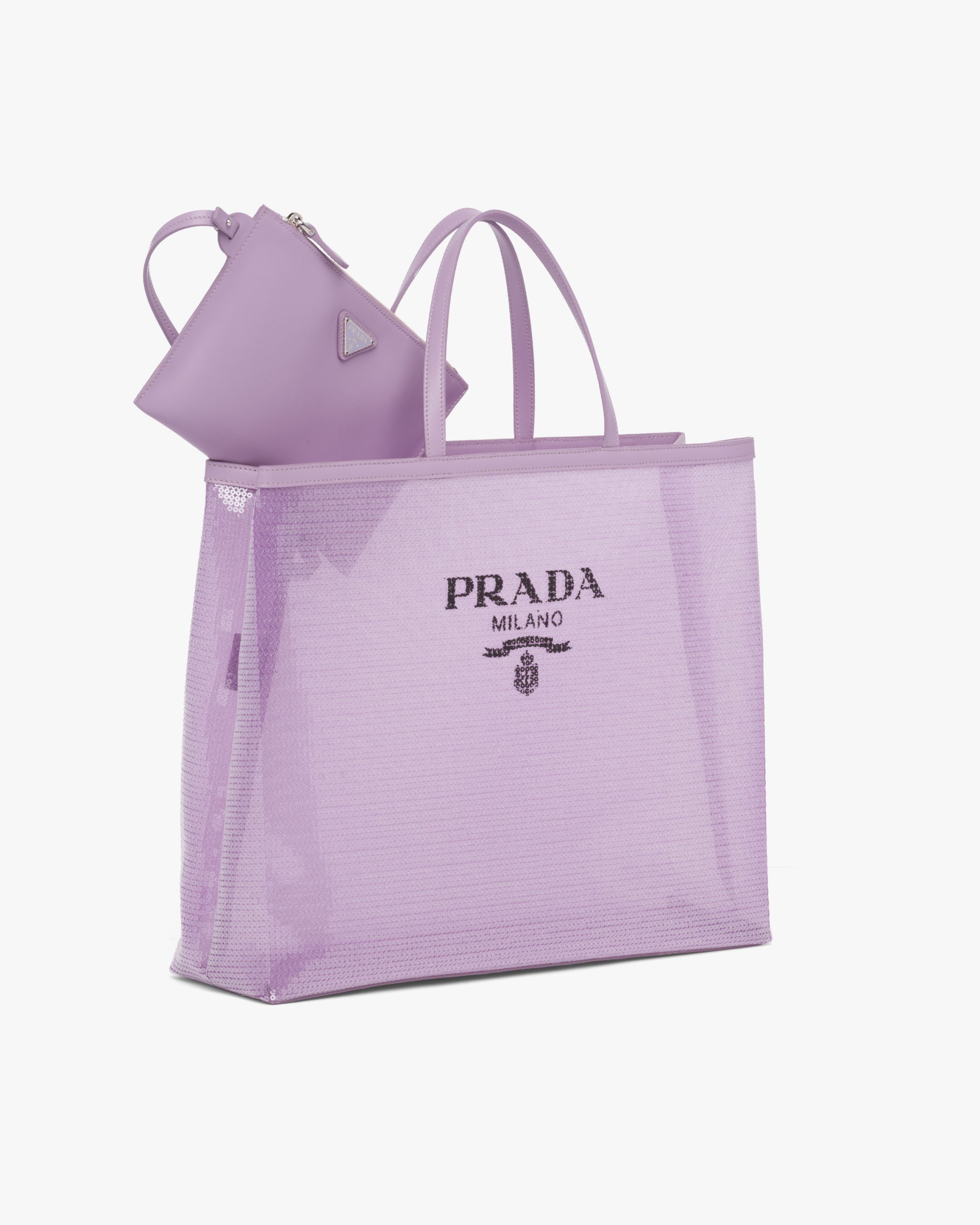 A contemporary soul and precious accents characterize this tote bag entirely covered with sequins and embellished with the lettering logo printed on the front. Provided with a double handle and defined by its sleek design, the accessory with leather trim has a removable pouch inside.