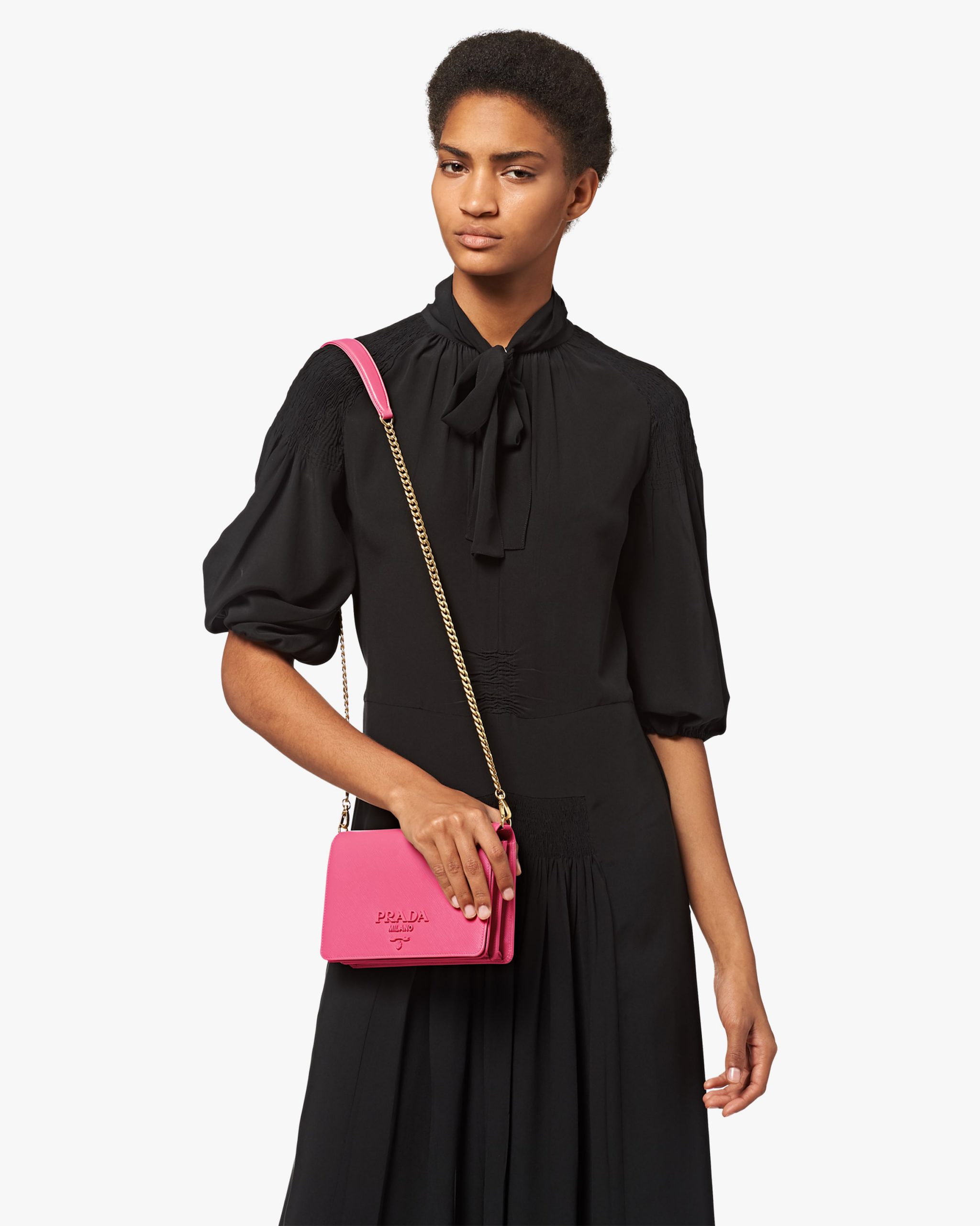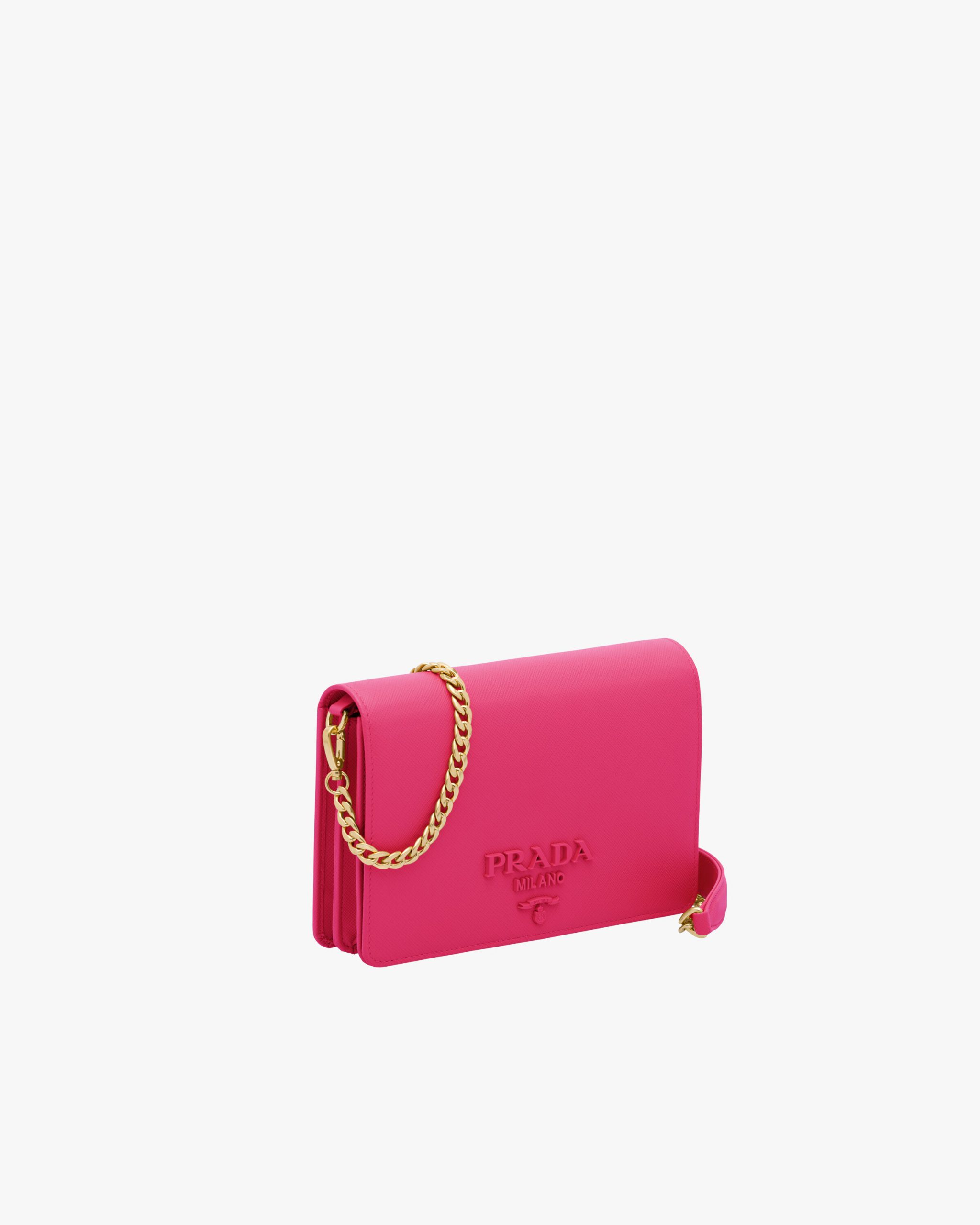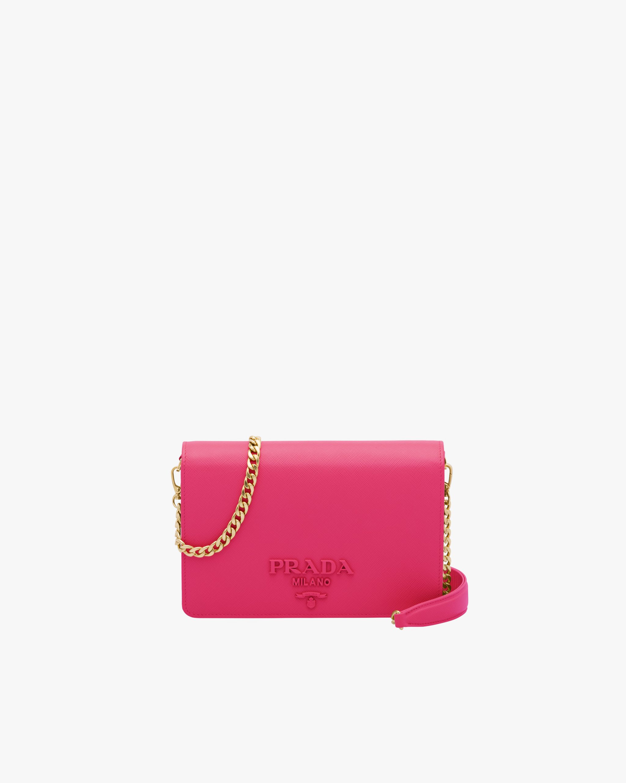 This shoulder bag in iconic Saffiano leather is defined by the metal lettering logo with tone-on-tone finish. It is completed with a detachable metal chain shoulder strap.