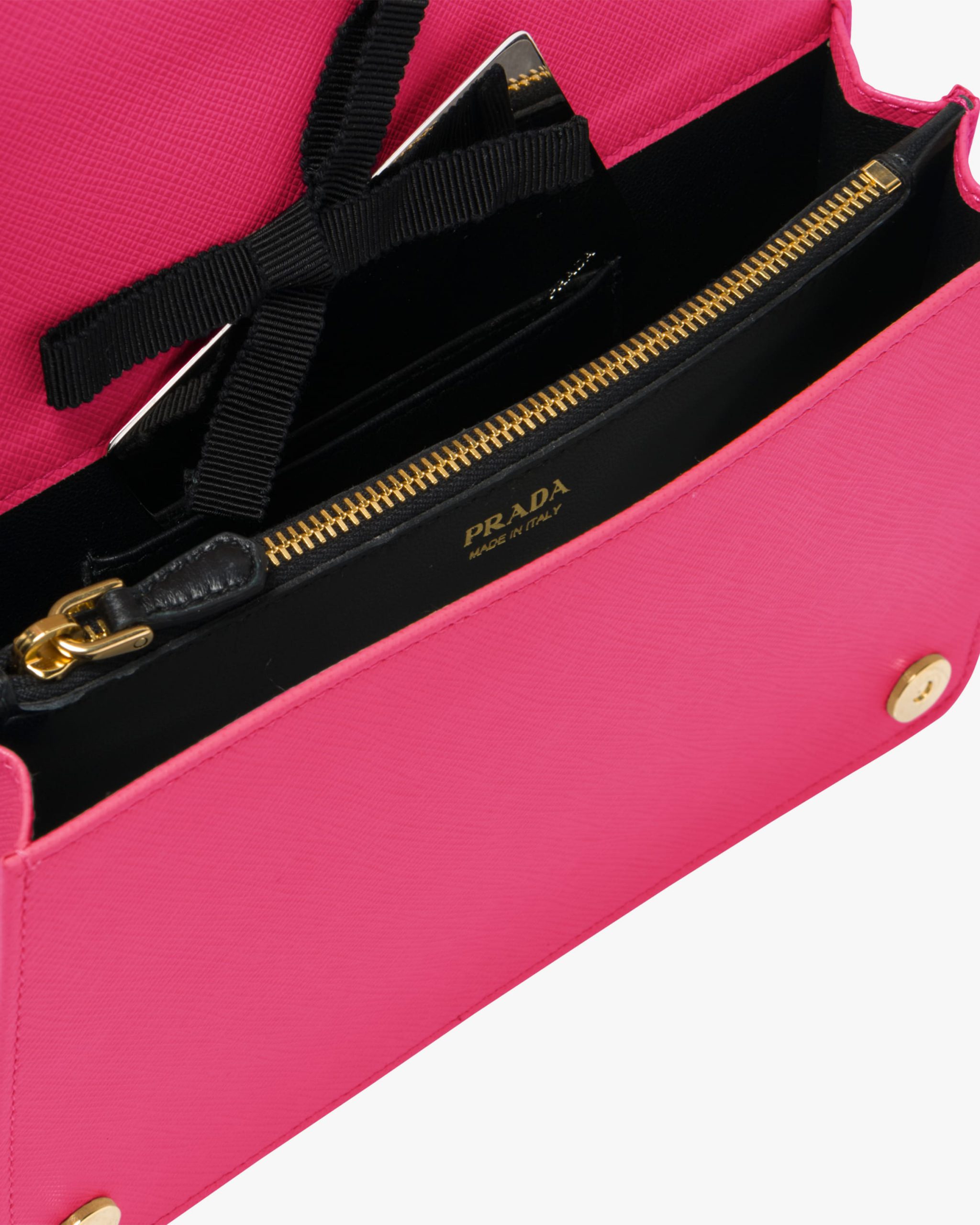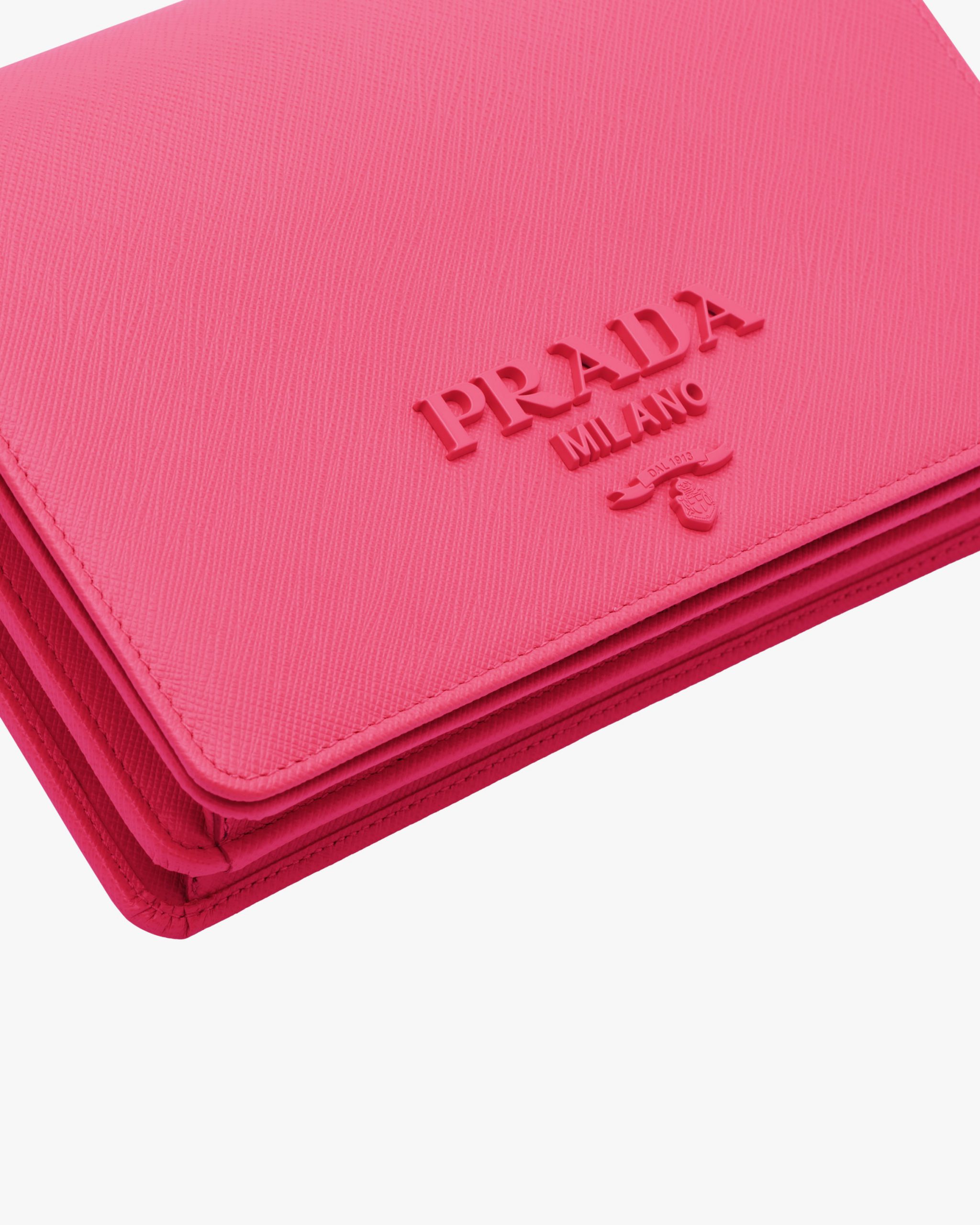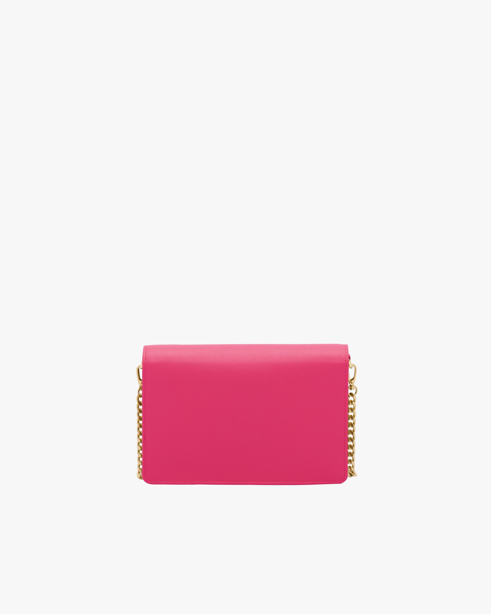 This shoulder bag in iconic Saffiano leather is defined by the metal lettering logo with tone-on-tone finish. It is completed with a detachable metal chain shoulder strap.