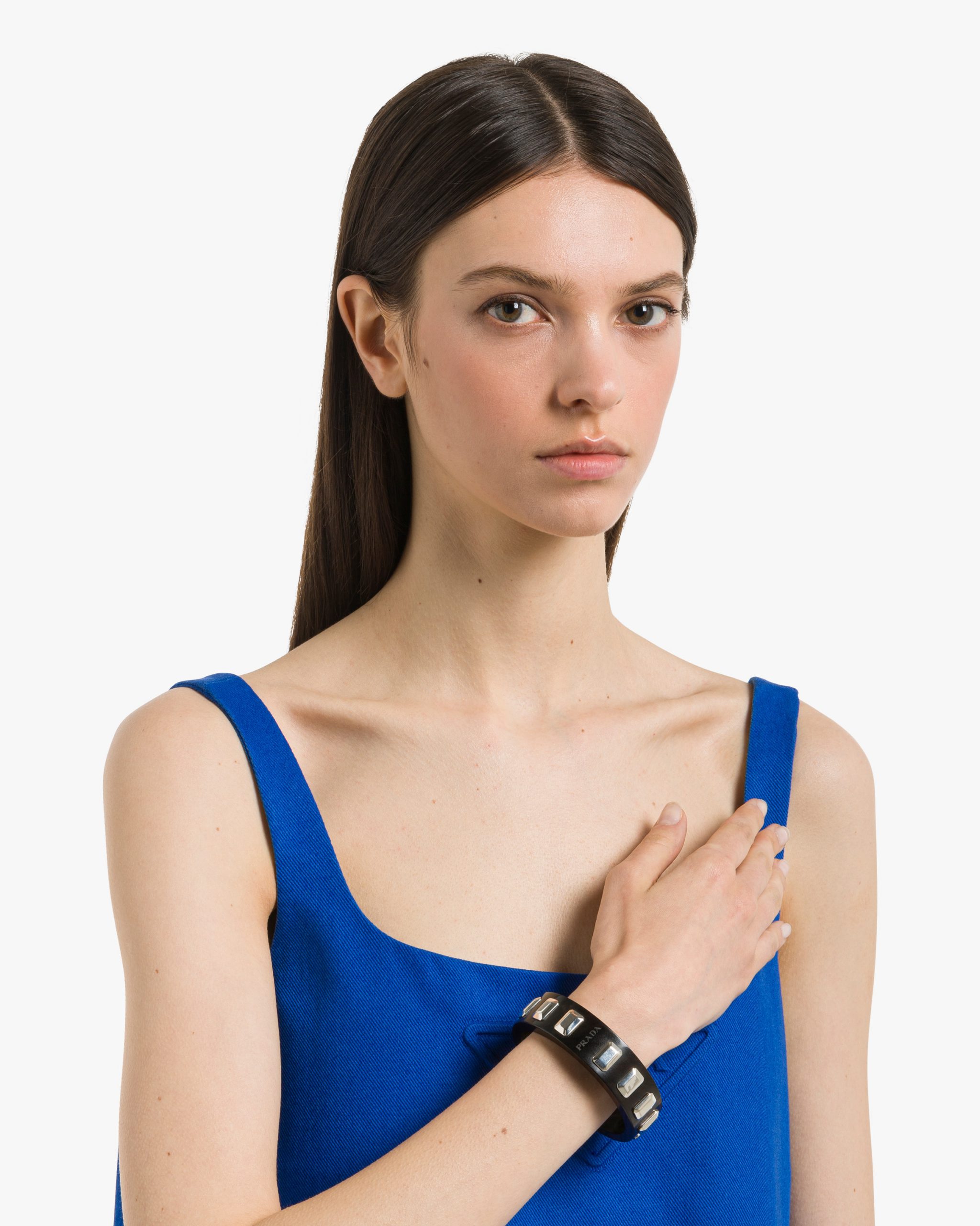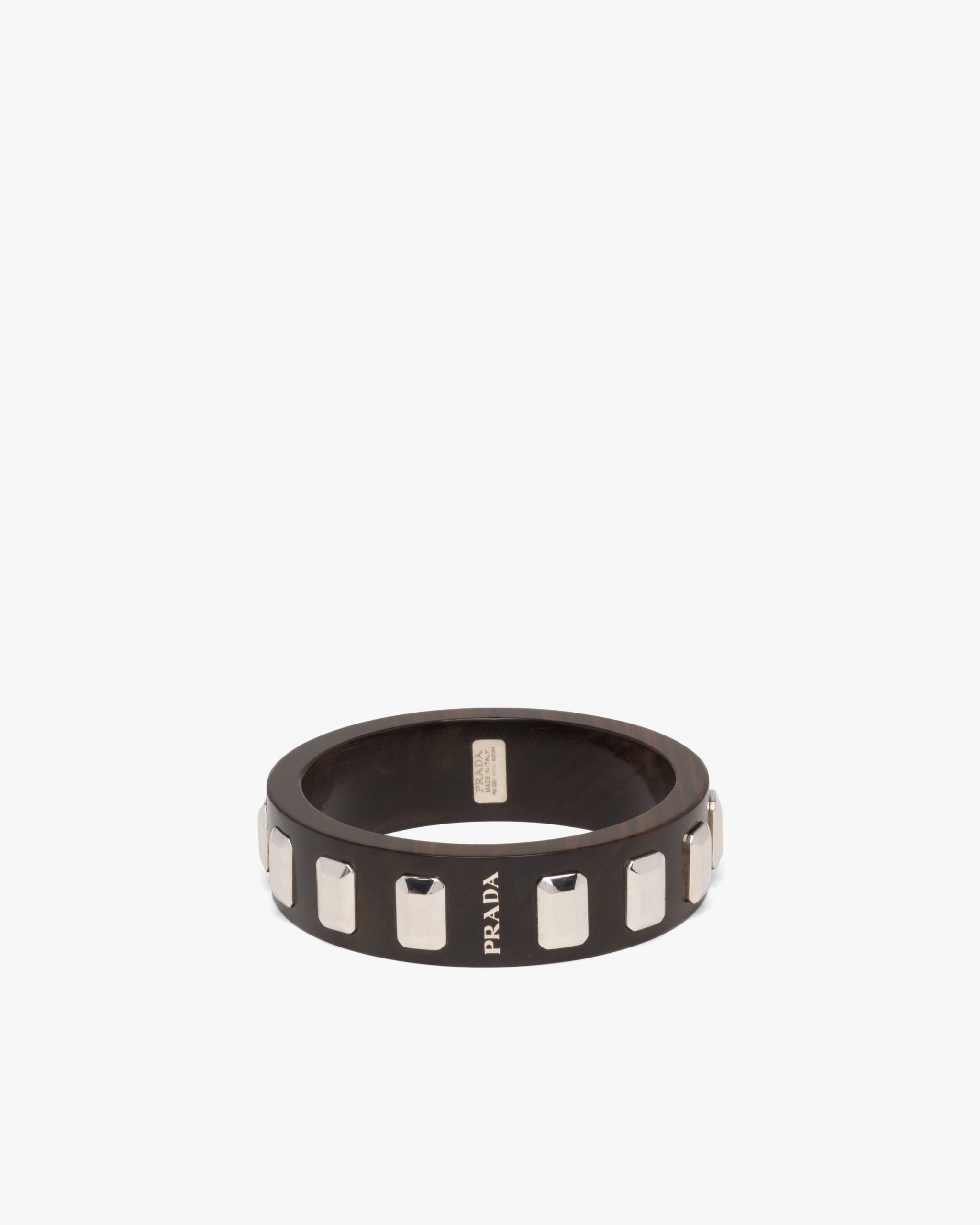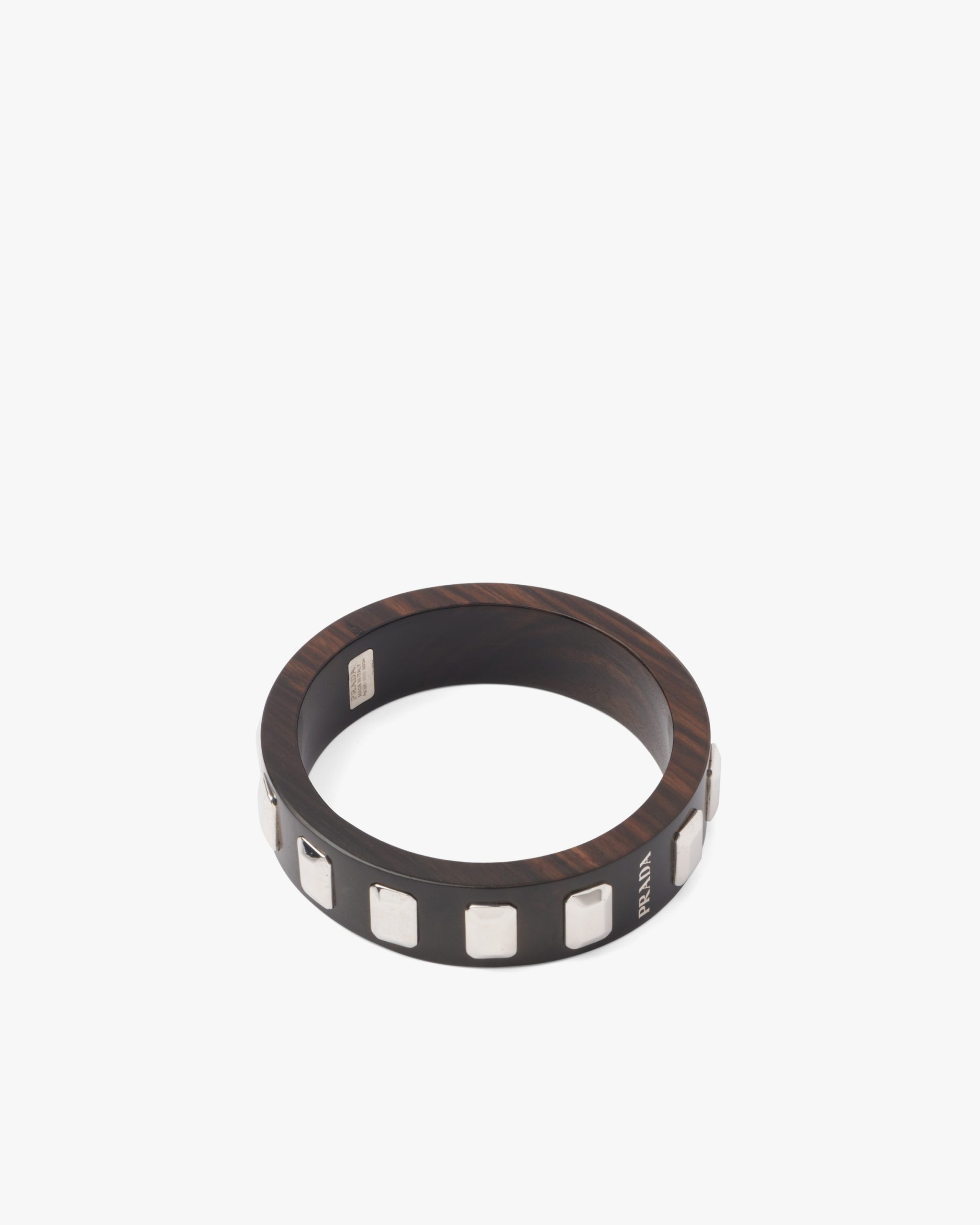 Faceted crystals illuminate this cuff bracelet made of wood and silver, creating a precious play of different materials and textures. The bracelet with sophisticated, modern allure is decorated with the lettering logo in a contrasting color.