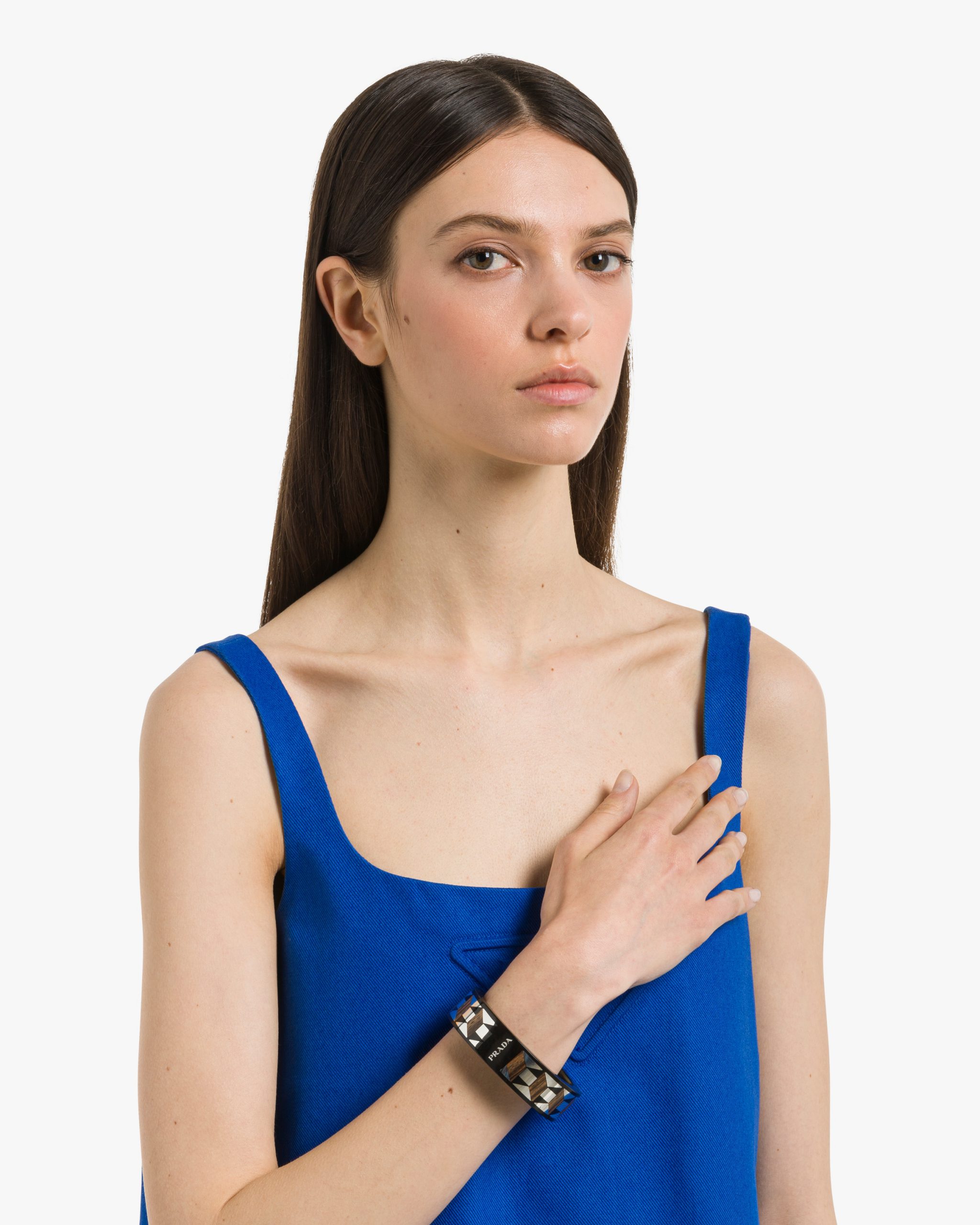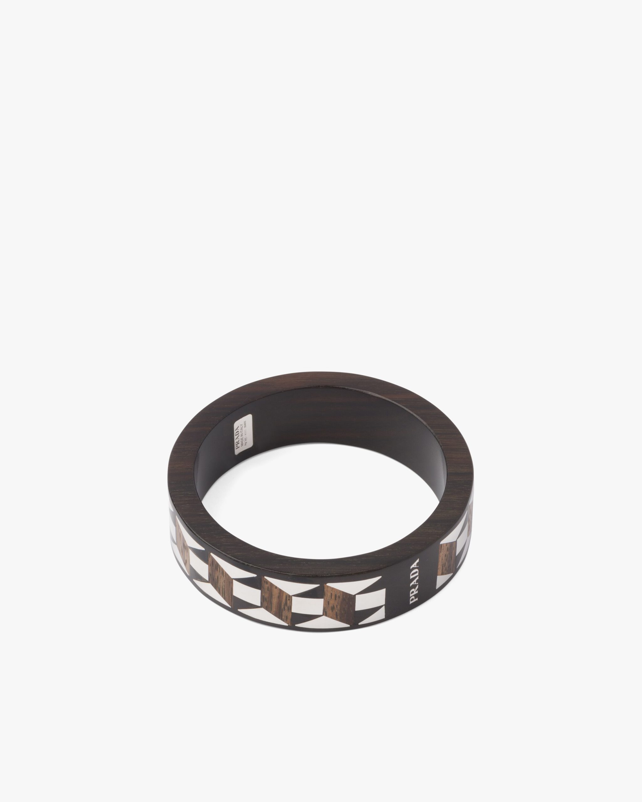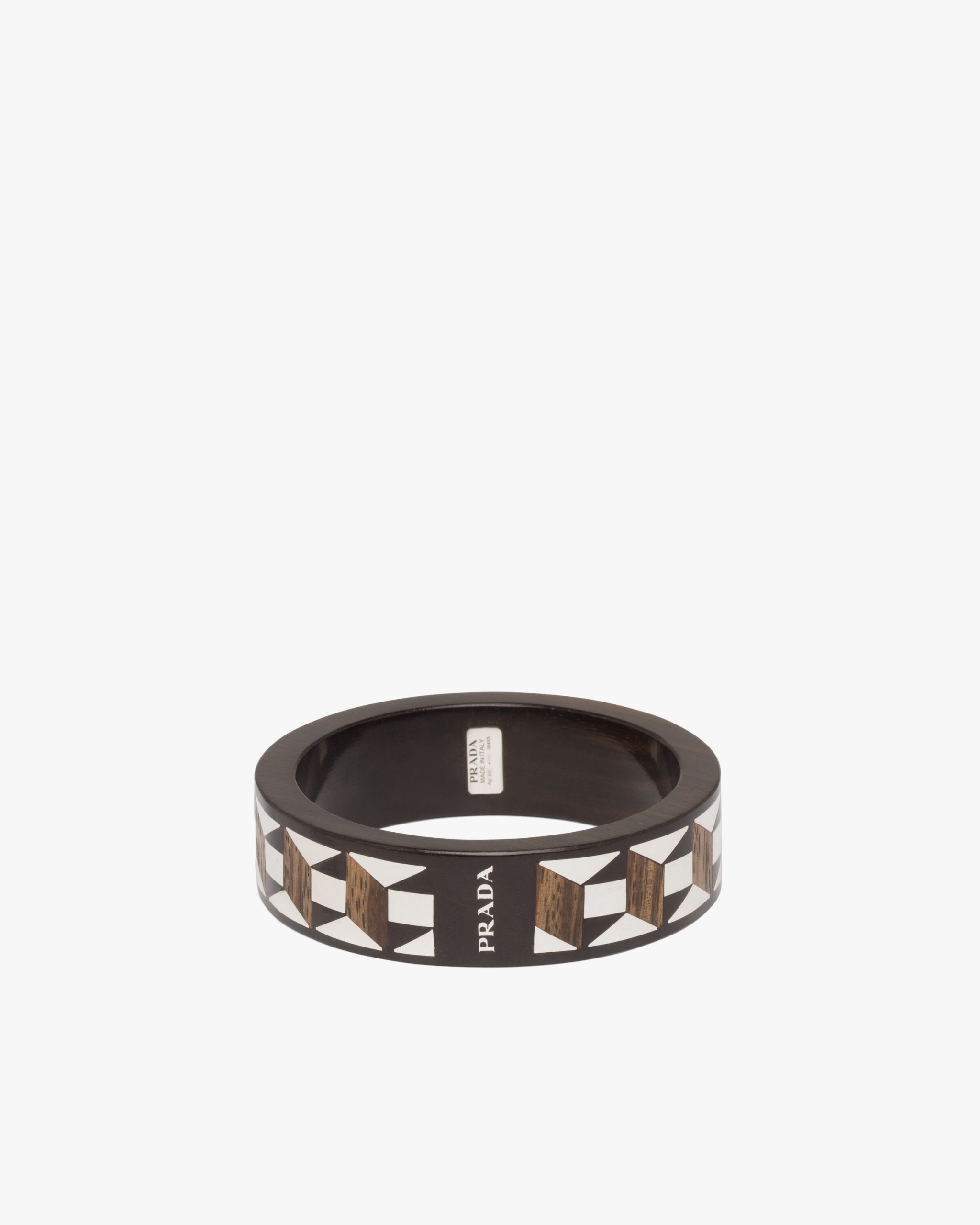 Geometric shapes and precious contrasts in materials and textures animate this cuff bracelet made of wood and silver. The bracelet with sophisticated, modern allure is decorated with the lettering logo in a contrasting color.