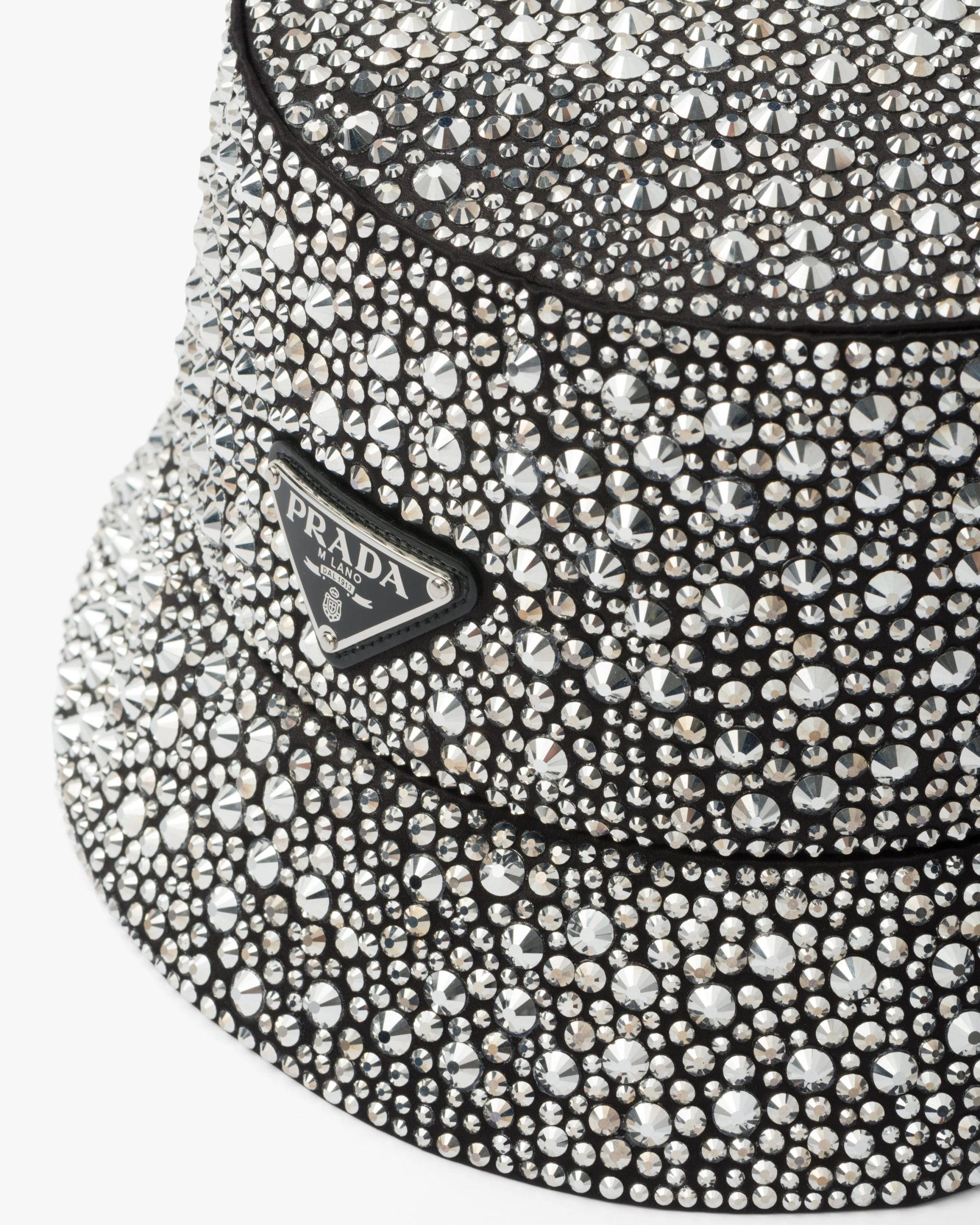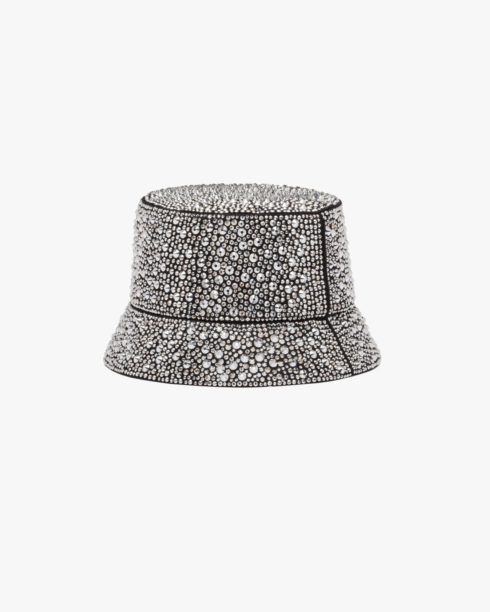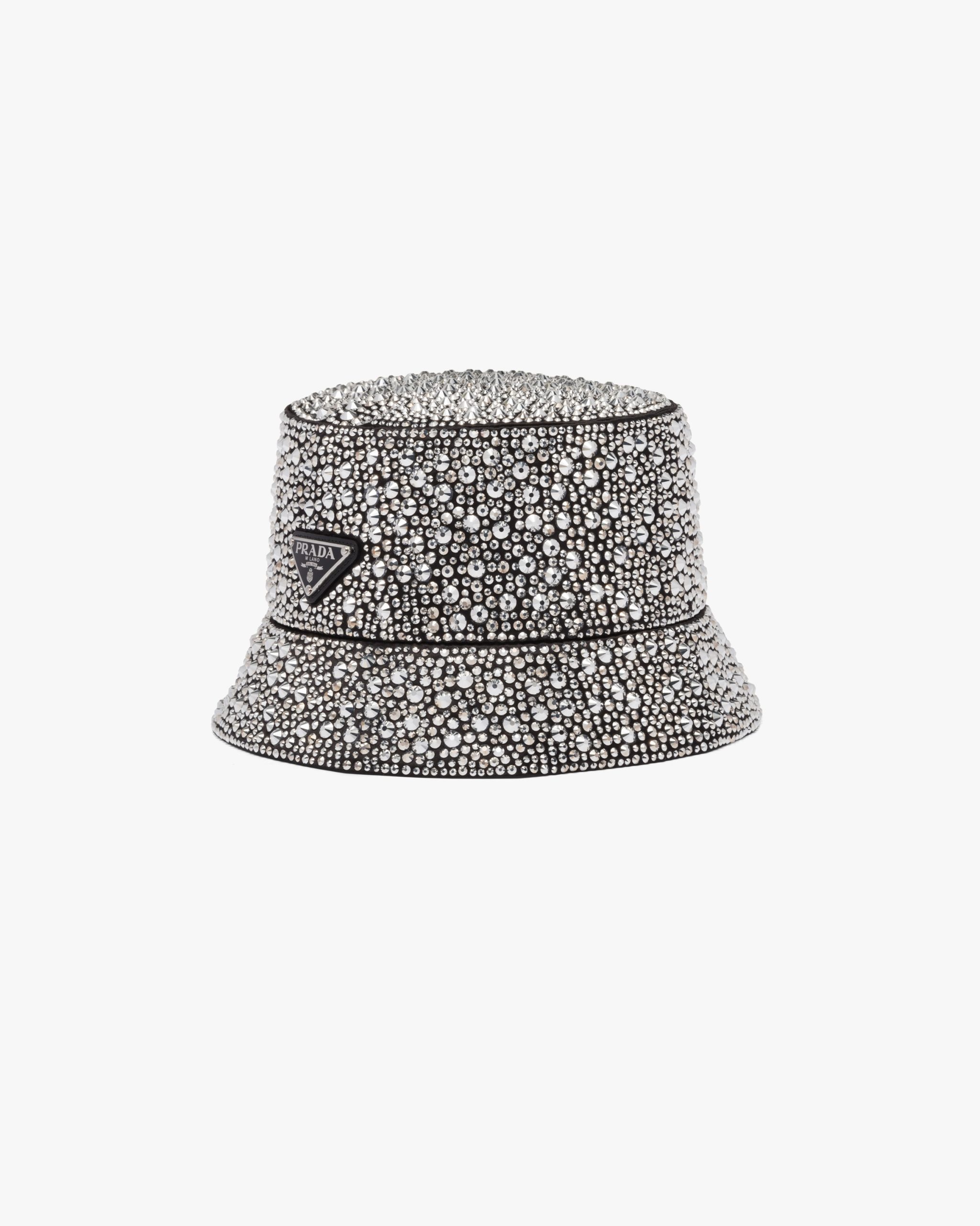 The bucket hat, an iconic accessory of Prada collectsions inspired by the streetwear world, is reimagined in a luxurious version, covered all over with crystals that create plays of light and iridescent glimmers on the surface. The brand’s emblematic enameled metal triangle logo completes the design.