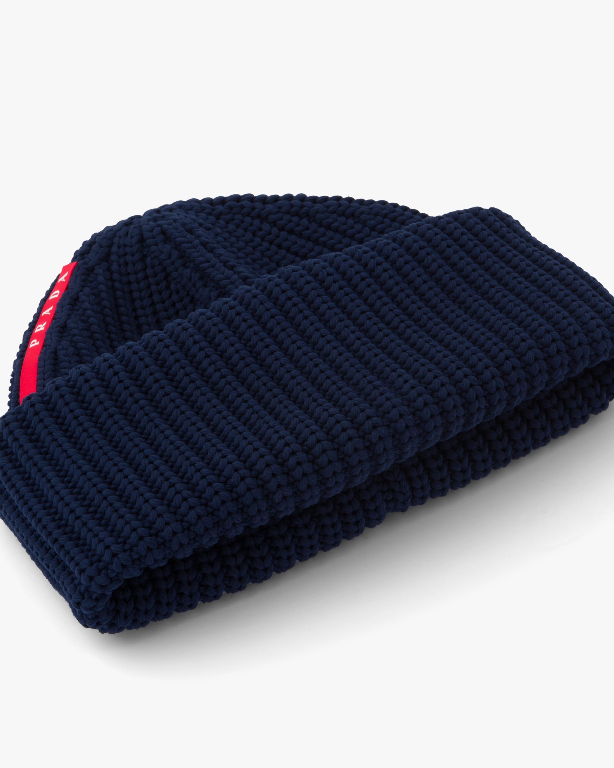 The emblematic Prada Linea Rossa logo adds a splash of color on this beanie made of Tec Rec Nylon, a technical knit made from recycled yarns and with a ribbed knit motif.