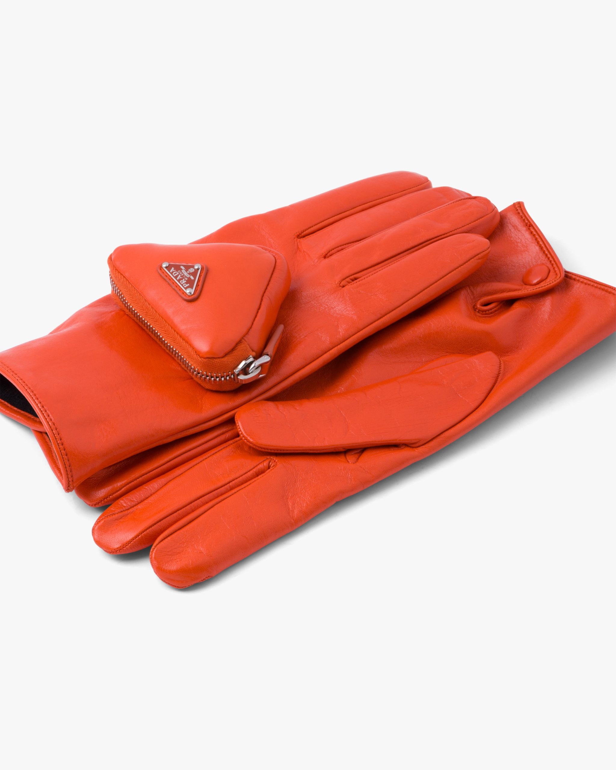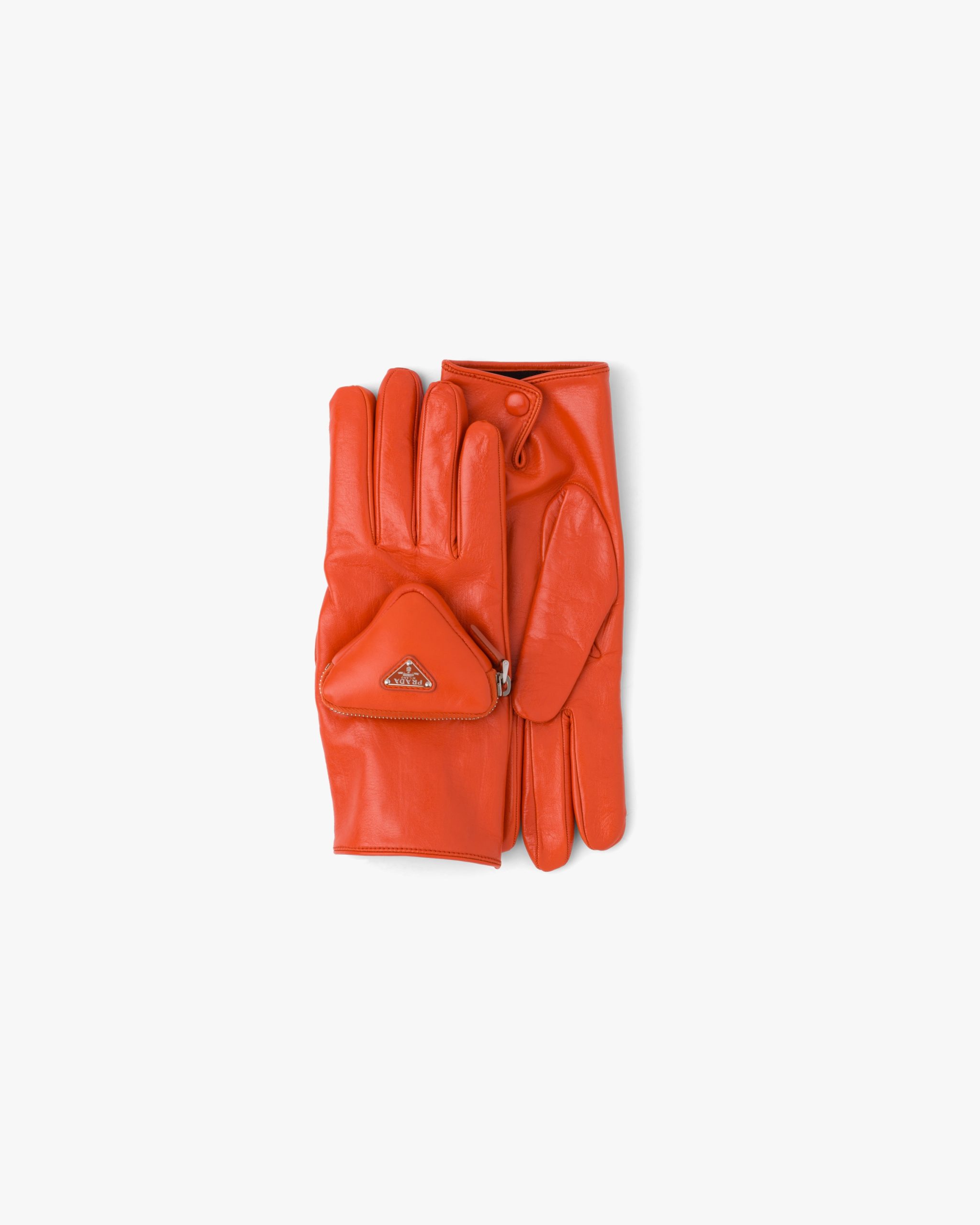 Made of glossy nappa leather with a slightly irregular surface similar to the leather used in the seventies, these gloves come in a series of lively shades and dark hues with a classic look. The design is made modern by the small zipper pocket and enamel triangle that decorates one of the two gloves, a recurrent element in garments and accessories of the Men’s Fall Winter 2021 collectsion.