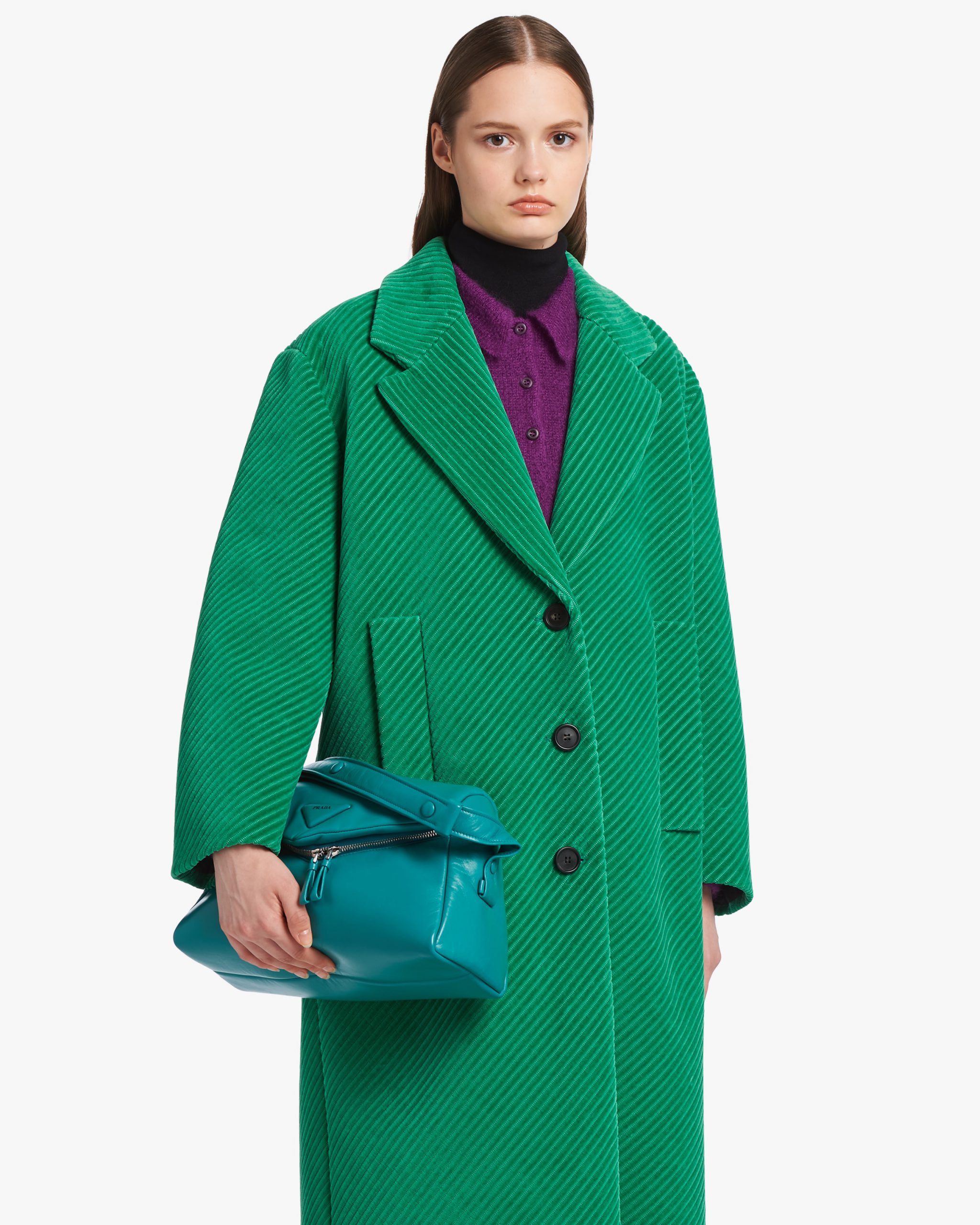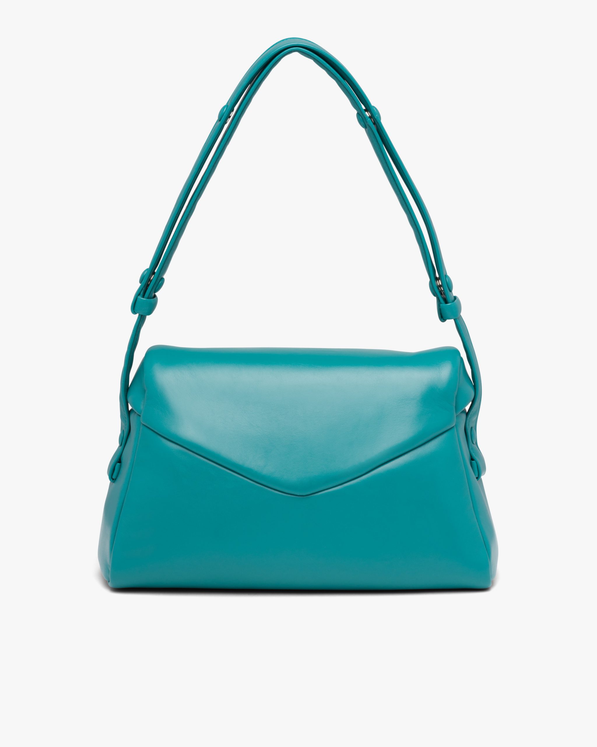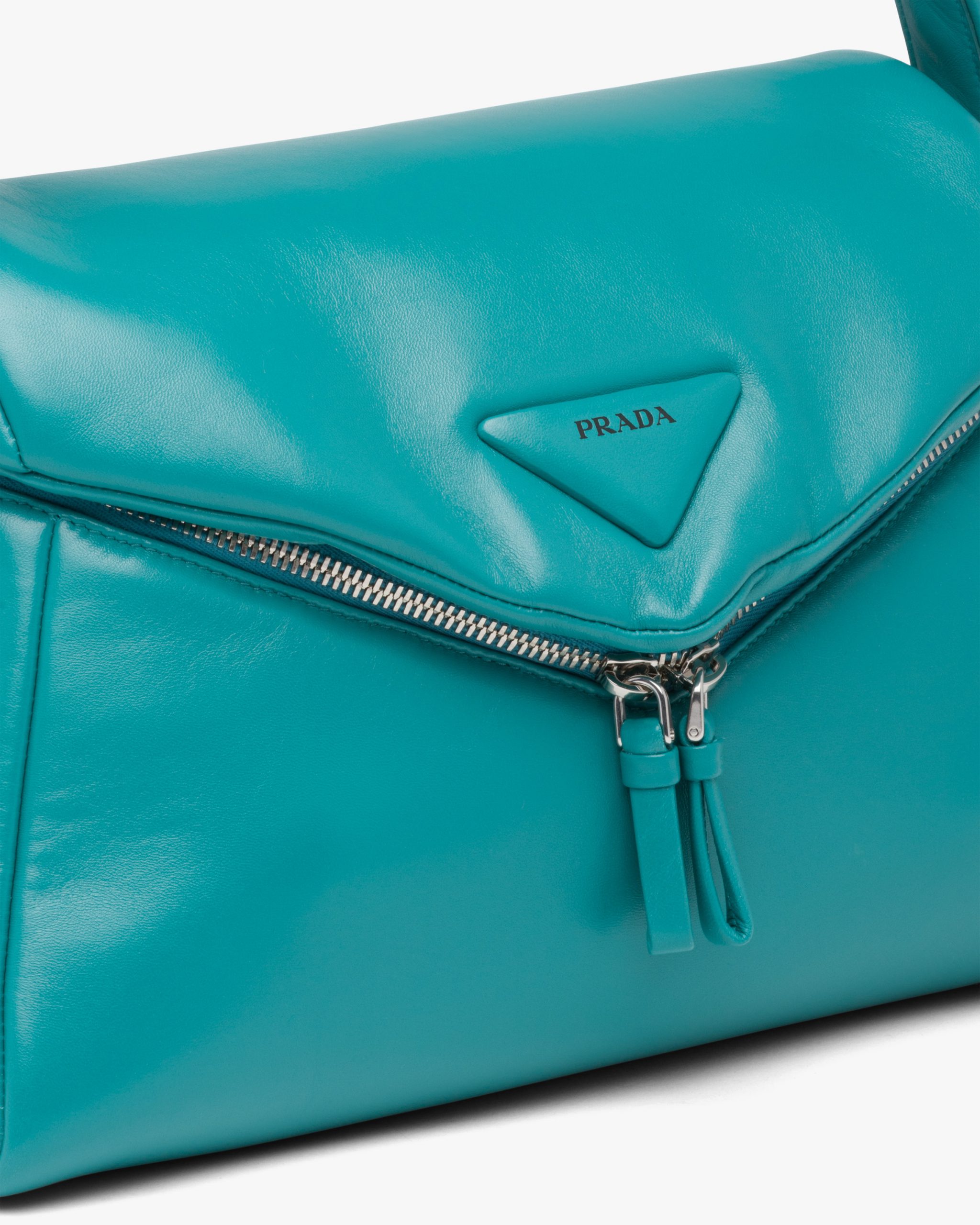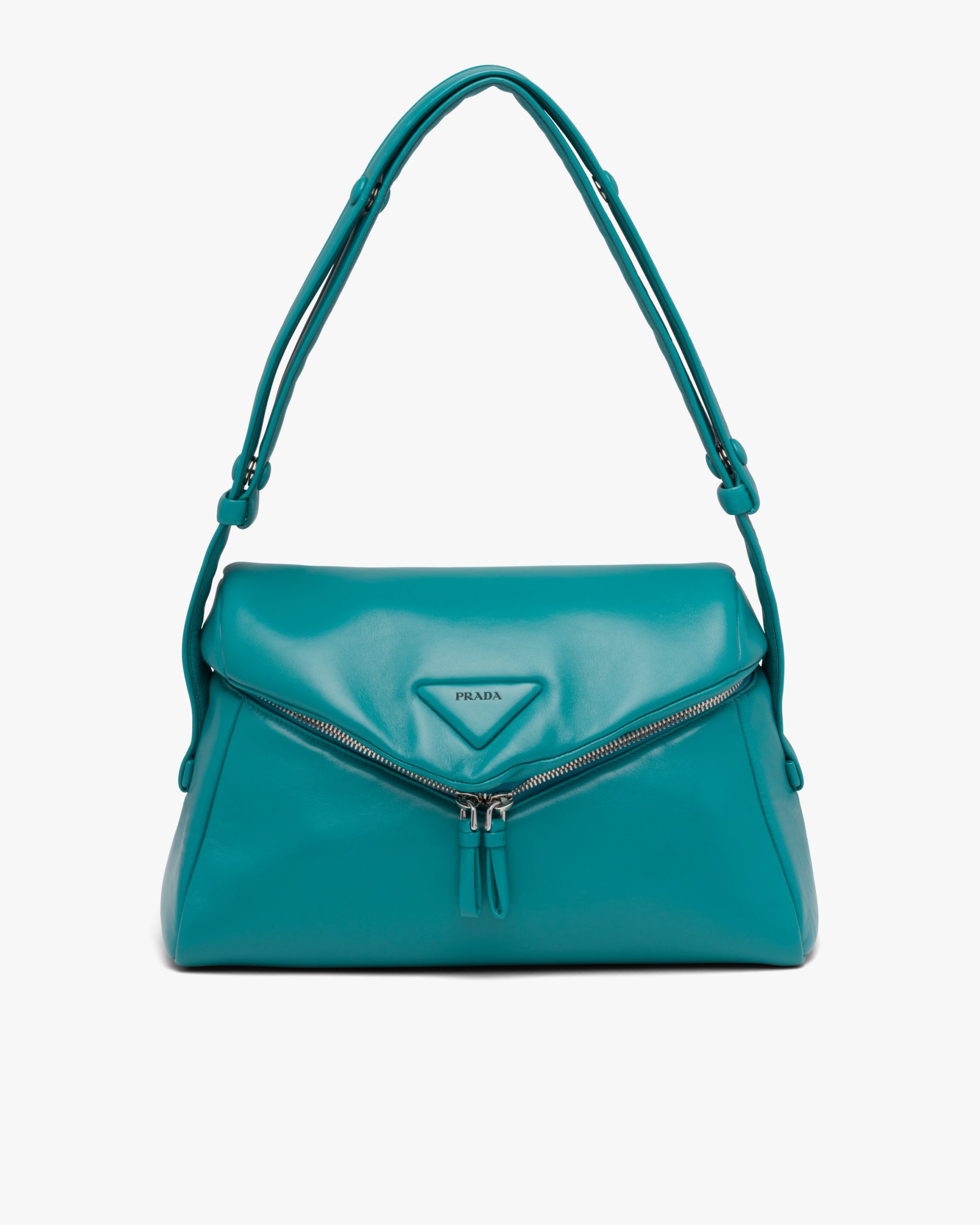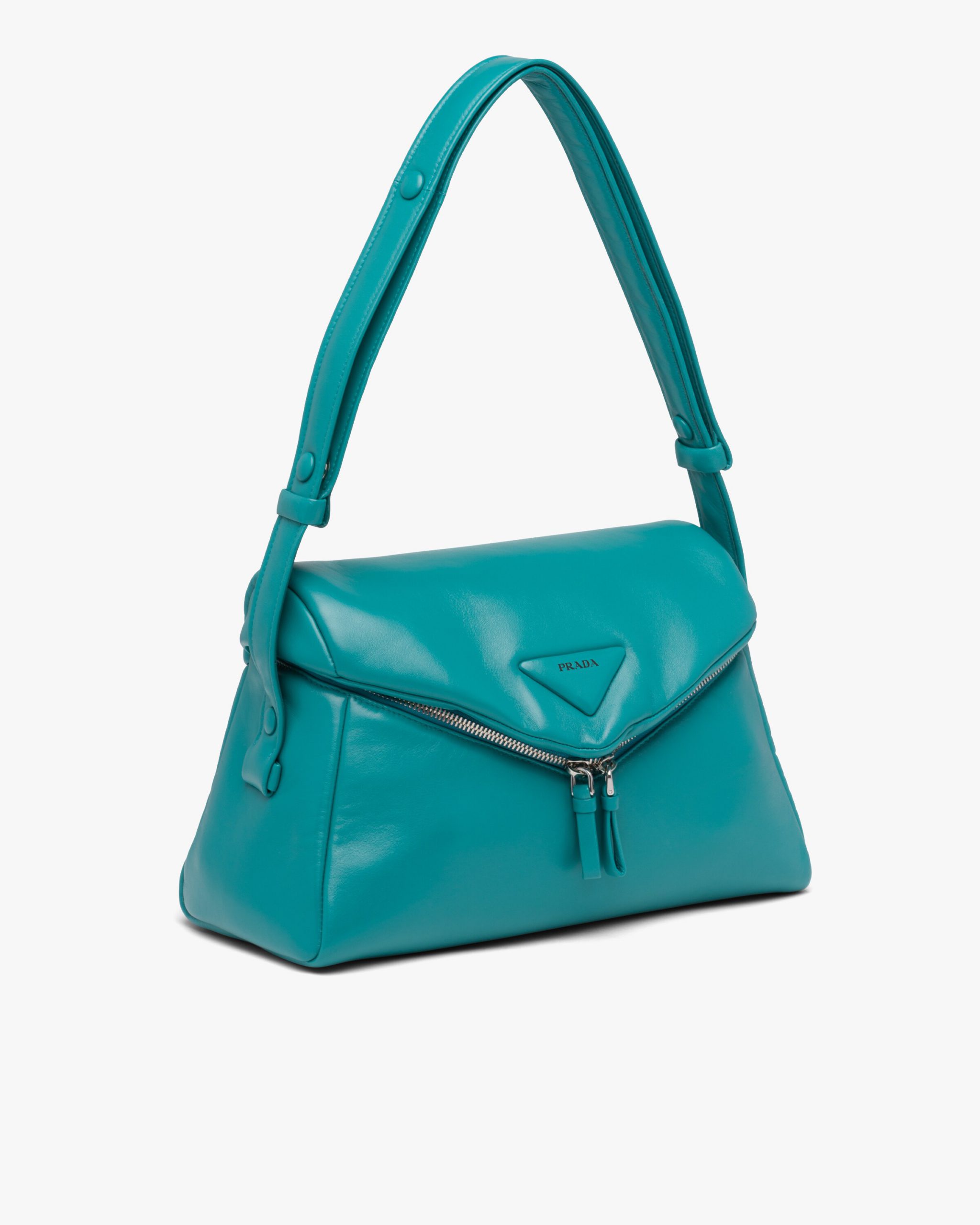 This soft nappa leather shoulder bag with sleek, minimalist lines has a contemporary attitude and a special reverse stitch construction. A study of the triangle inspires new geometric details and unique interpretations of the historic Prada logo. The iconic shape is reworked in the wide flap of this slightly padded accessory, completed by an adjustable leather handle that lets it be worn in different ways.