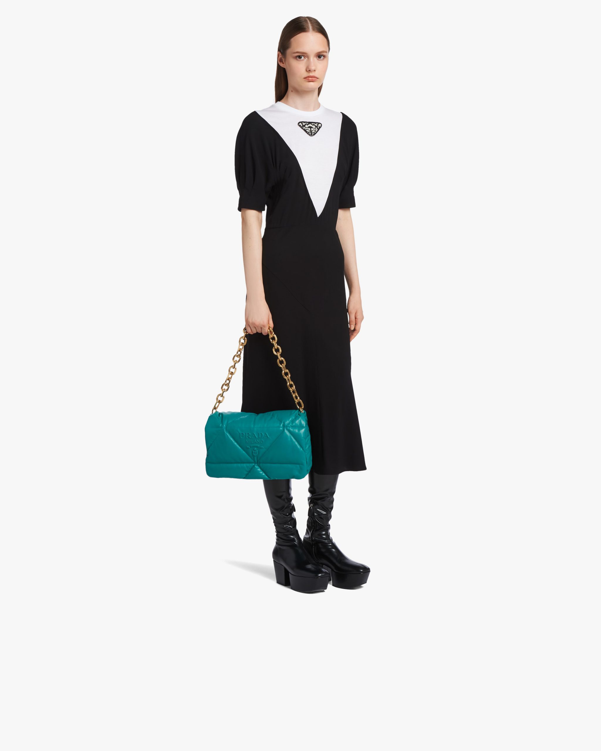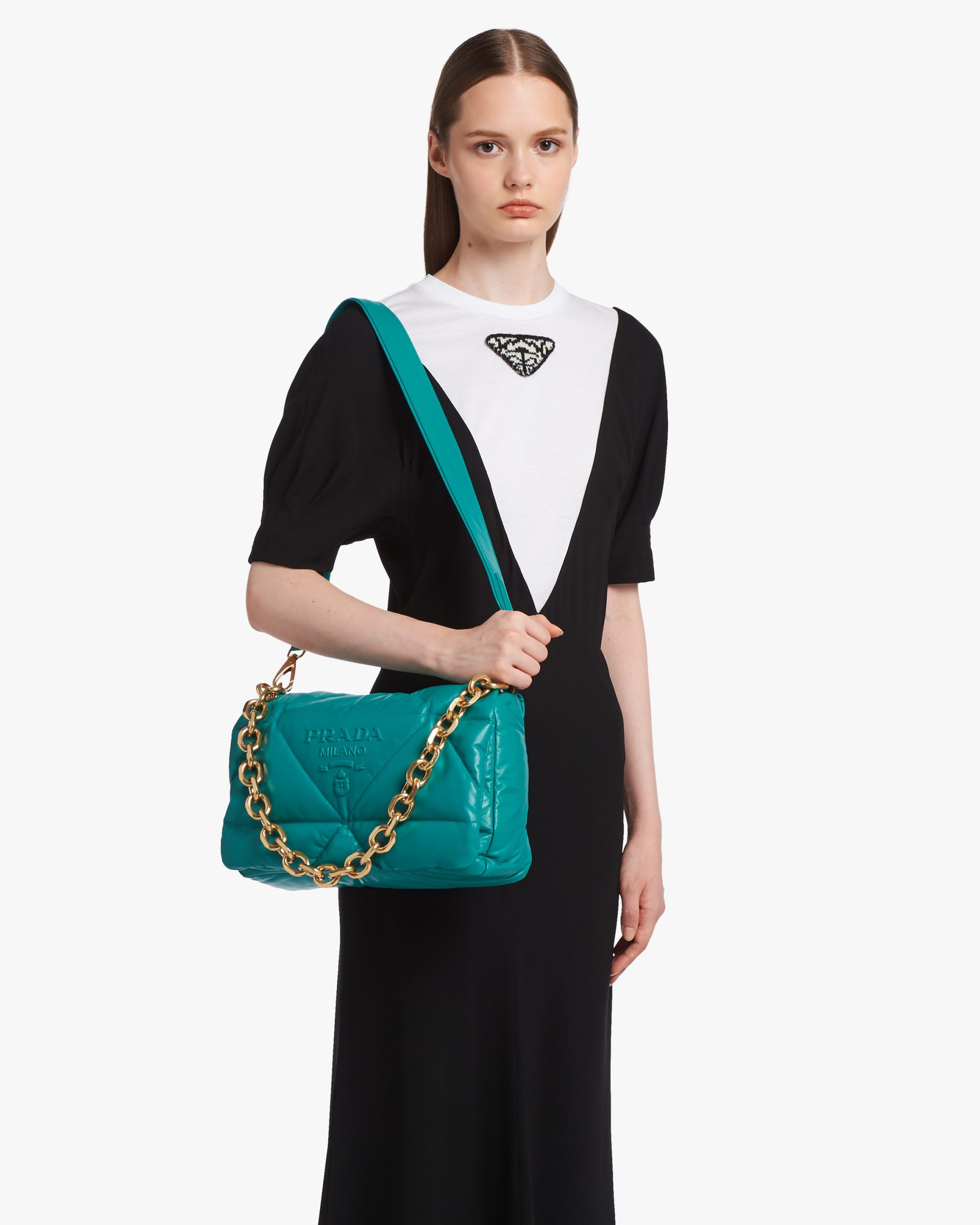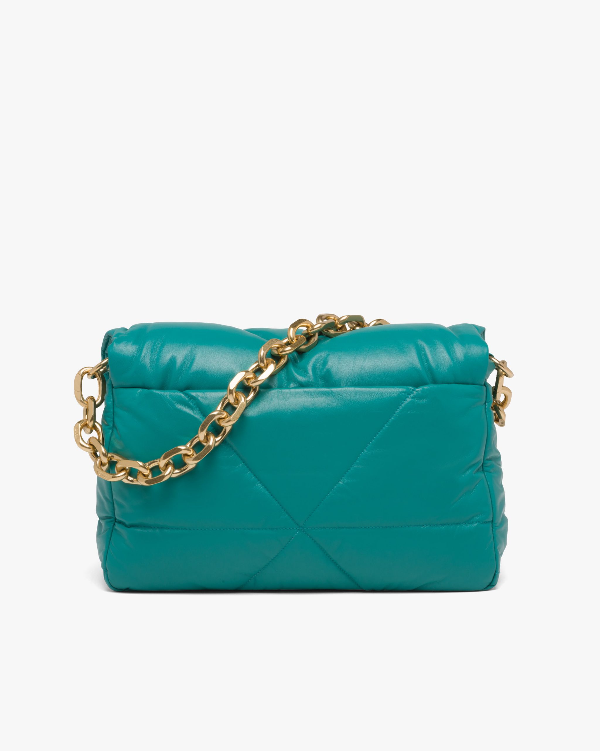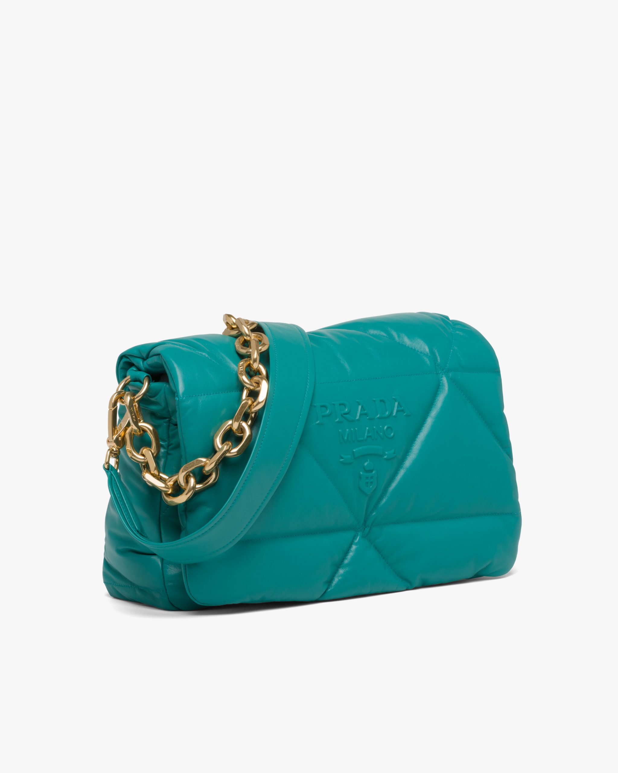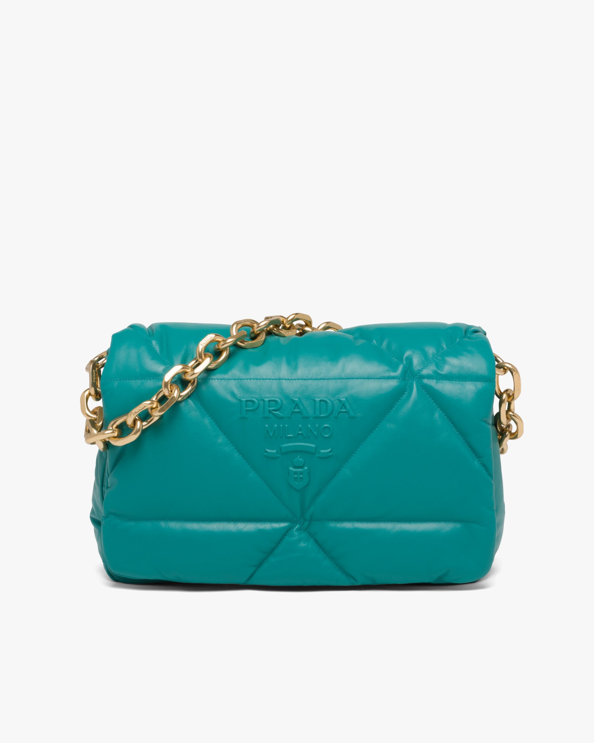 Reinterpreted in always new ways, Prada’s iconic triangle is repeated in the quilted motif of this soft padded nappa leather bag to create a patchwork motif. The chain handle is decorated with the engraved lettering logo.