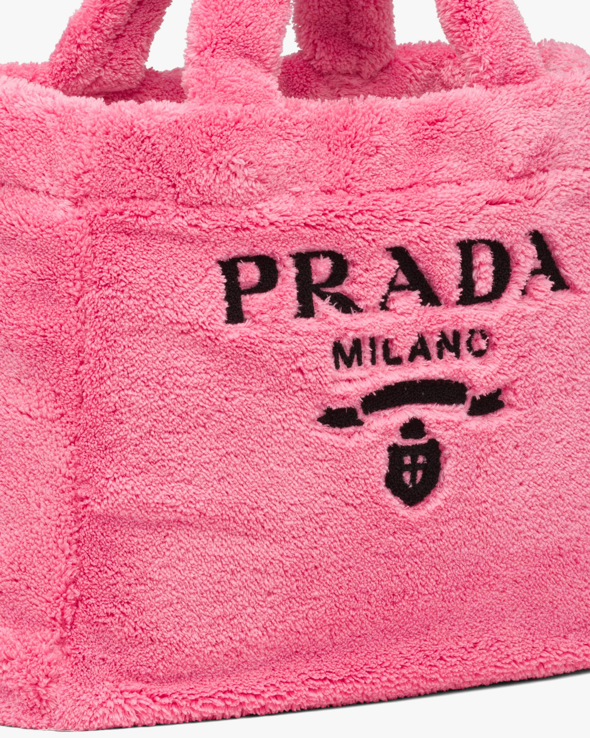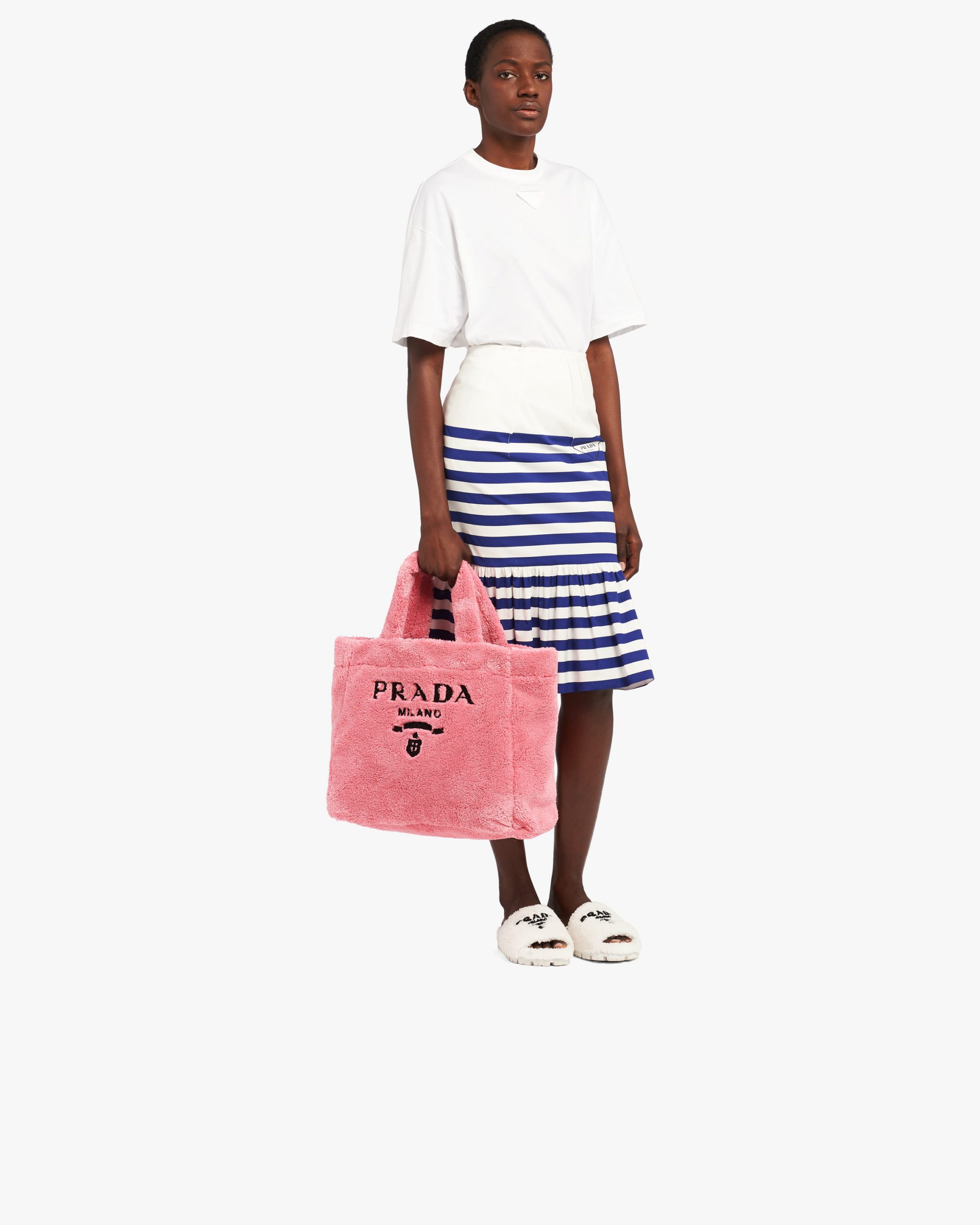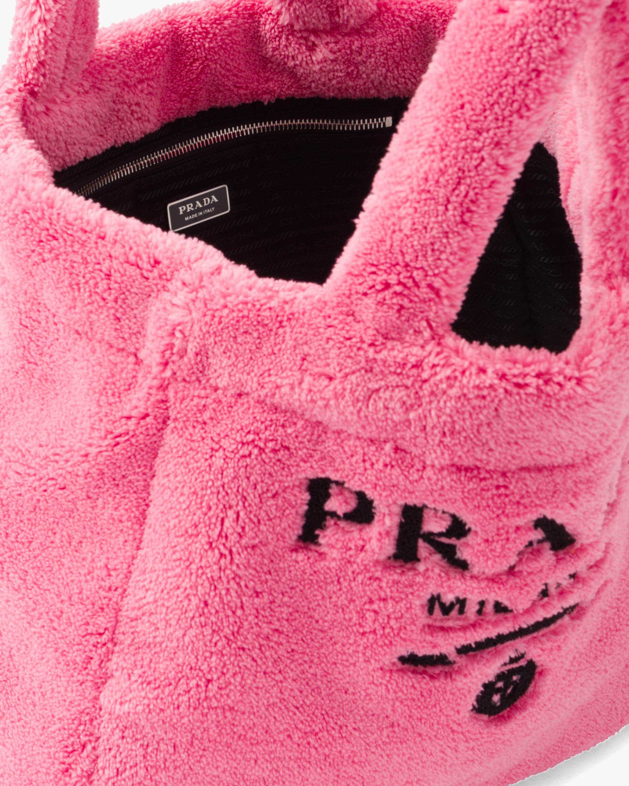 Vivid color contrasts and an ironic character define this tote bag with a deconstructed design in soft terry with a summery mood. A maxi version of Prada’s iconic lettering logo embroidered on the front enhances the accessory.