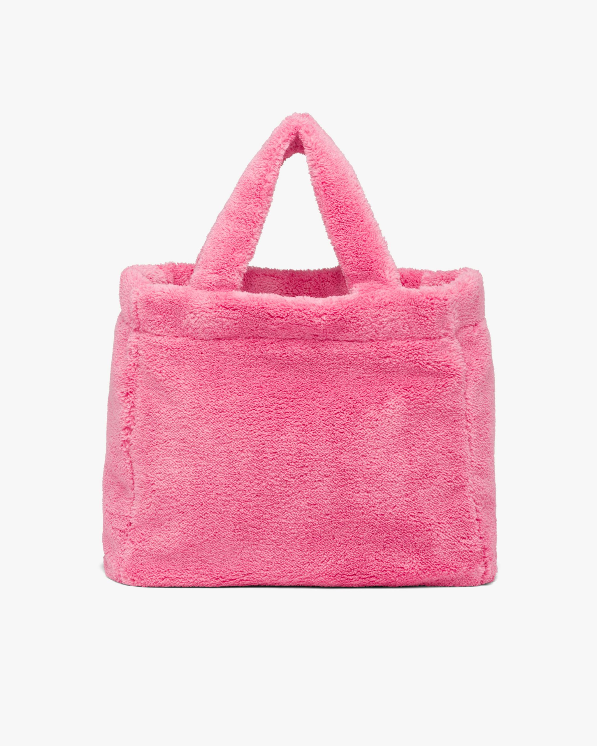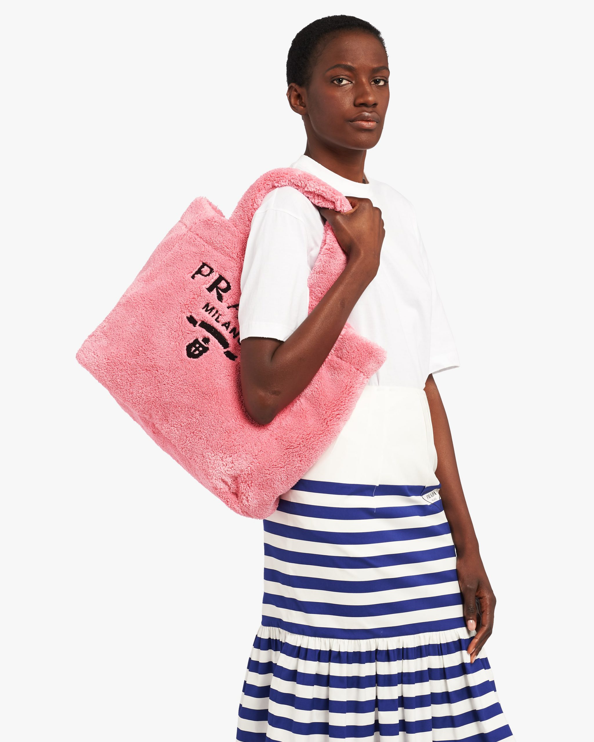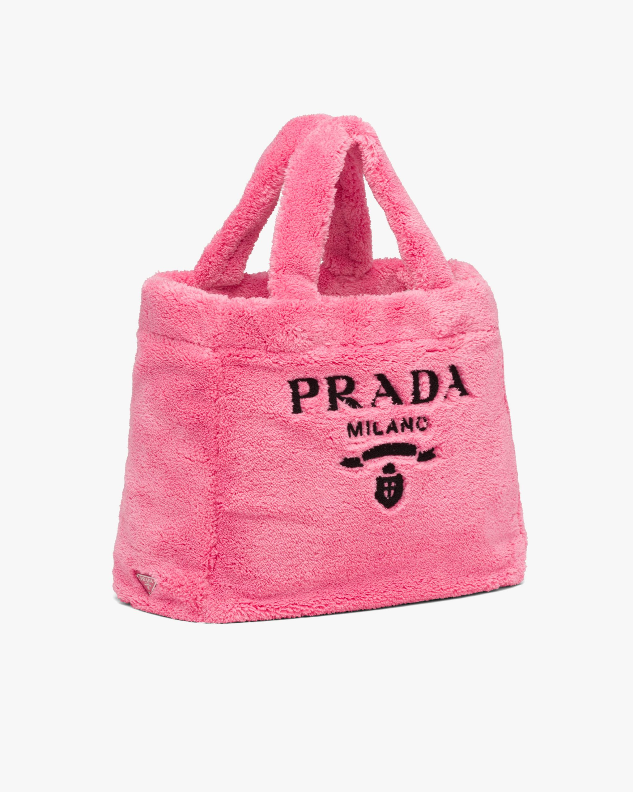 Vivid color contrasts and an ironic character define this tote bag with a deconstructed design in soft terry with a summery mood. A maxi version of Prada’s iconic lettering logo embroidered on the front enhances the accessory.