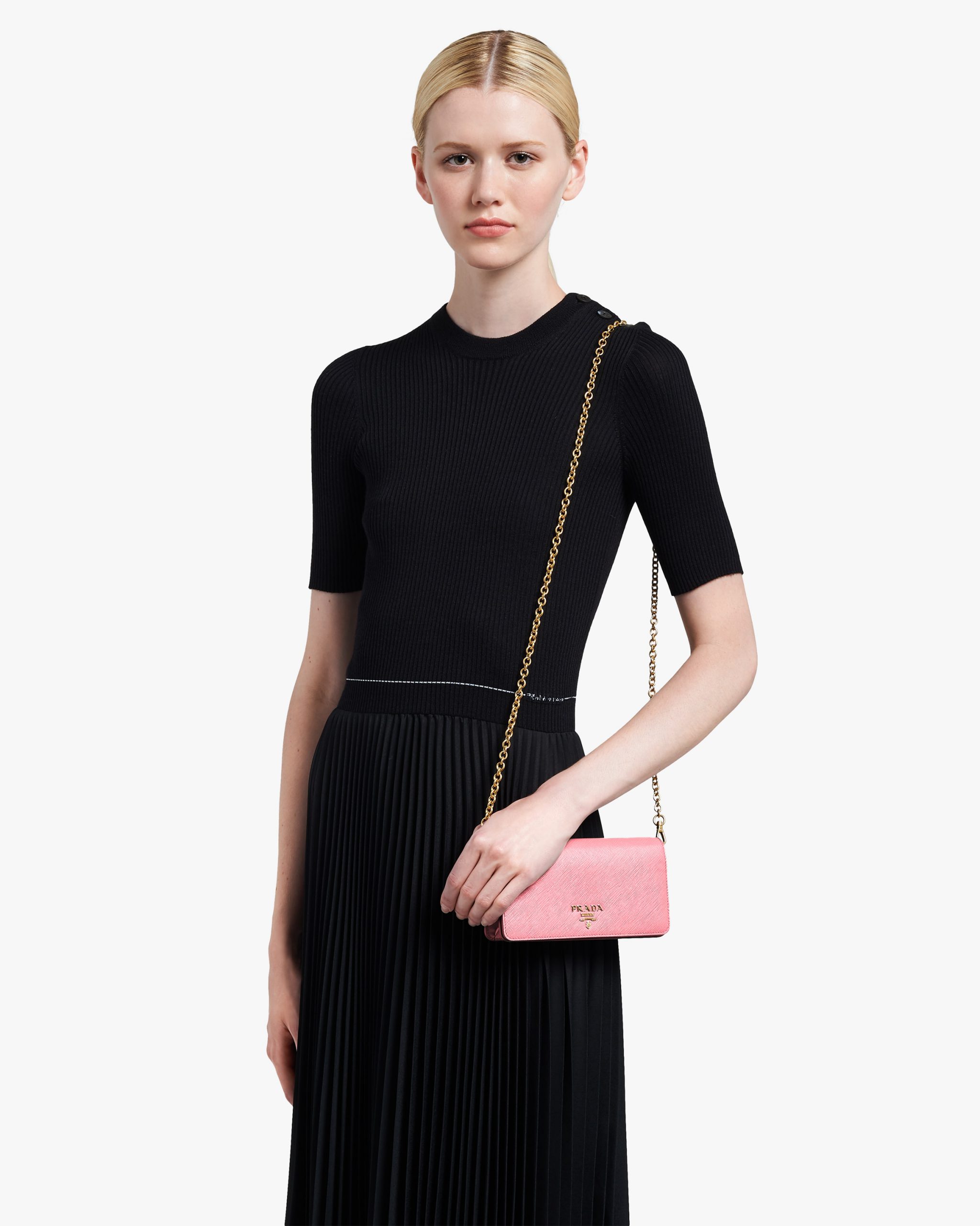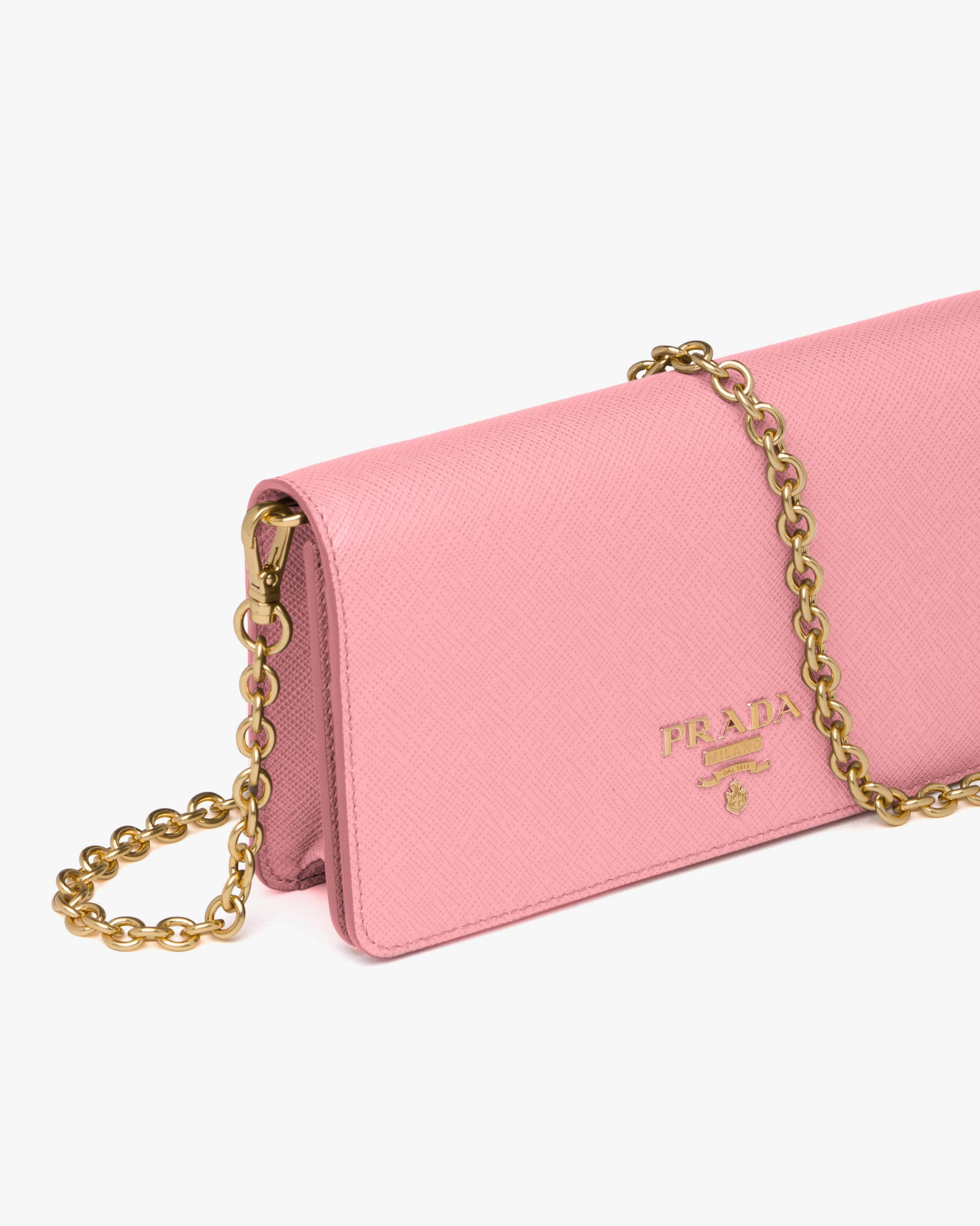 Refined and with a minimal design, this Saffiano leather mini-bag has a detachable chain shoulder strap.