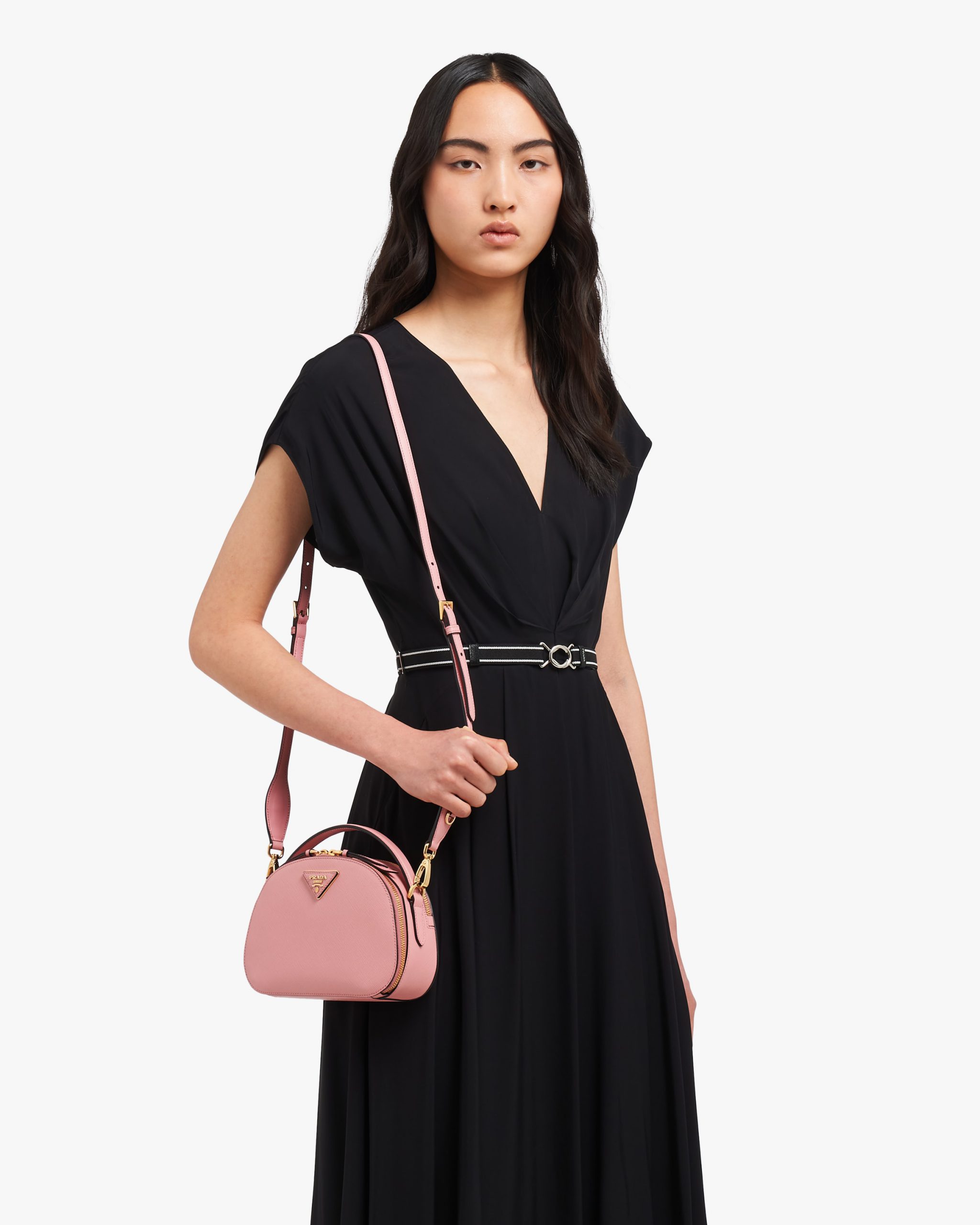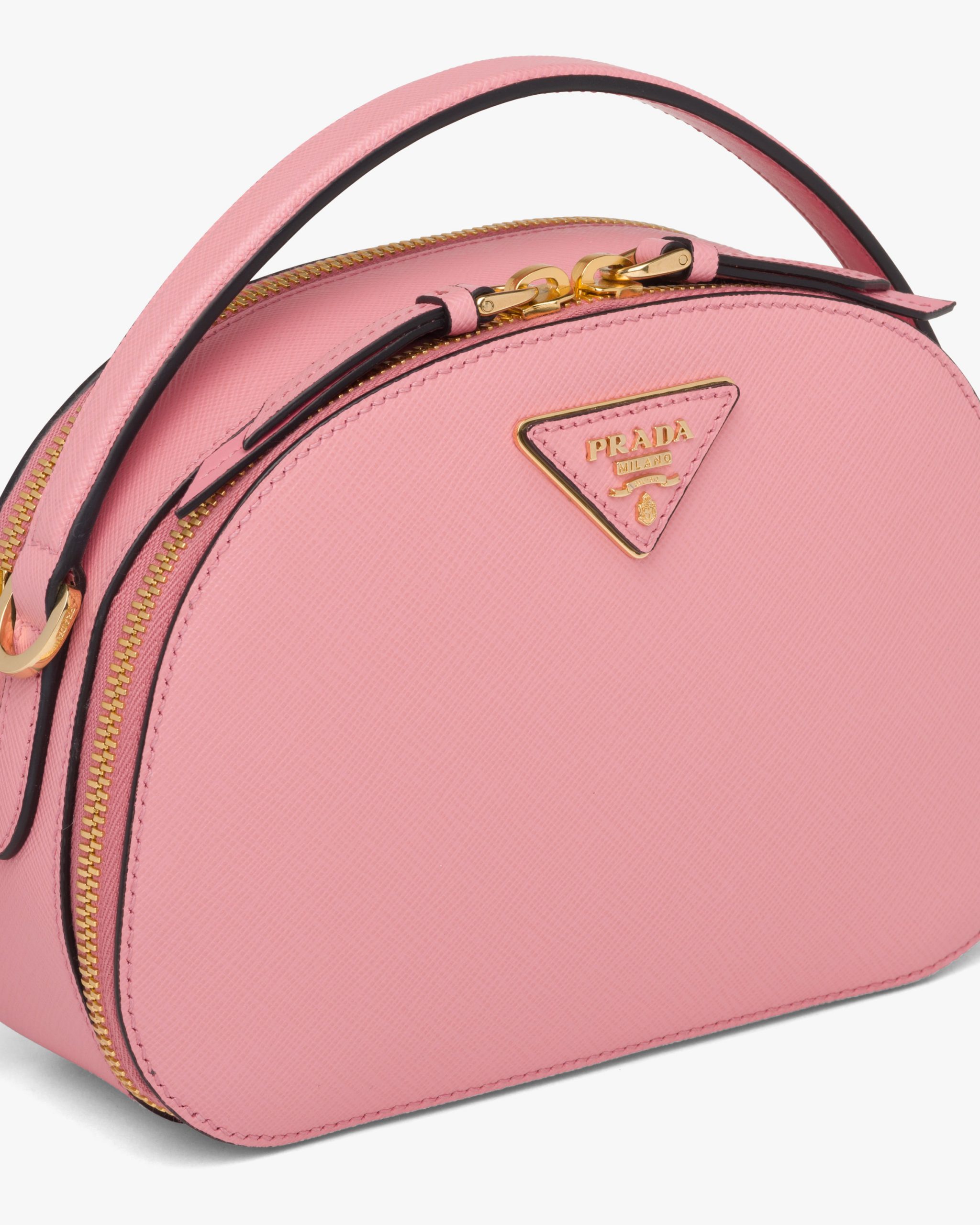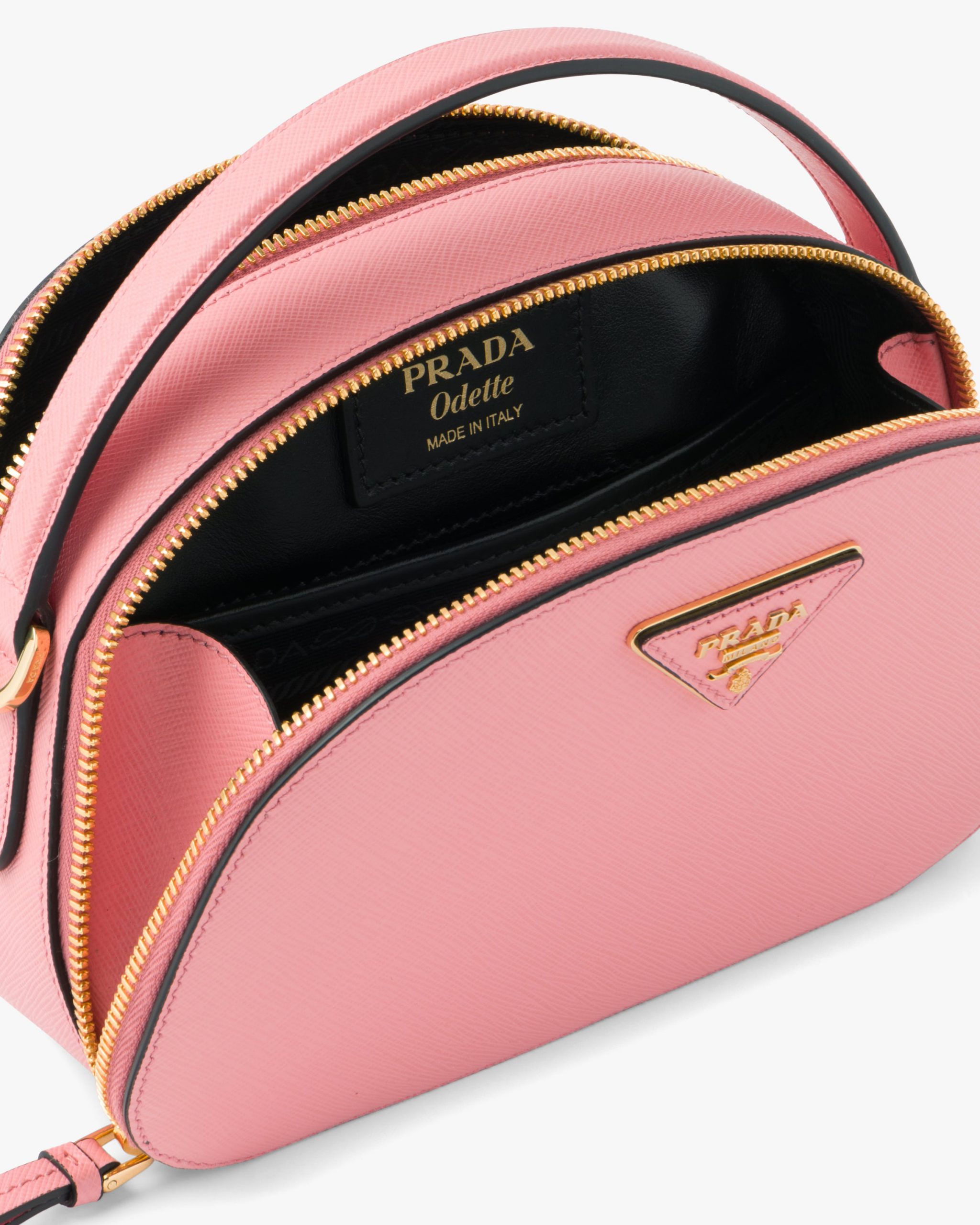 The rounded design of the Prada Odette bag is inspired by photographers’ camera cases. Made of fine Saffiano leather and decorated with the iconic triangle logo, the bag can be carried by hand or worn with a shoulder strap.