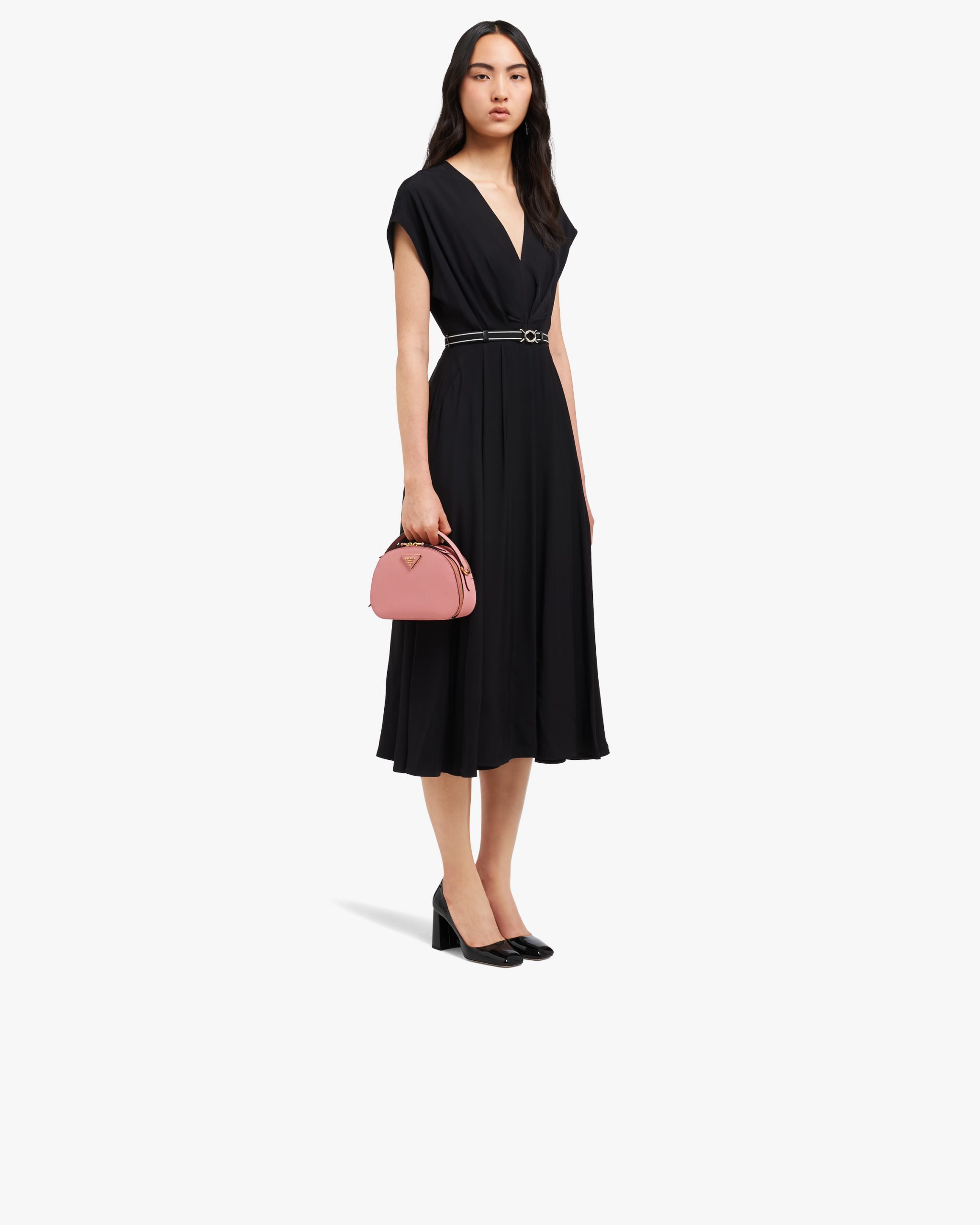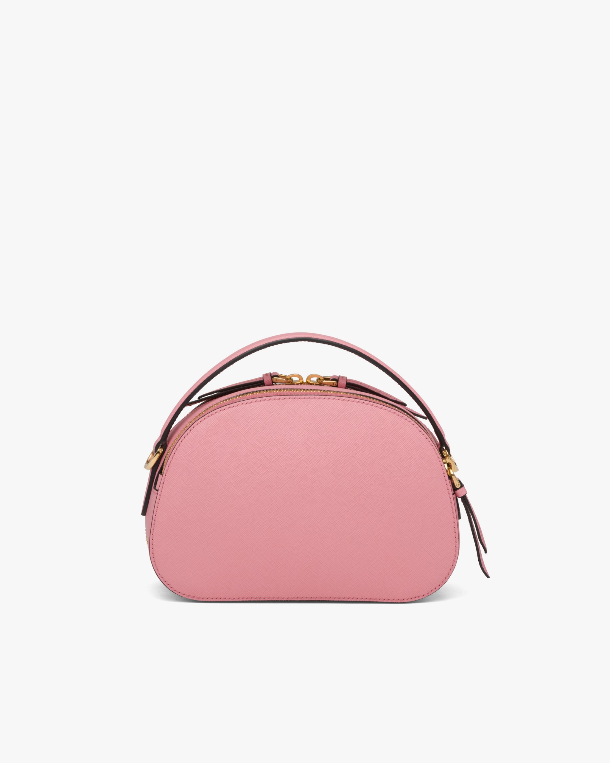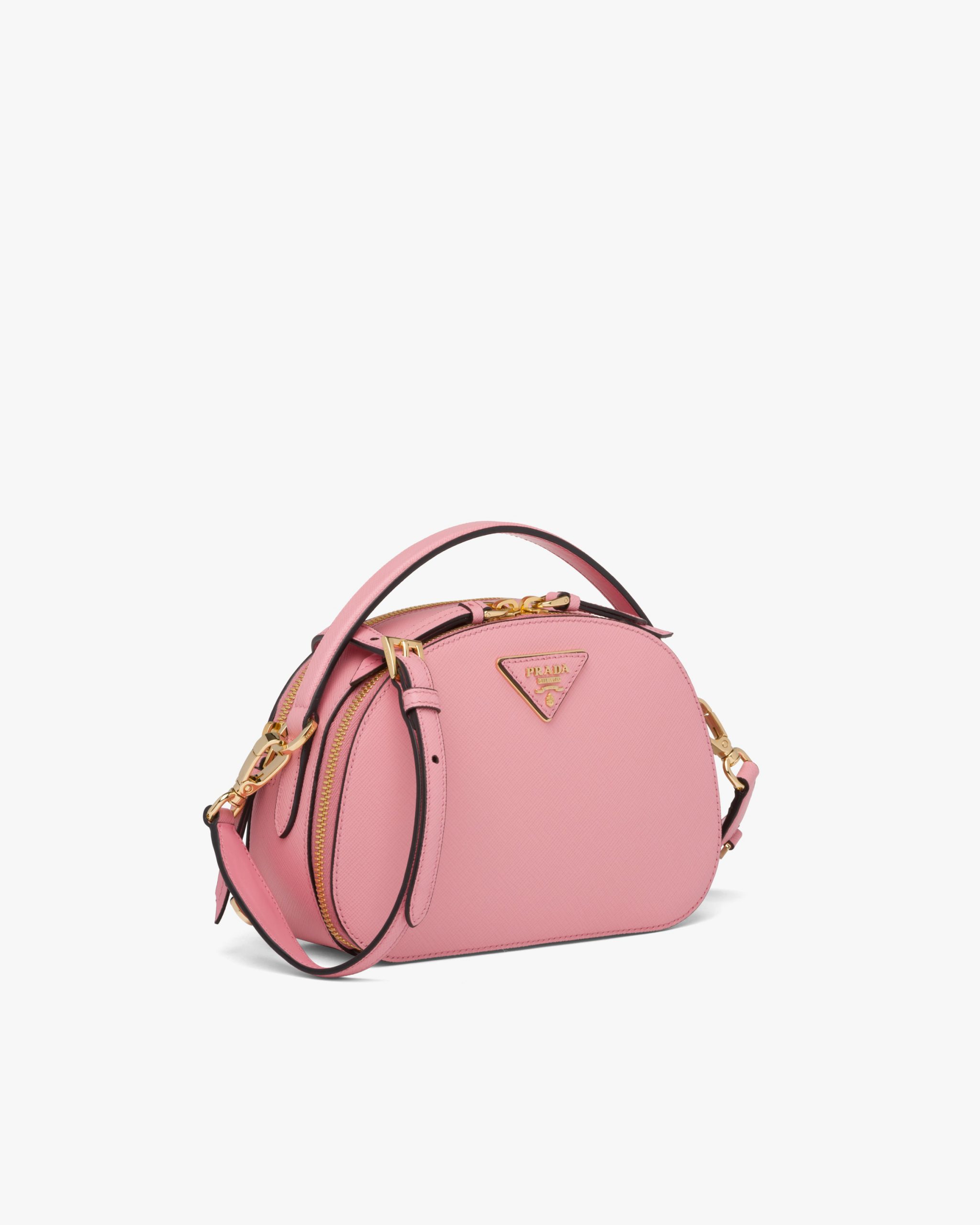 The rounded design of the Prada Odette bag is inspired by photographers’ camera cases. Made of fine Saffiano leather and decorated with the iconic triangle logo, the bag can be carried by hand or worn with a shoulder strap.