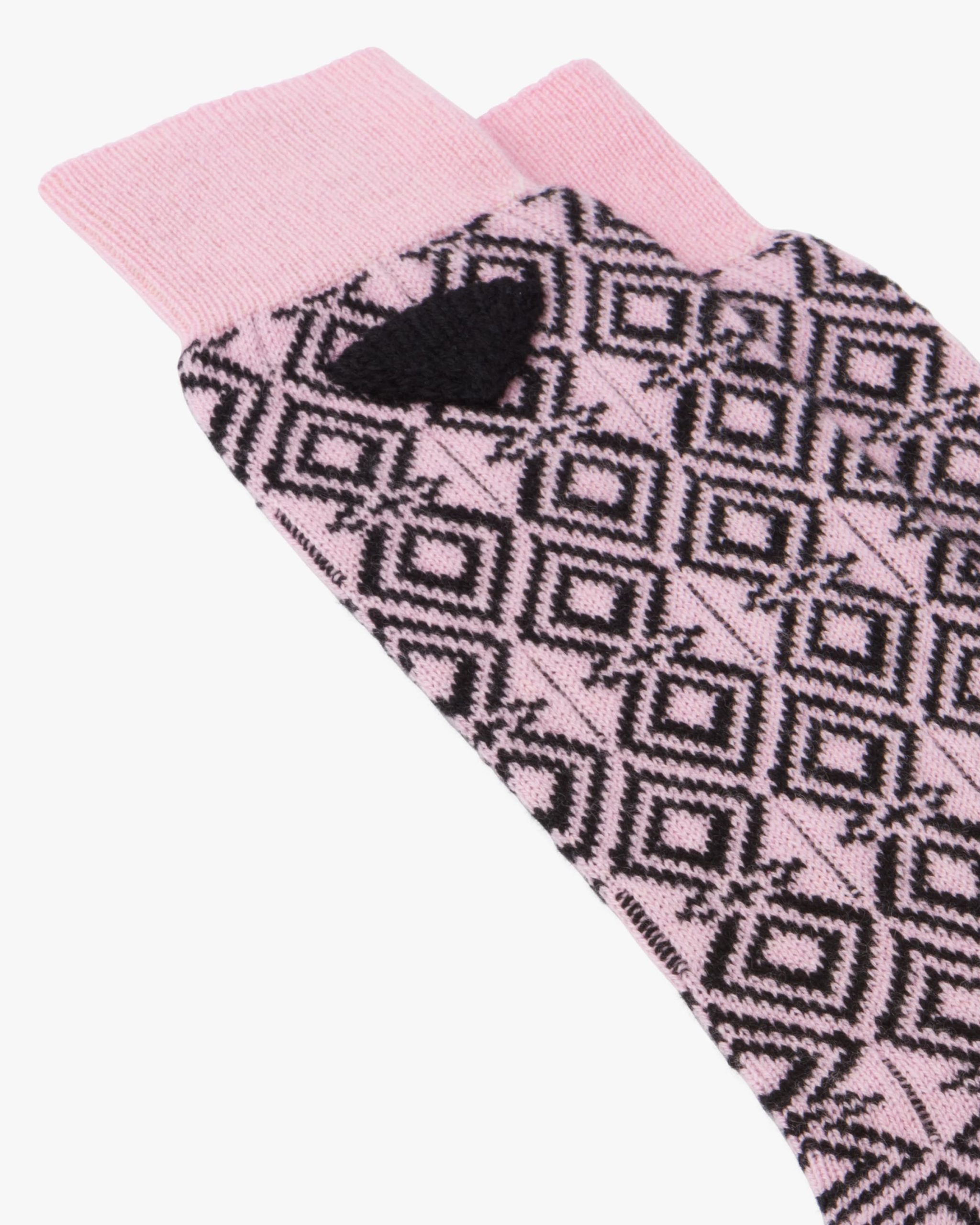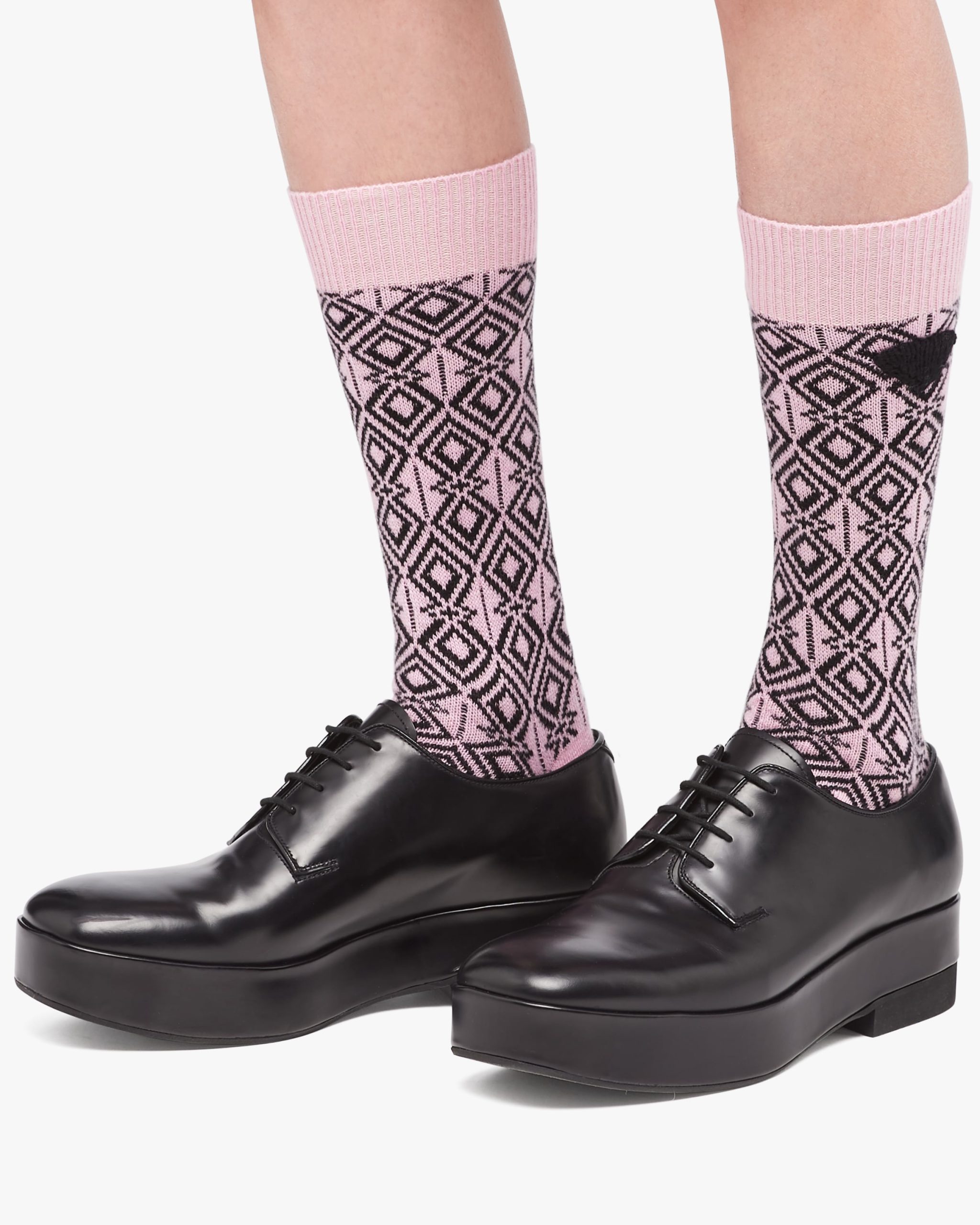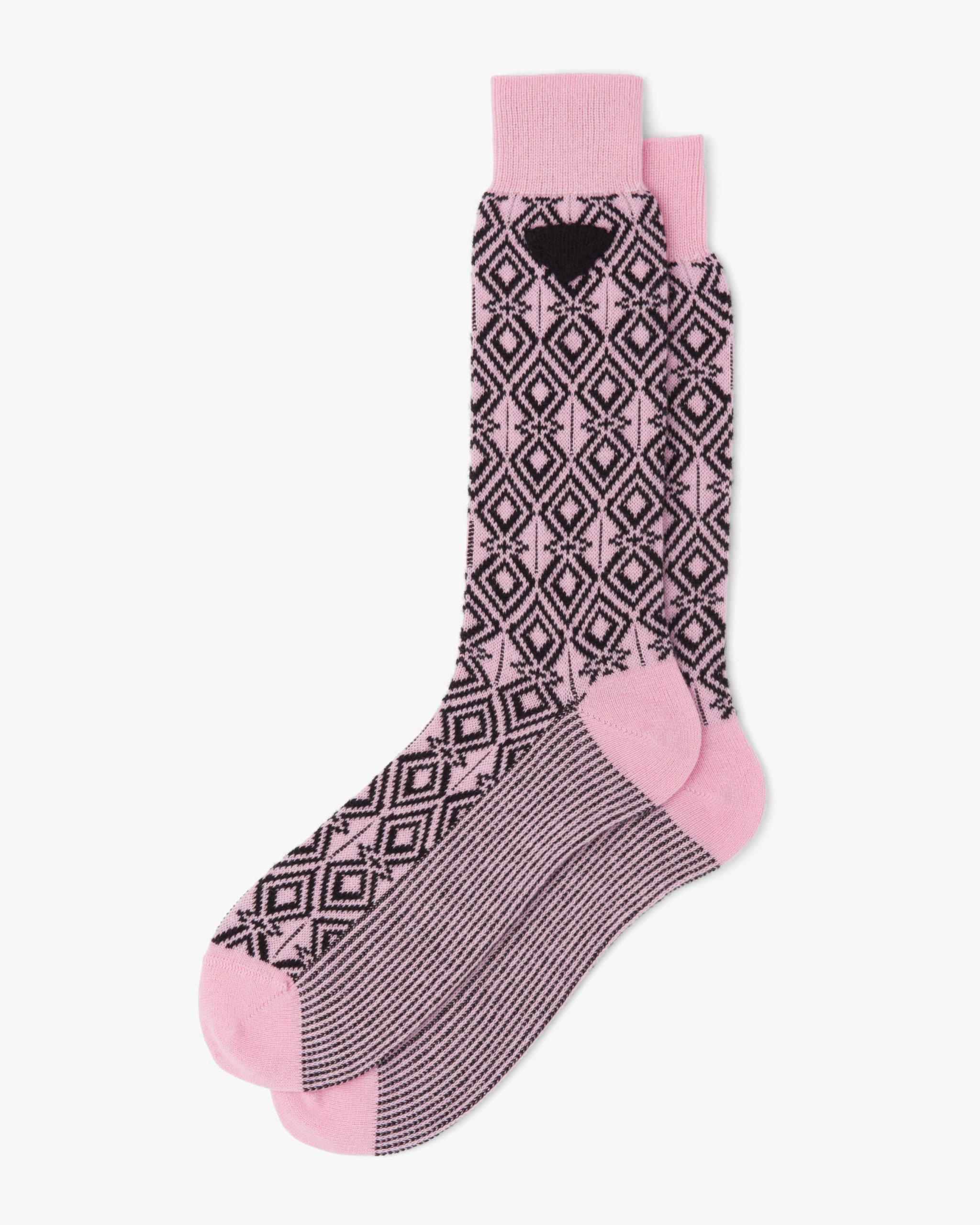 Geometric jacquard patterns animate these ankle socks made of high quality cashmere that is warm, cozy and extremely soft to the touch. A new interpretation of the triangle logo embellishes the design.