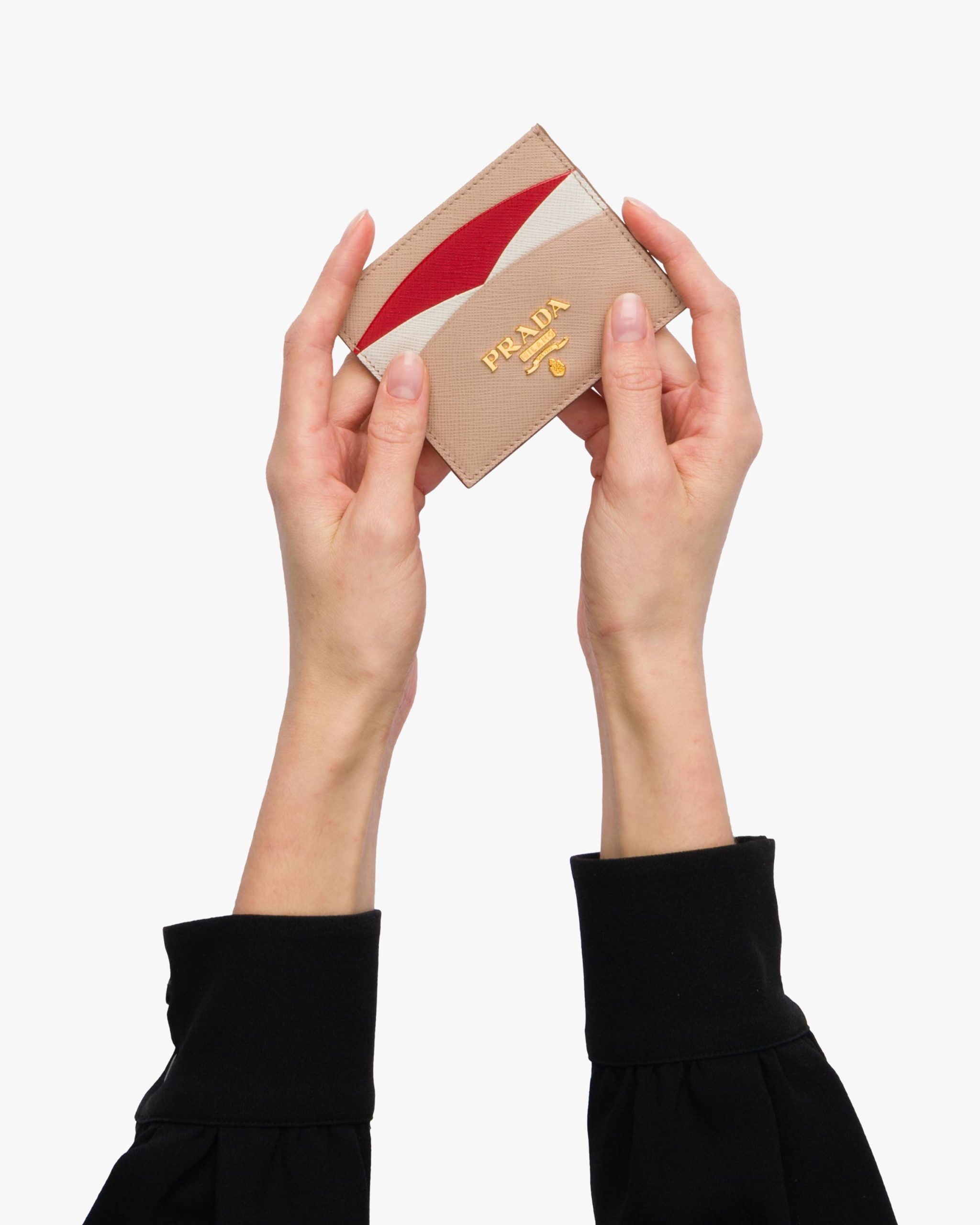 A sophisticated design with curved lines defines the multicolored Saffiano leather credit card holder. Practicality is ensured by the fabric-lined center pocket and card slots.