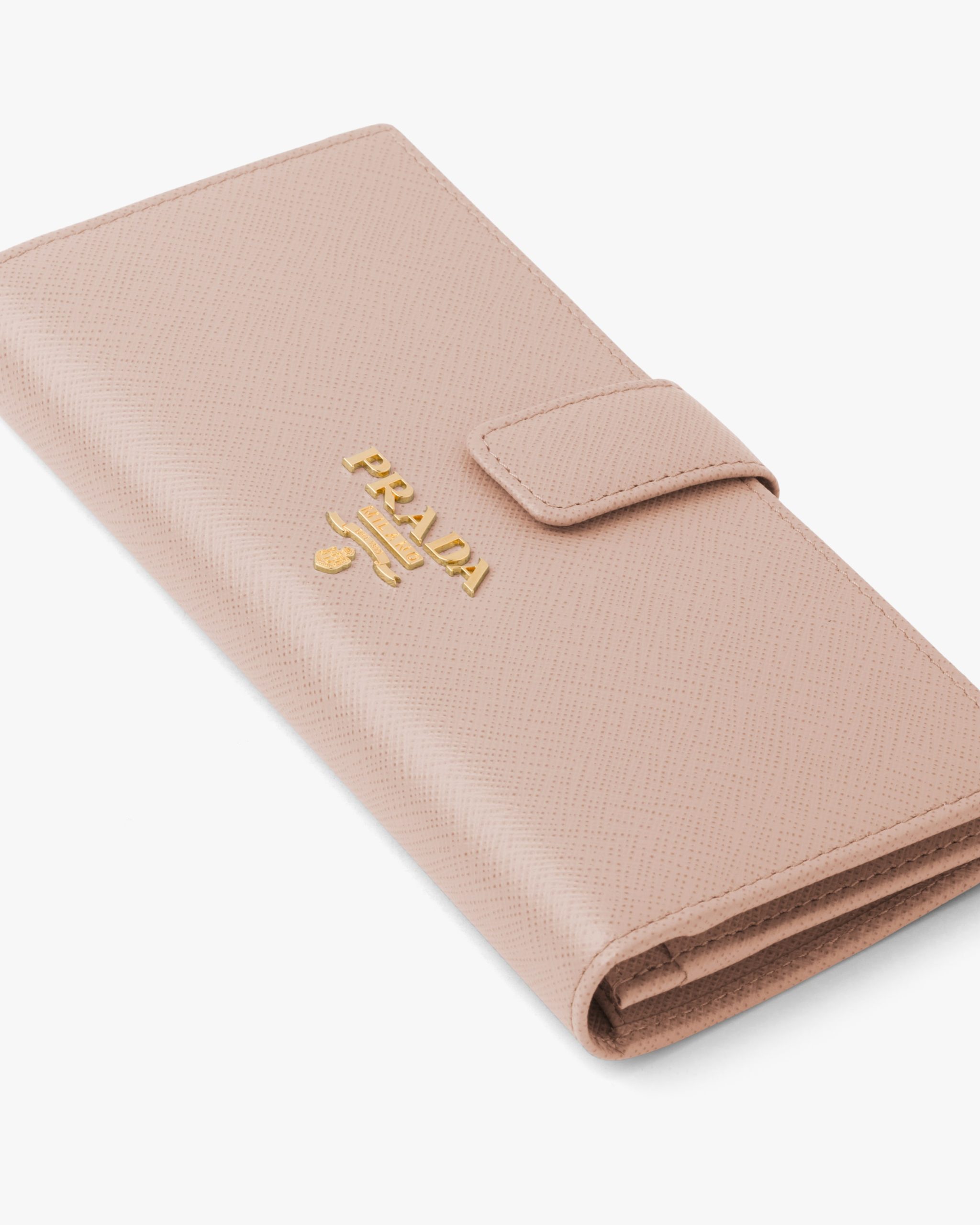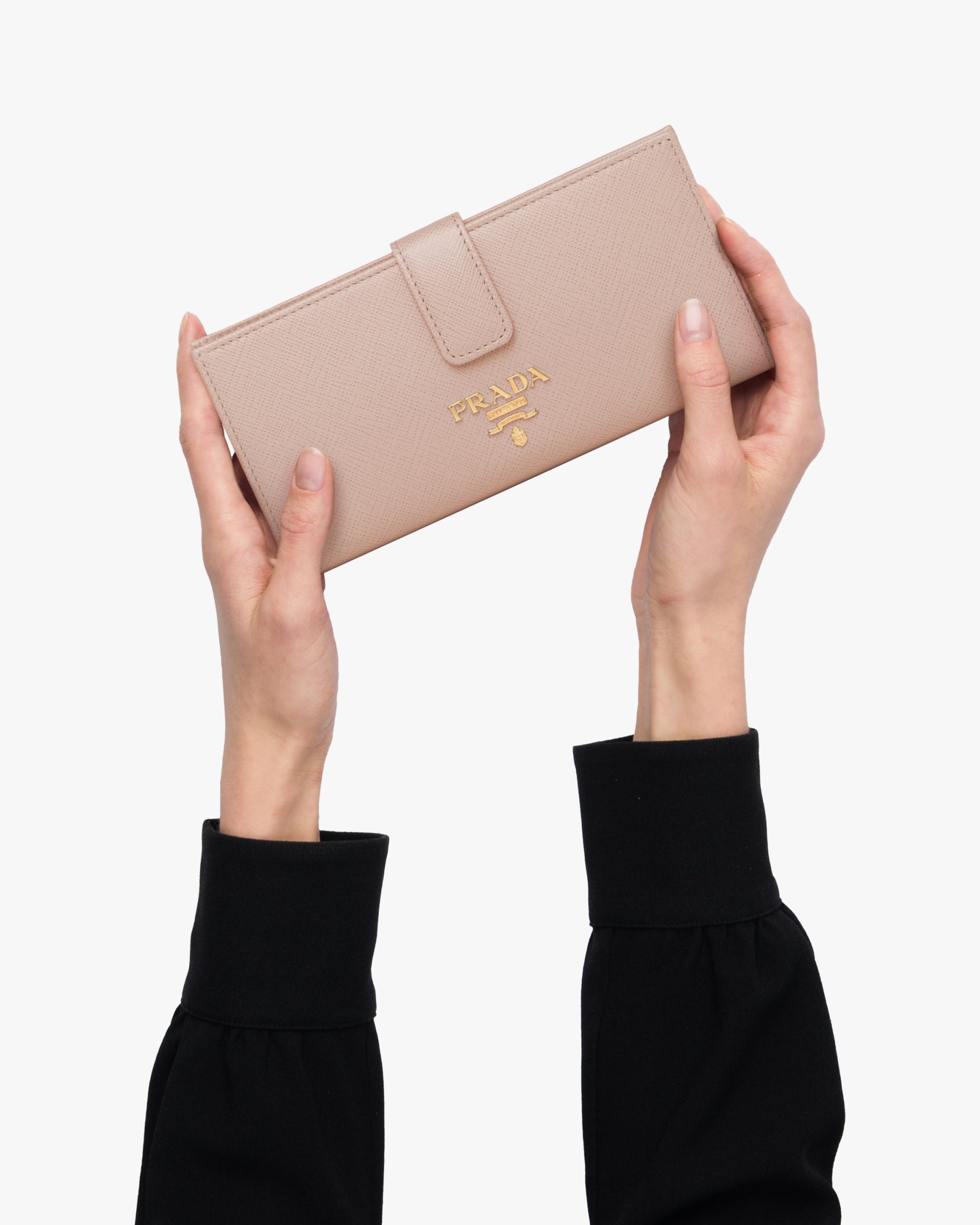 The wallet is made of Saffiano, an iconic Prada material: calf leather of the highest quality, defined by a crosshatch texture and a waxed finish. The lettering logo decorates the accessory.