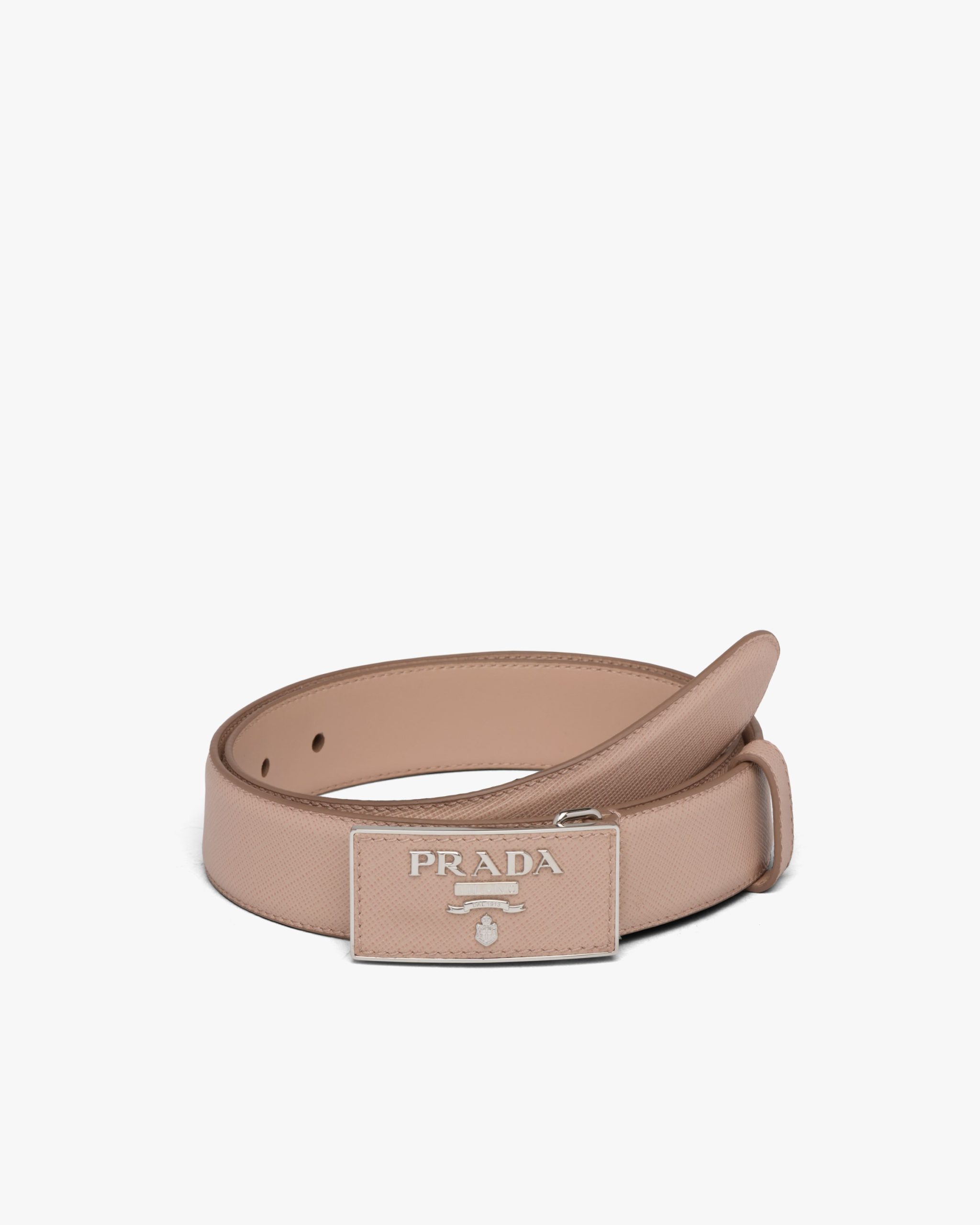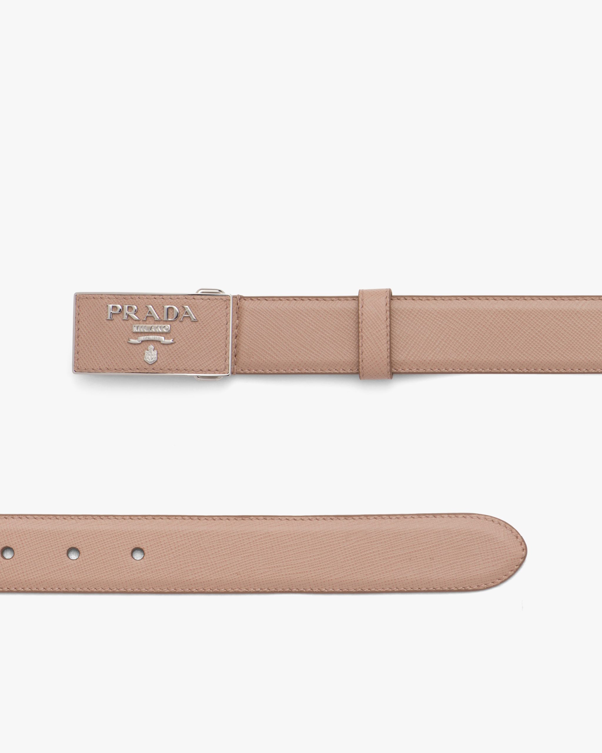 This Saffiano leather belt is characterized by the metal buckle with logo.