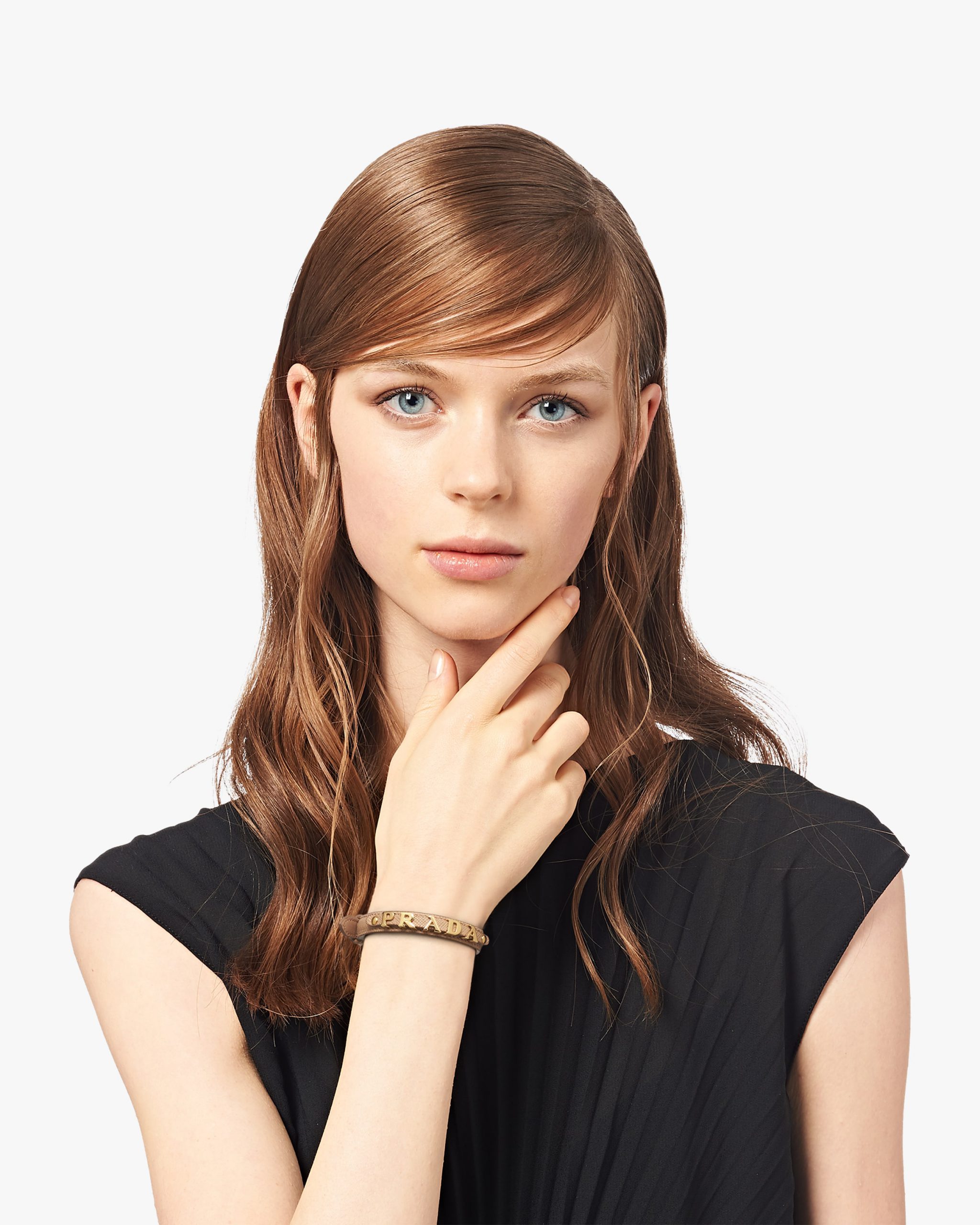 The metal lettering logo applied to the leather strap loop decorates the bracelet made of iconic Saffiano leather. The strap has a metal buckle.