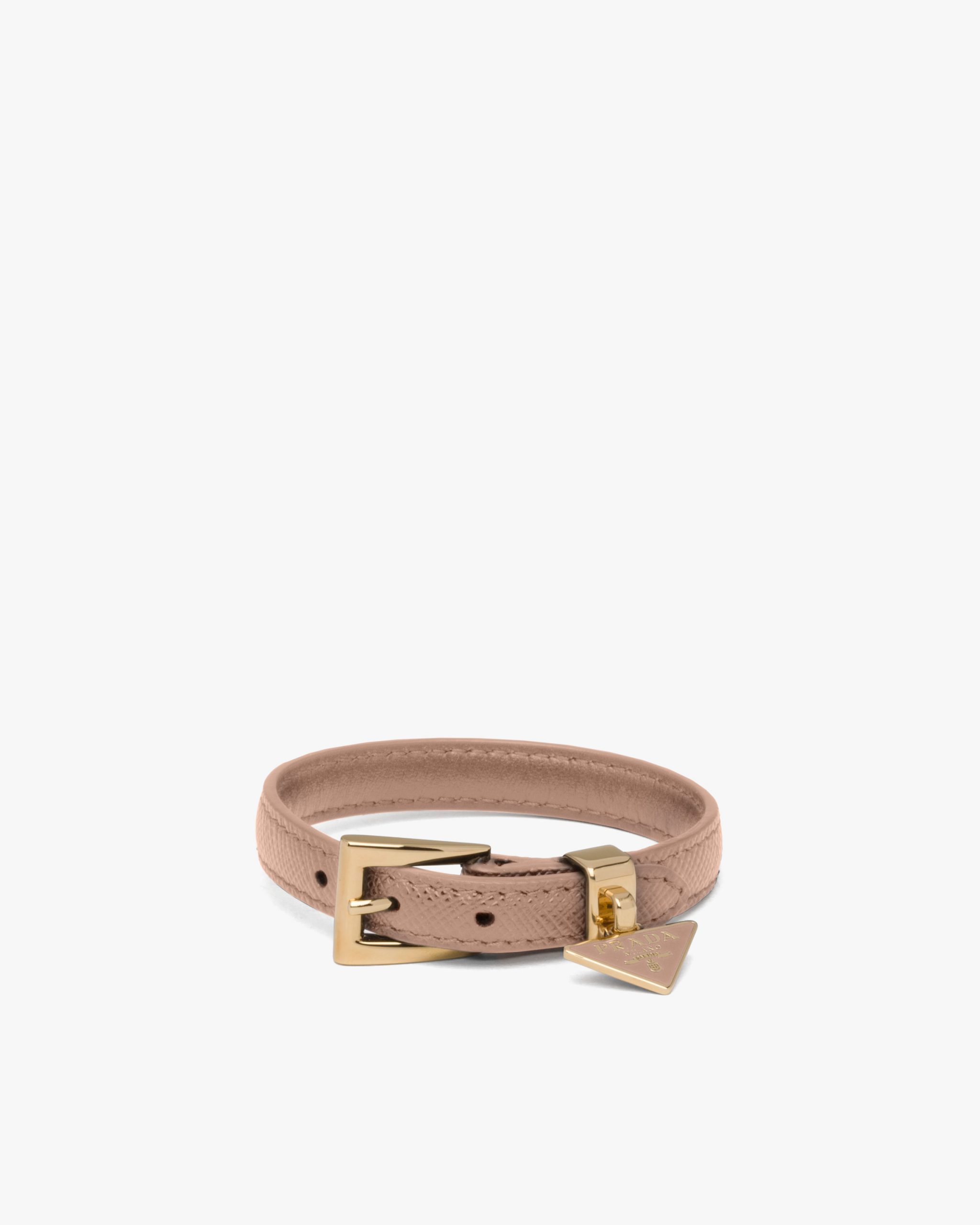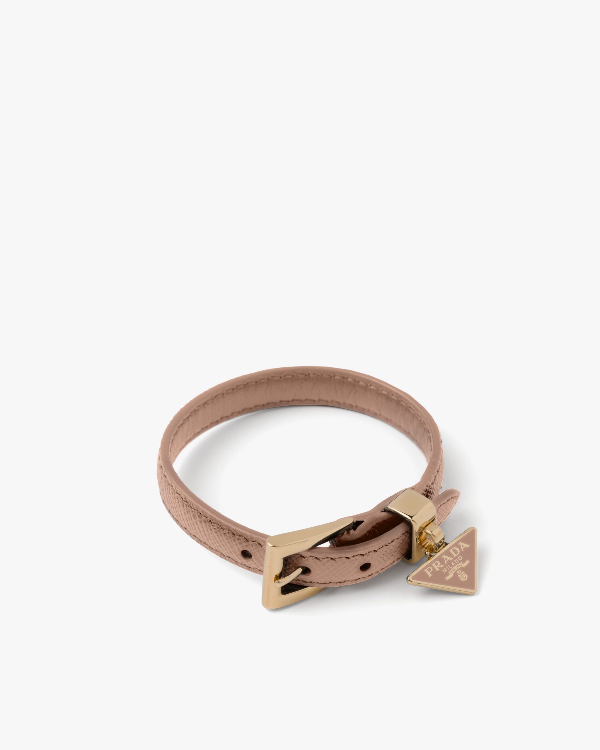This elegant Saffiano leather bracelet decorated with a metal triangle logo charm stands out for its feminine design.