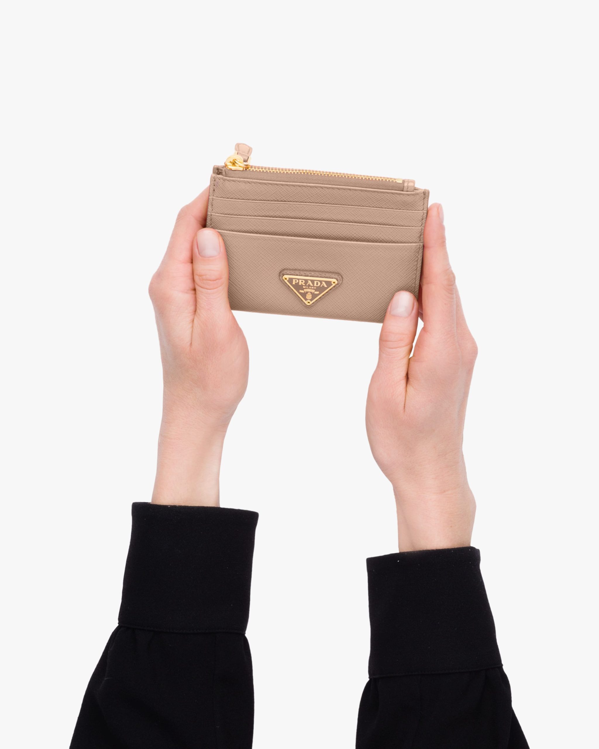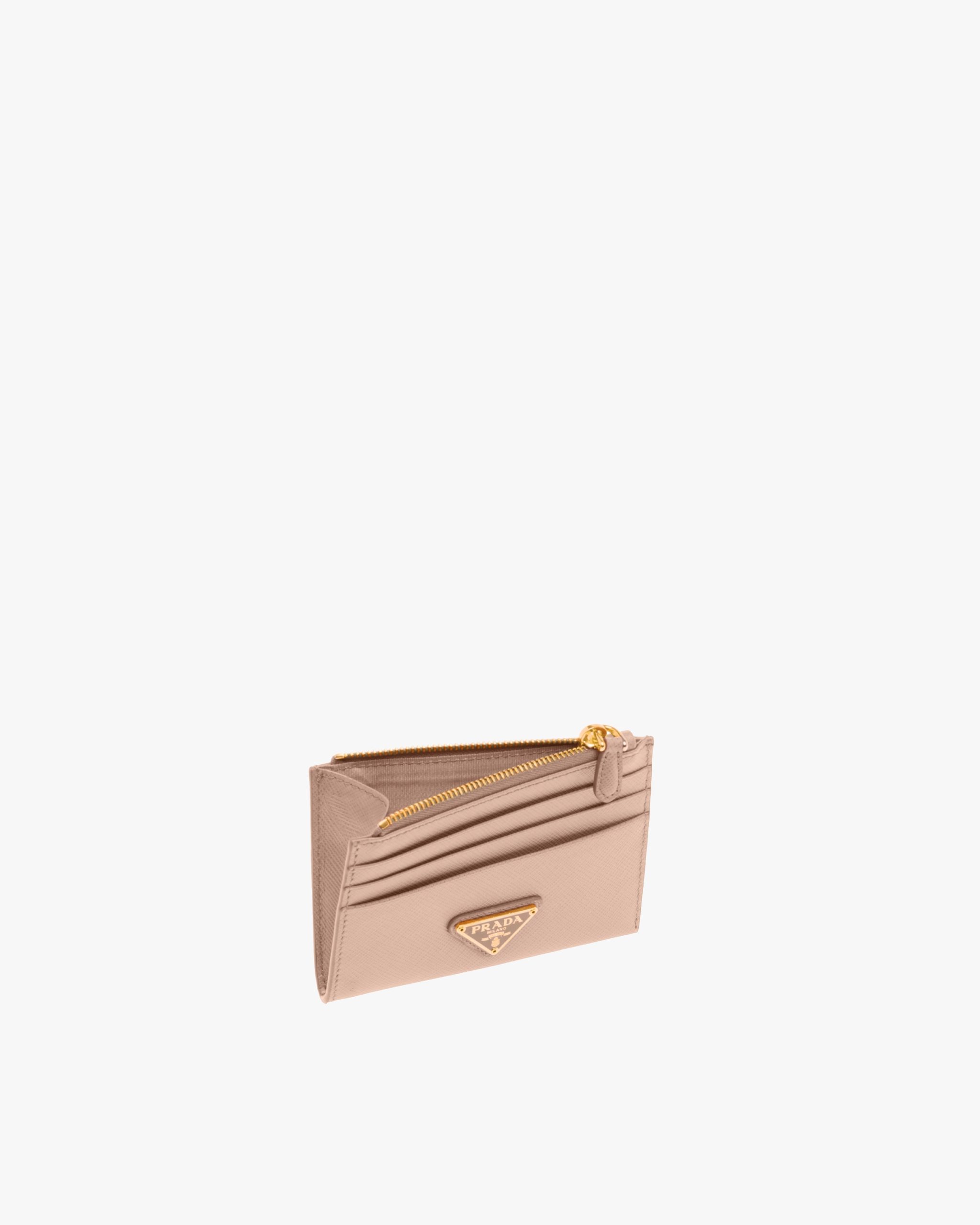 Small and handy, this sophisticated Saffiano leather credit card holder is decorated with the iconic enameled metal triangle logo.