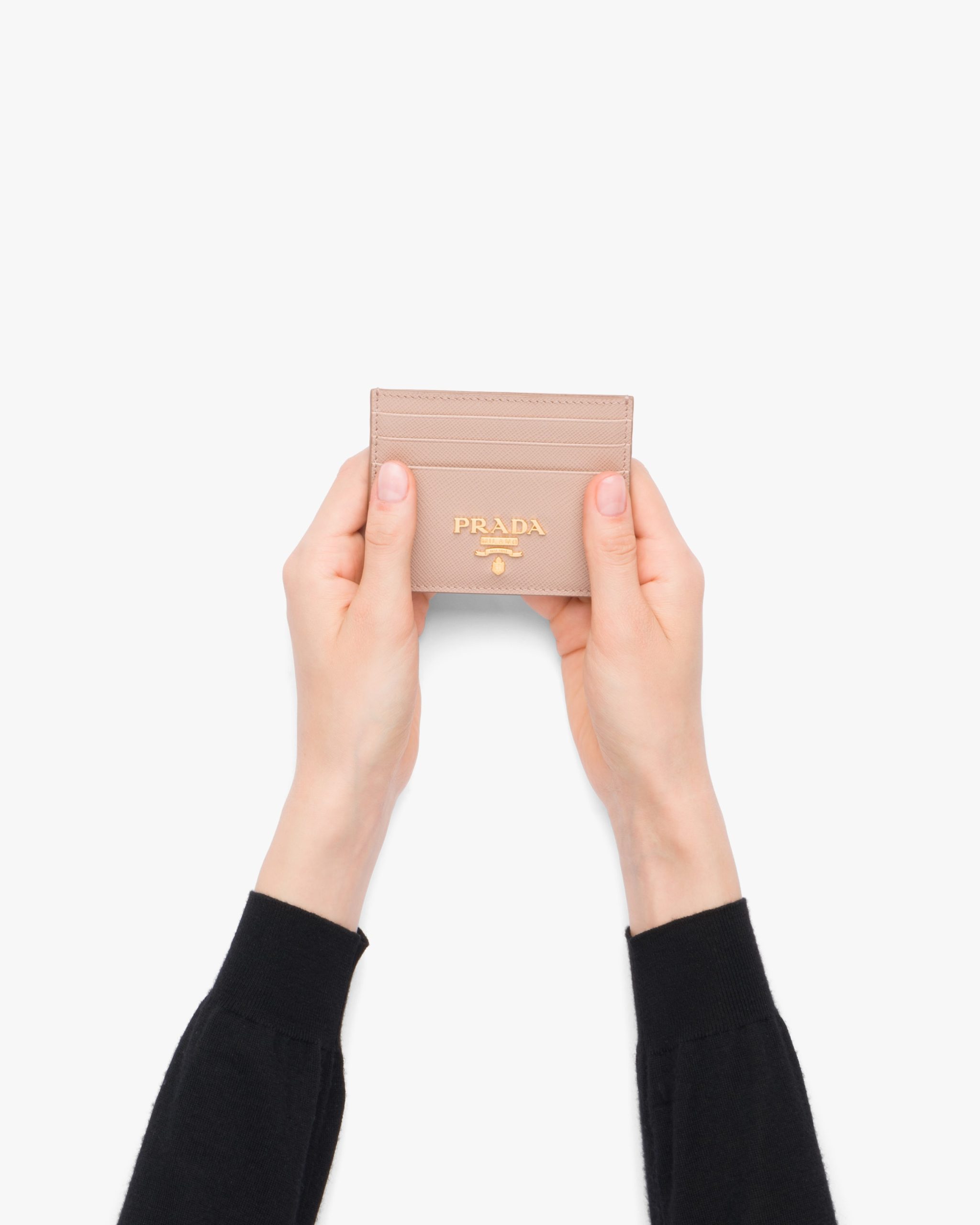 This Saffiano leather card holder expresses elegant simplicity. It is decorated with the metal logo.