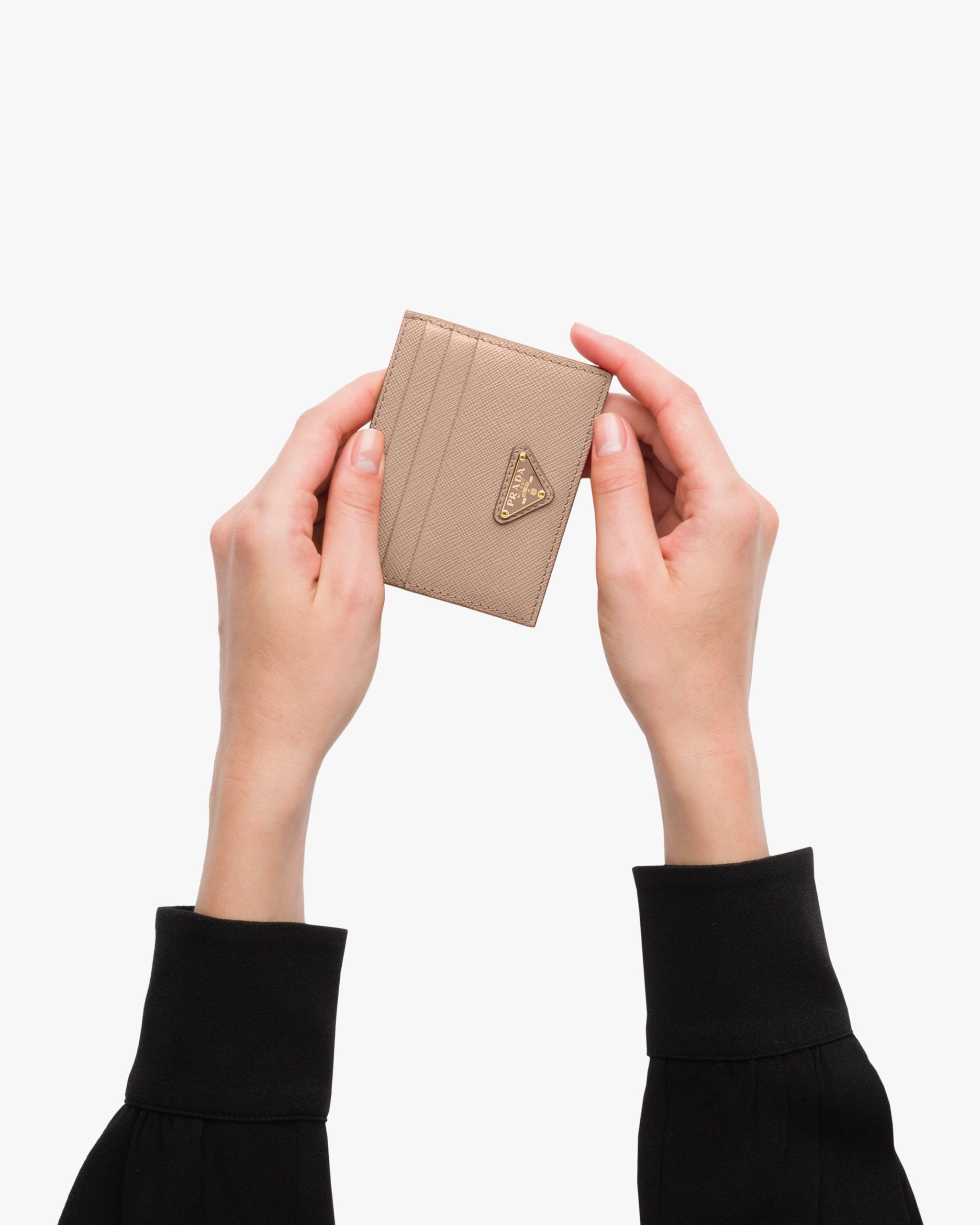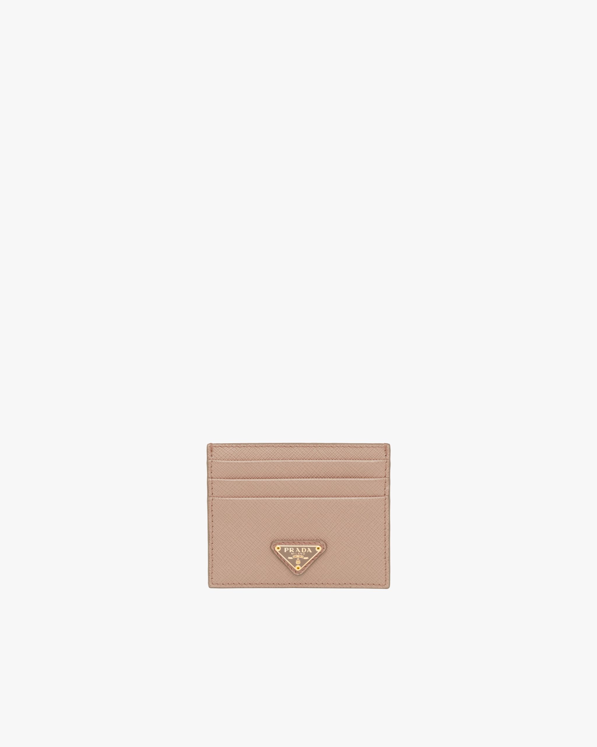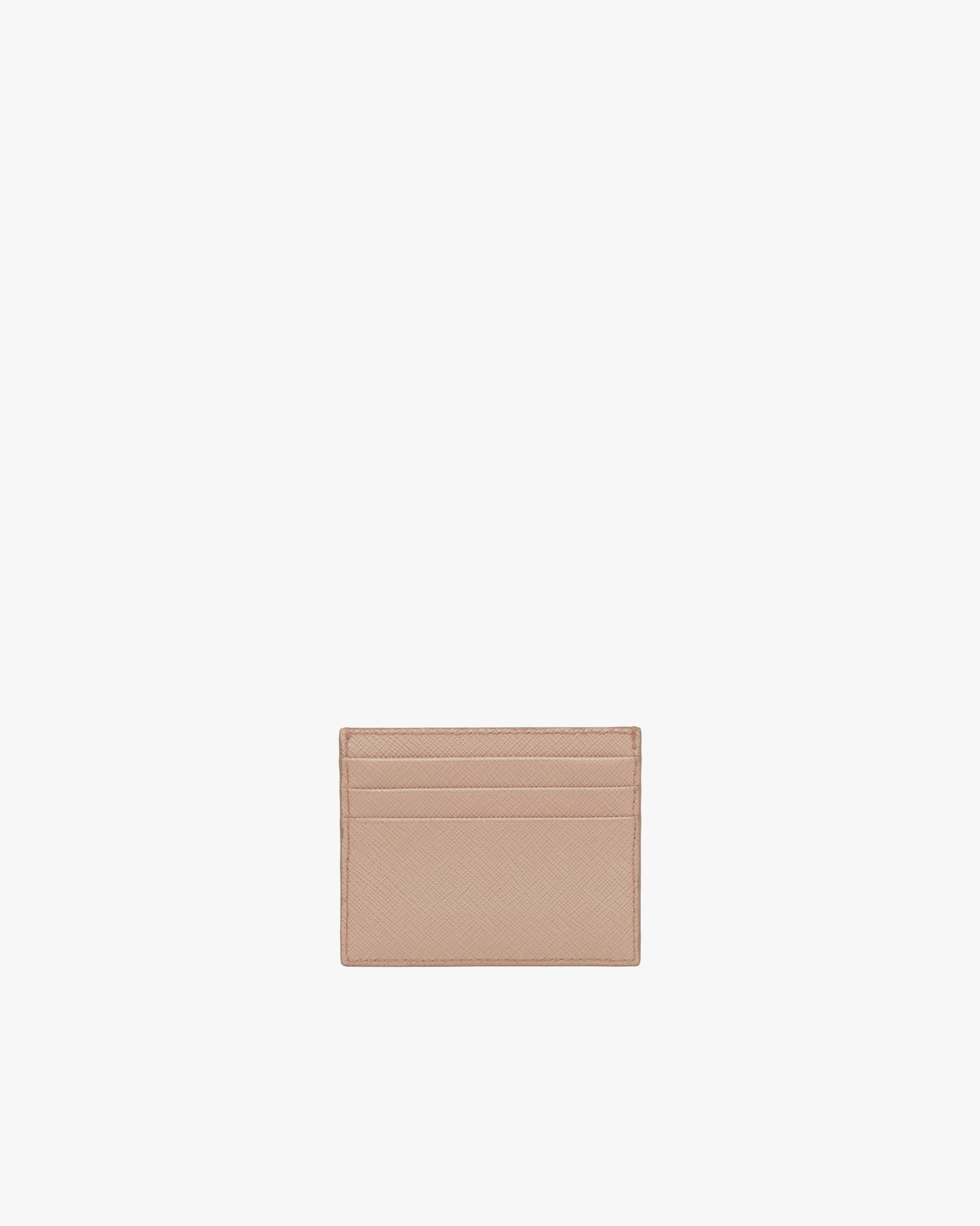 The unmistakable texture of Saffiano leather characterizes this sleek card holder. The accessory with six card slots is decorated with a tonal enameled metal triangle logo.