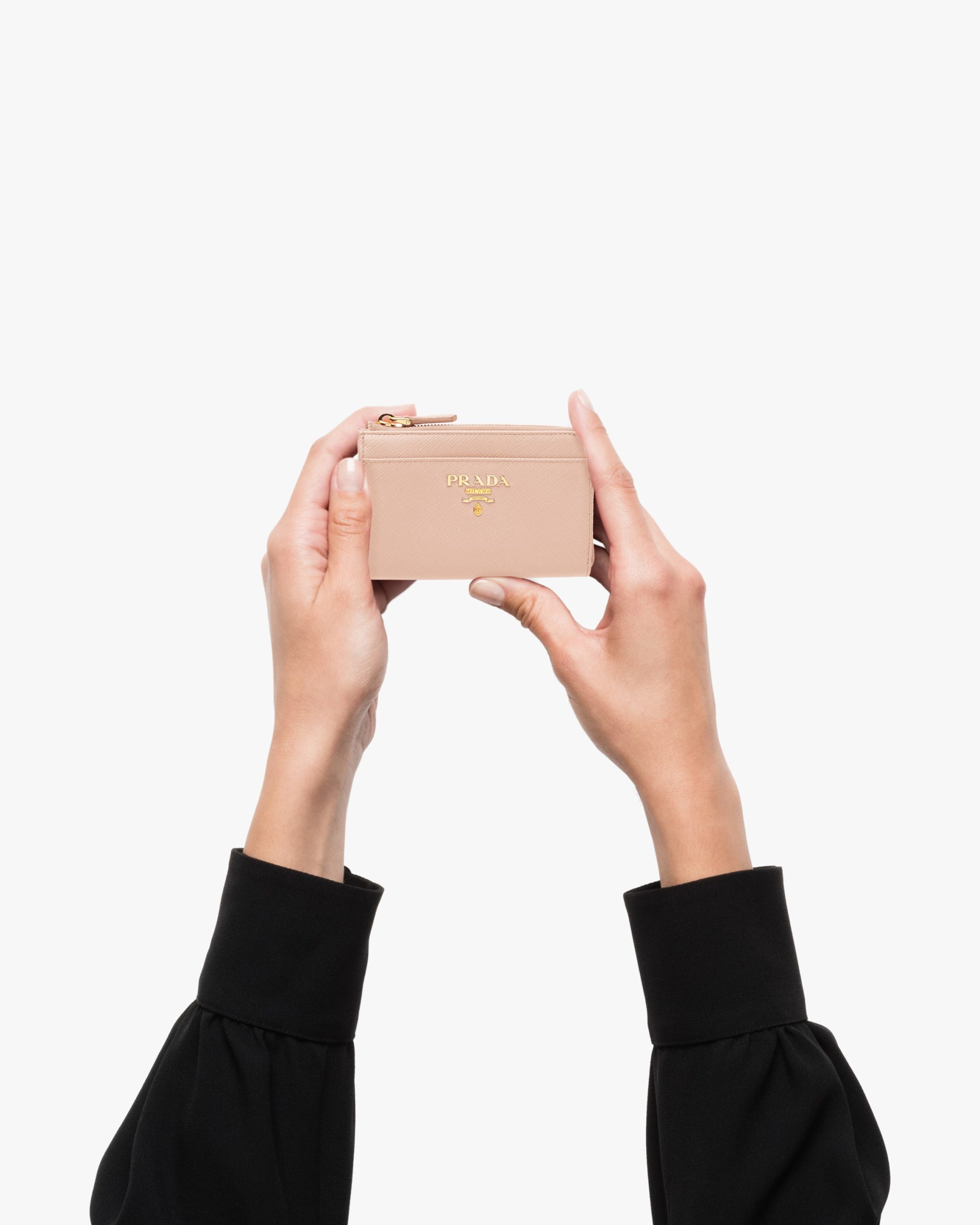 This Saffiano leather keychain is decorated with the metal lettering logo and has card slots.