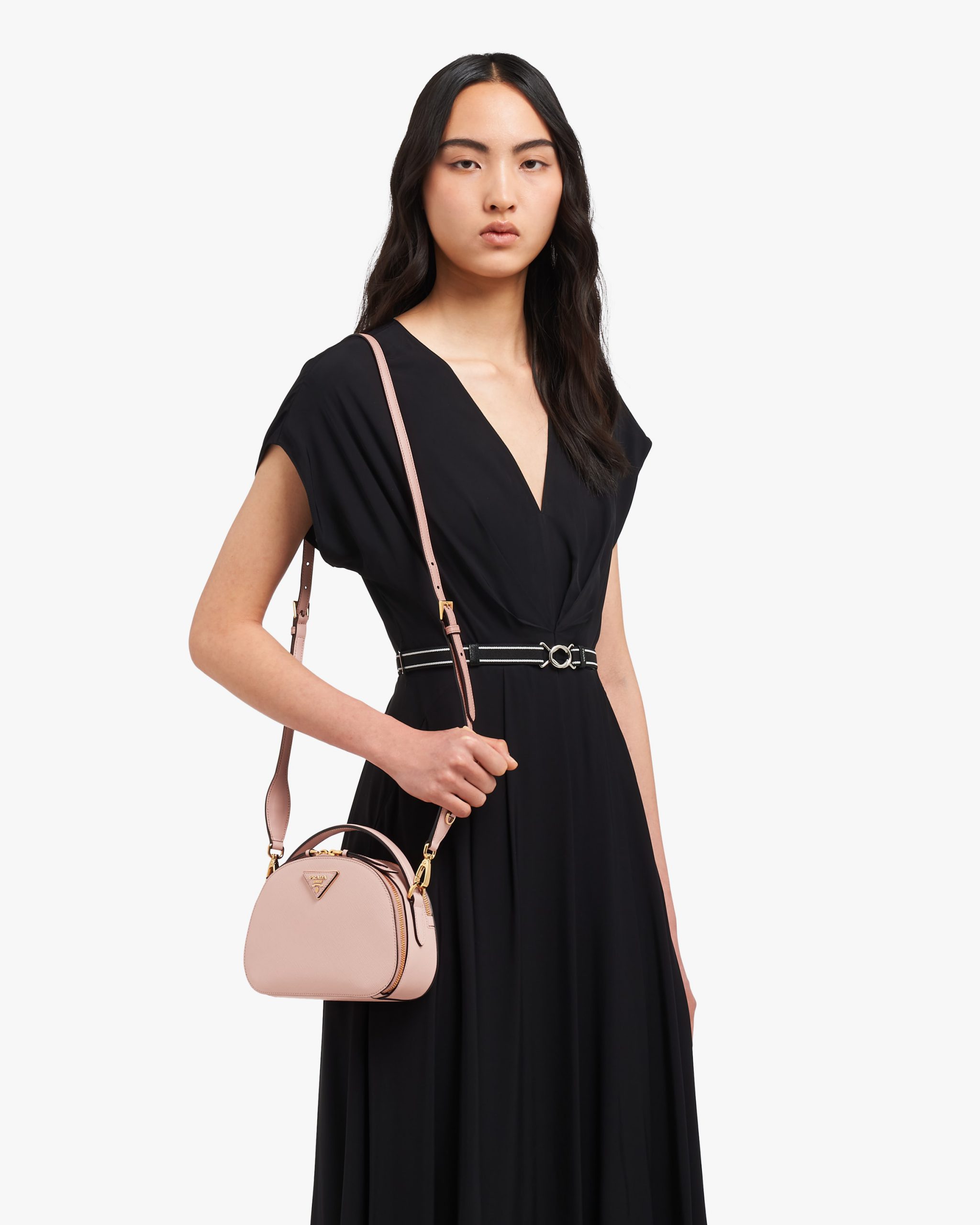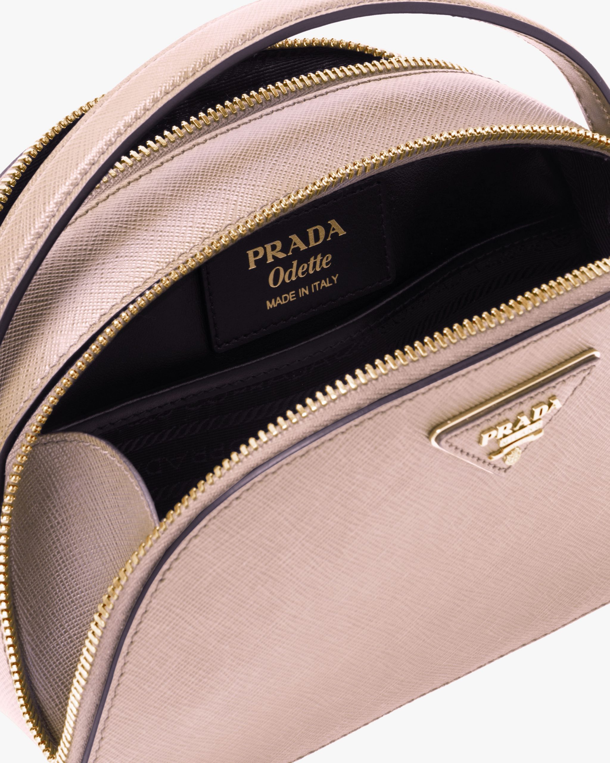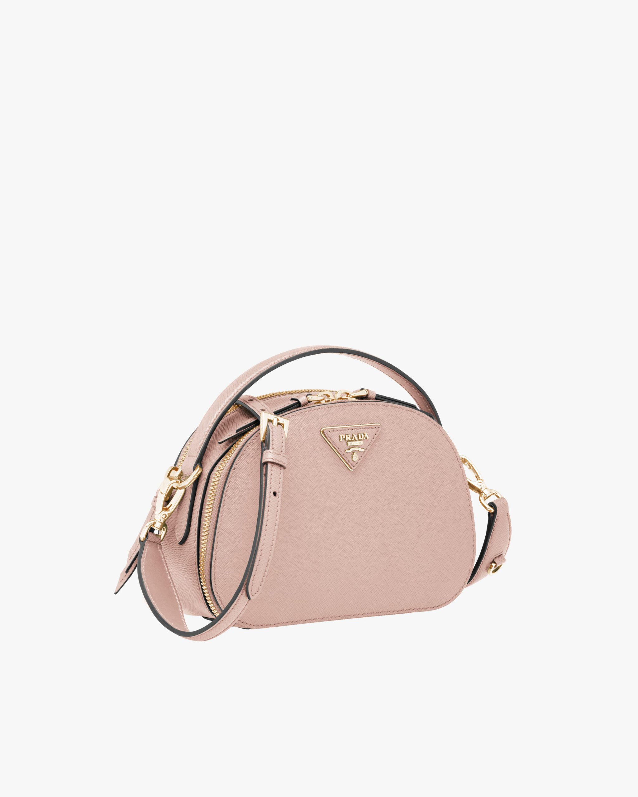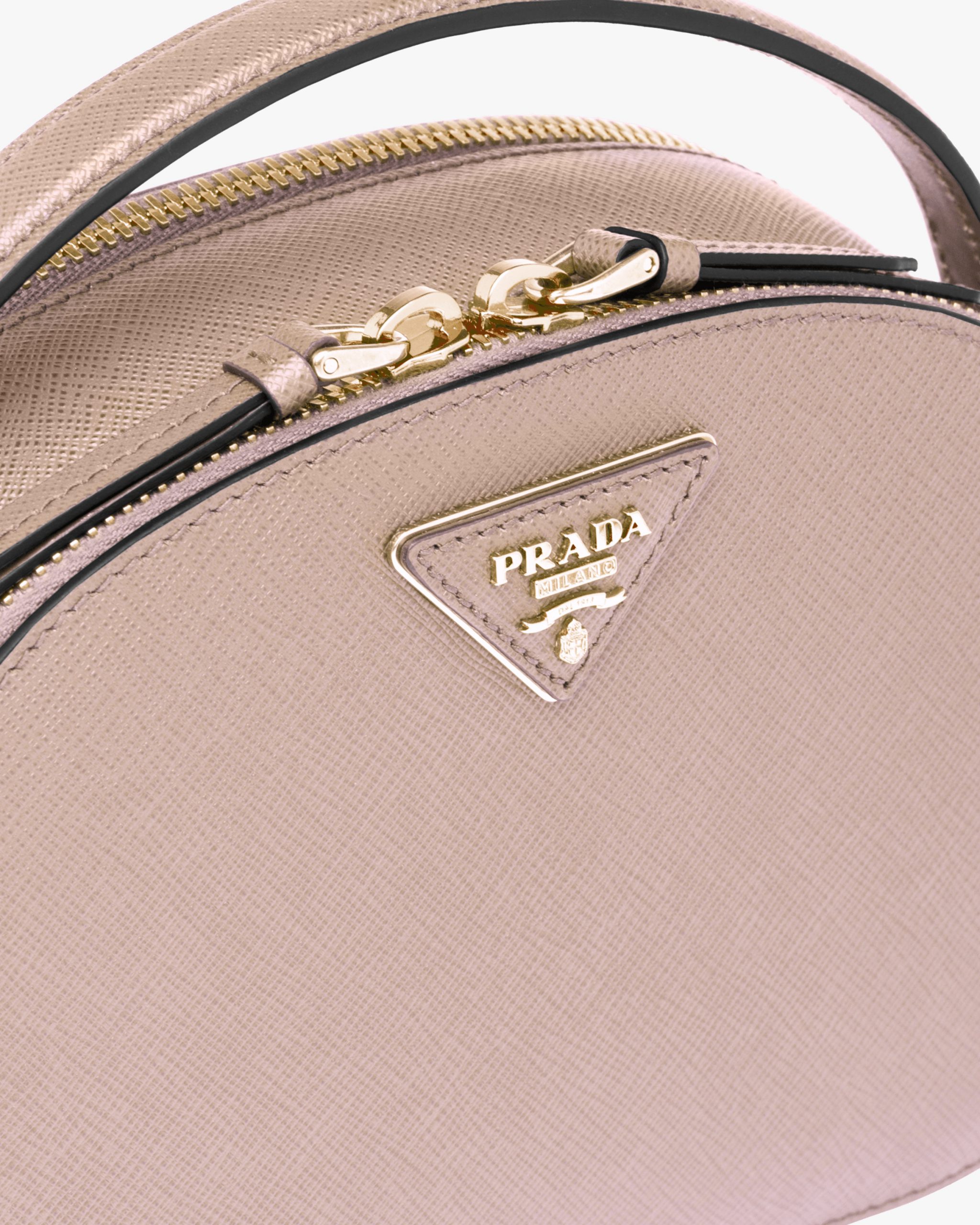 The rounded design of the Prada Odette bag is inspired by photographers’ camera cases. Made of fine Saffiano leather and decorated with the iconic triangle logo, the bag can be carried by hand or worn with a shoulder strap.