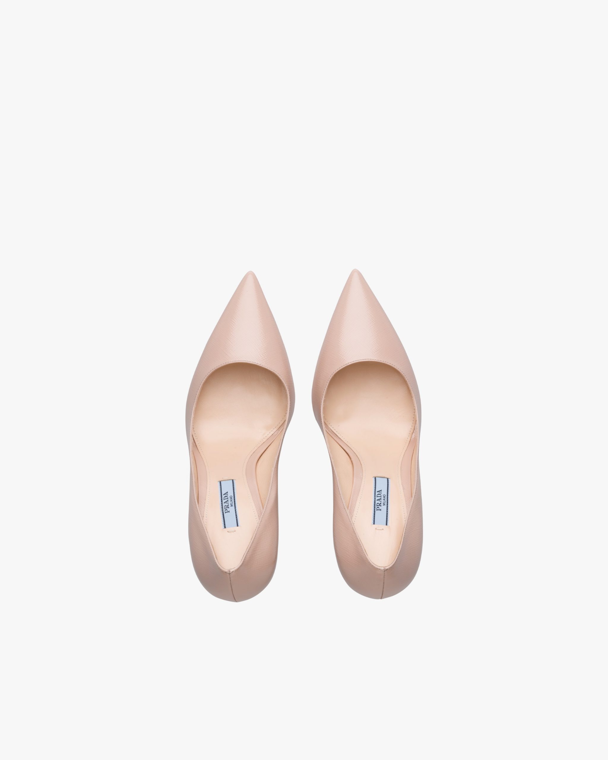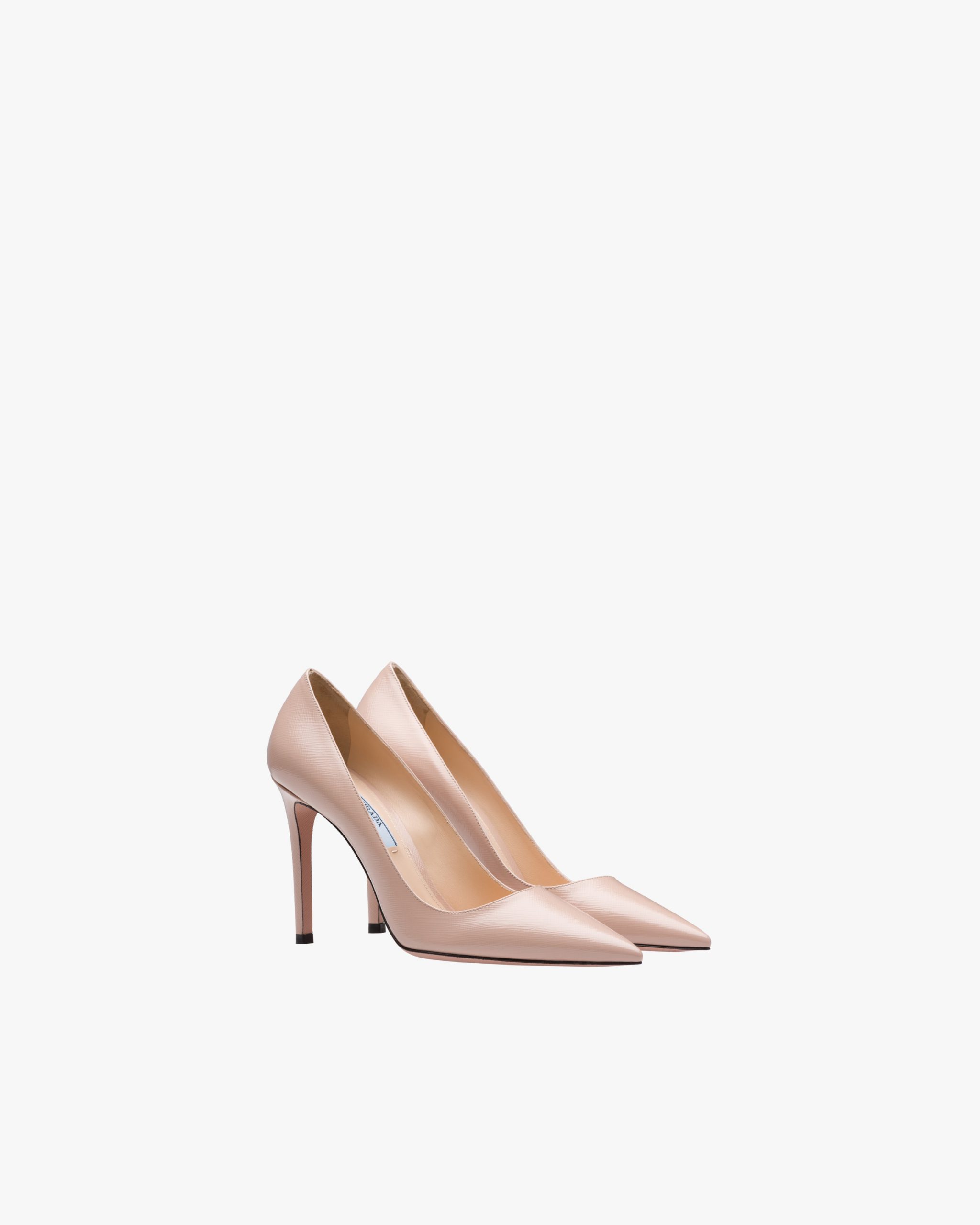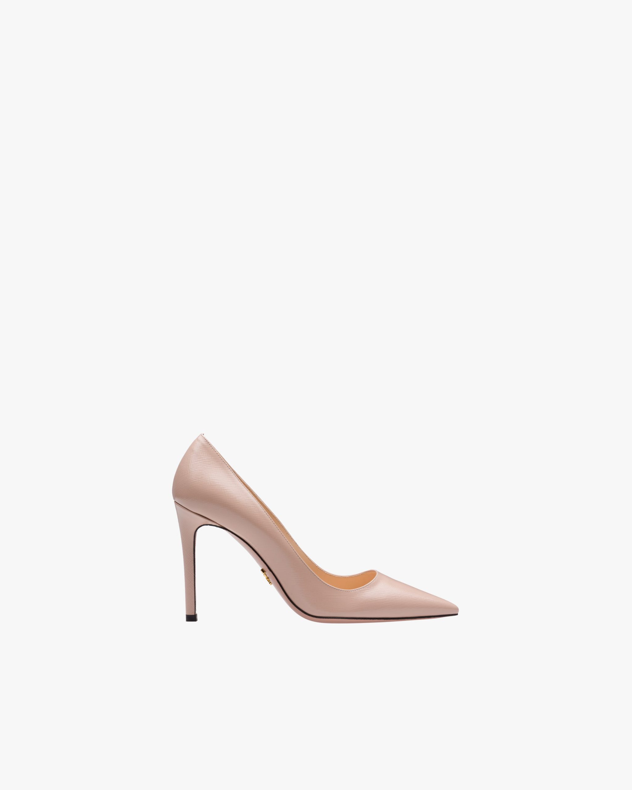 These Saffiano textured patent leather pumps with tapered silhouette and slim 100 mm stiletto heel express timeless femininity.