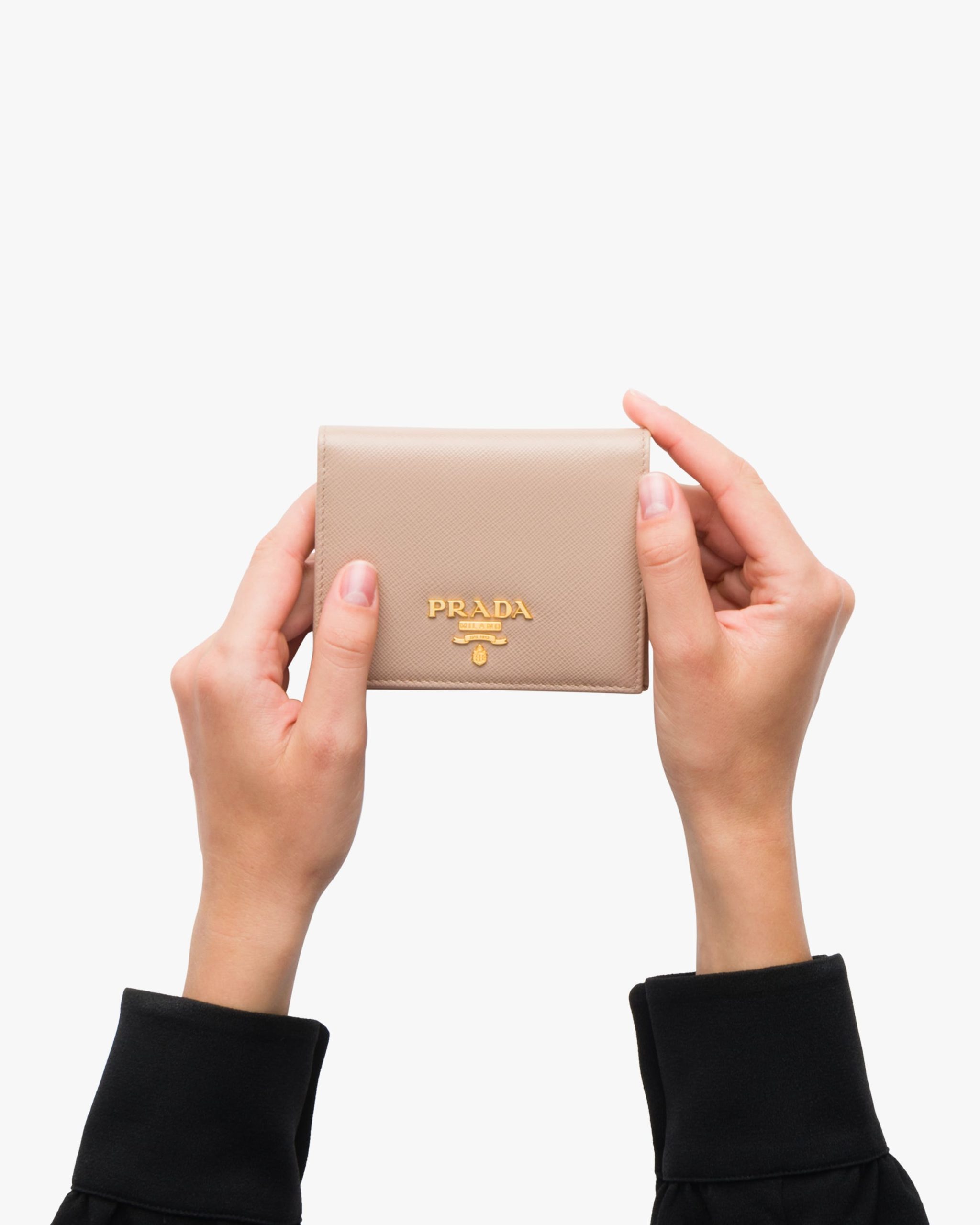 This monochrome wallet in fine Saffiano leather has an elegant minimalist design enhanced by the lustrous gold-tone lettering logo. There are several compartments and pockets inside.