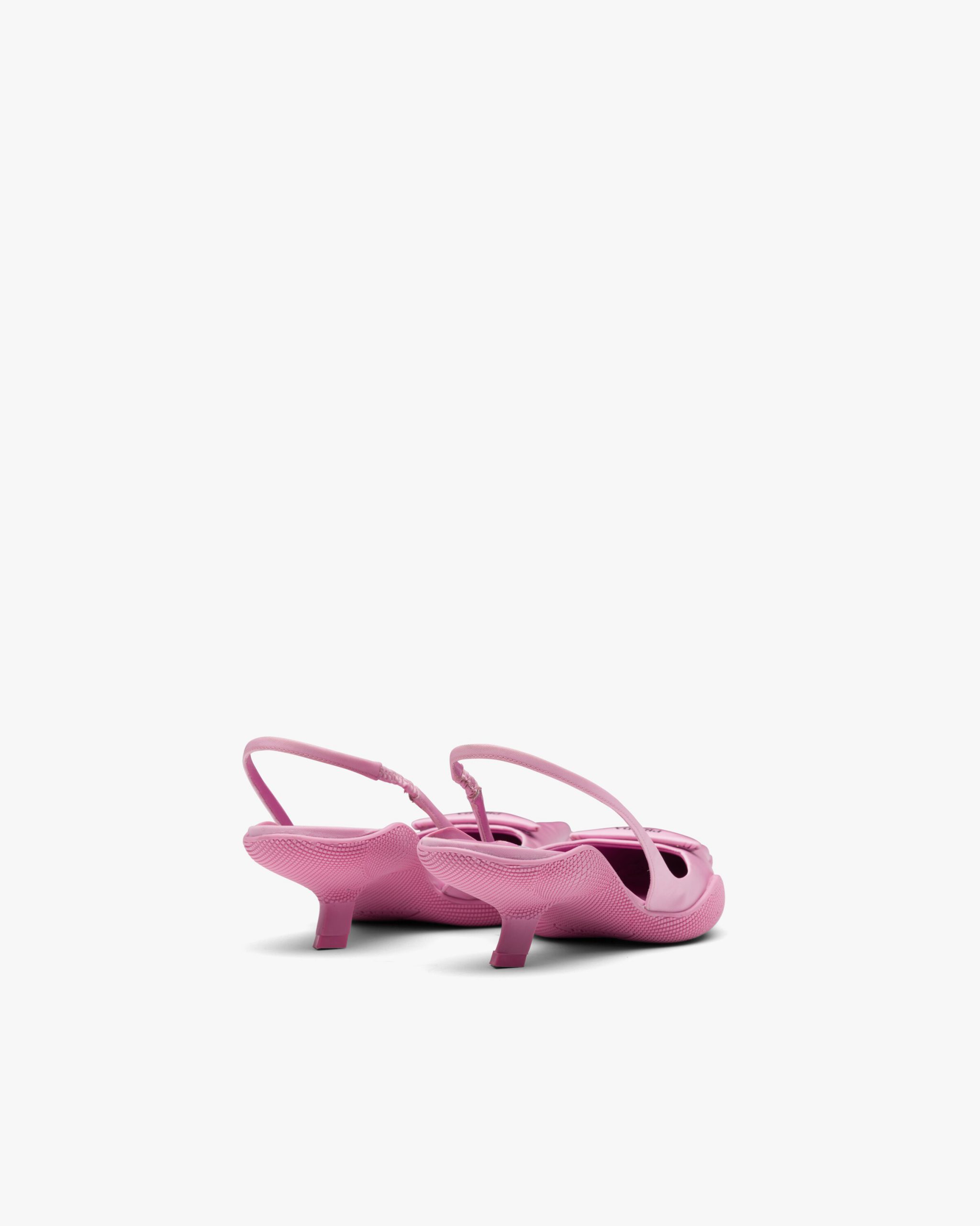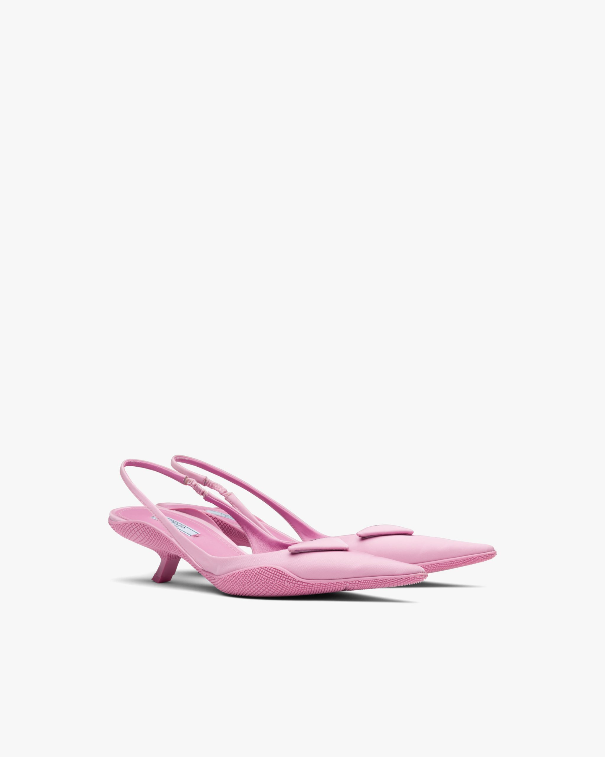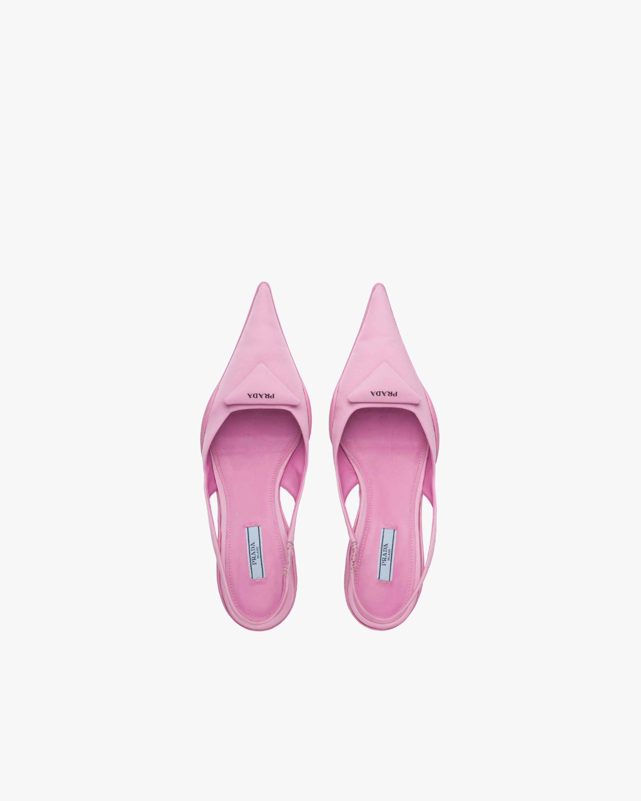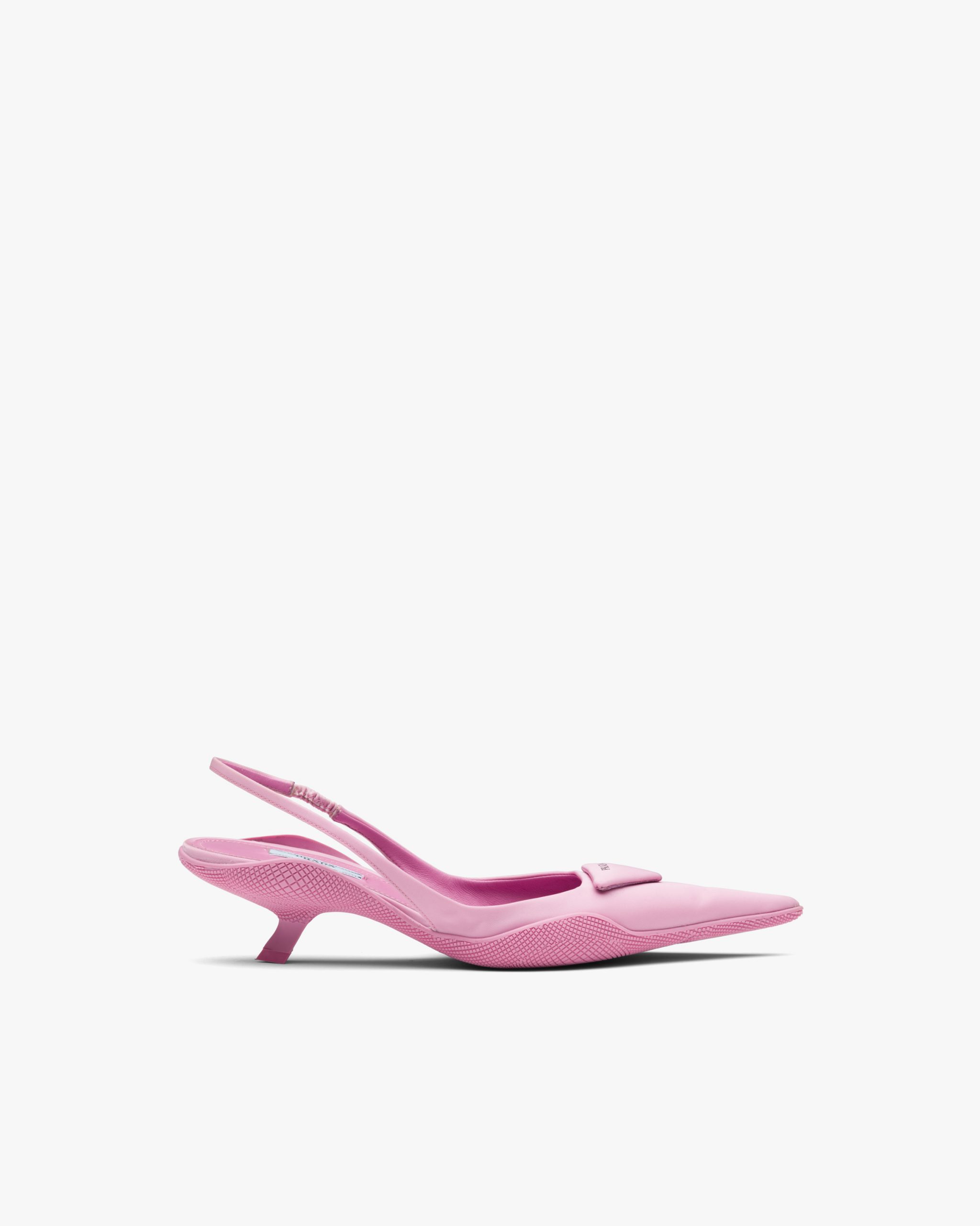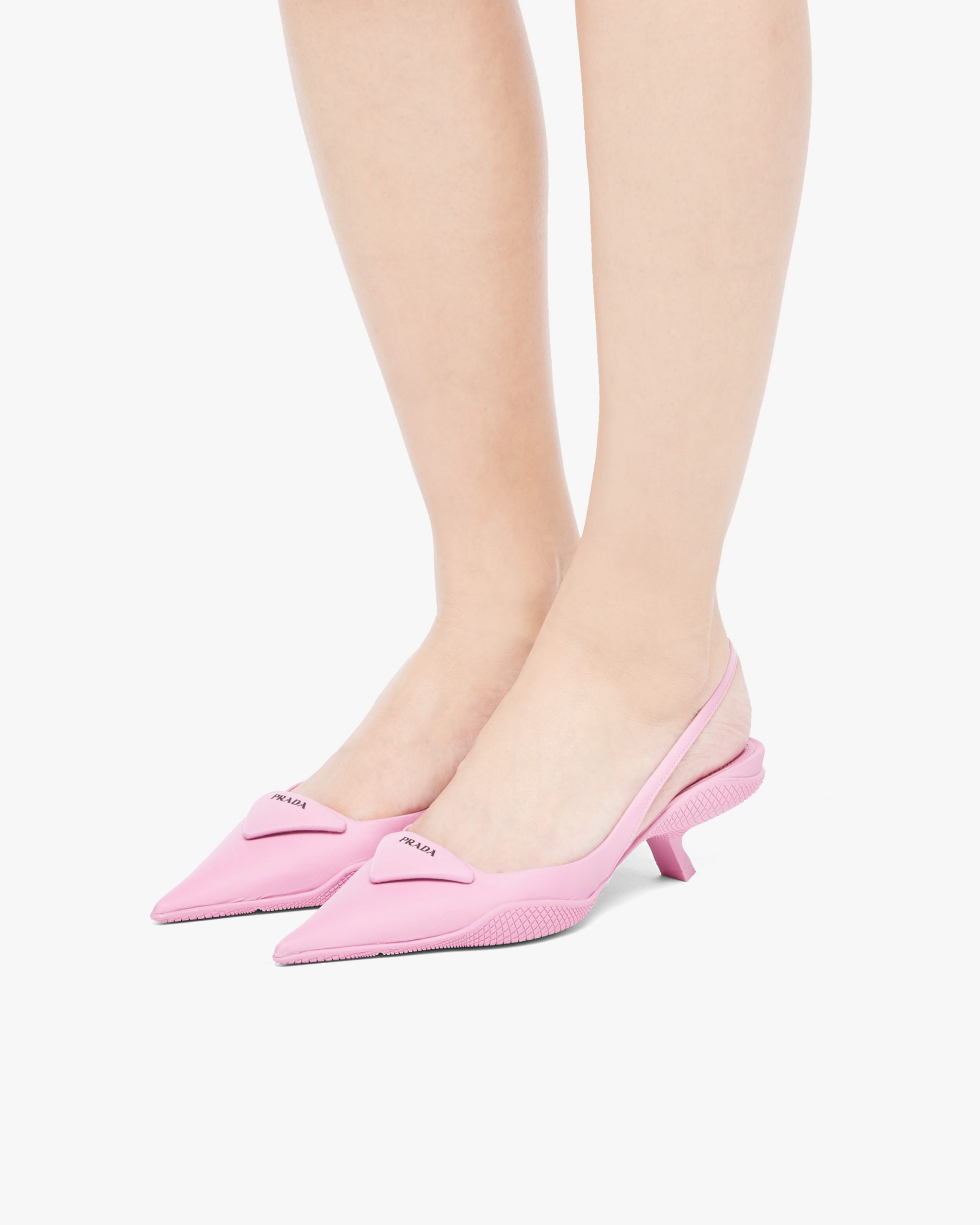 Revisiting a design from the Prada archives of the ’90s, the rubber shell sole envelops the upper of these nylon gabardine slingback pumps, creating a hybrid silhouette that blends a feminine pointy shape and sporty references. A distinctive element of the Spring Summer 2021 collectsion is the comma heel, inspired by styles from the same decade. New variations arrive for the iconic triangle, which turns into a slightly padded fabric detail featuring the screen-printed Prada logo.