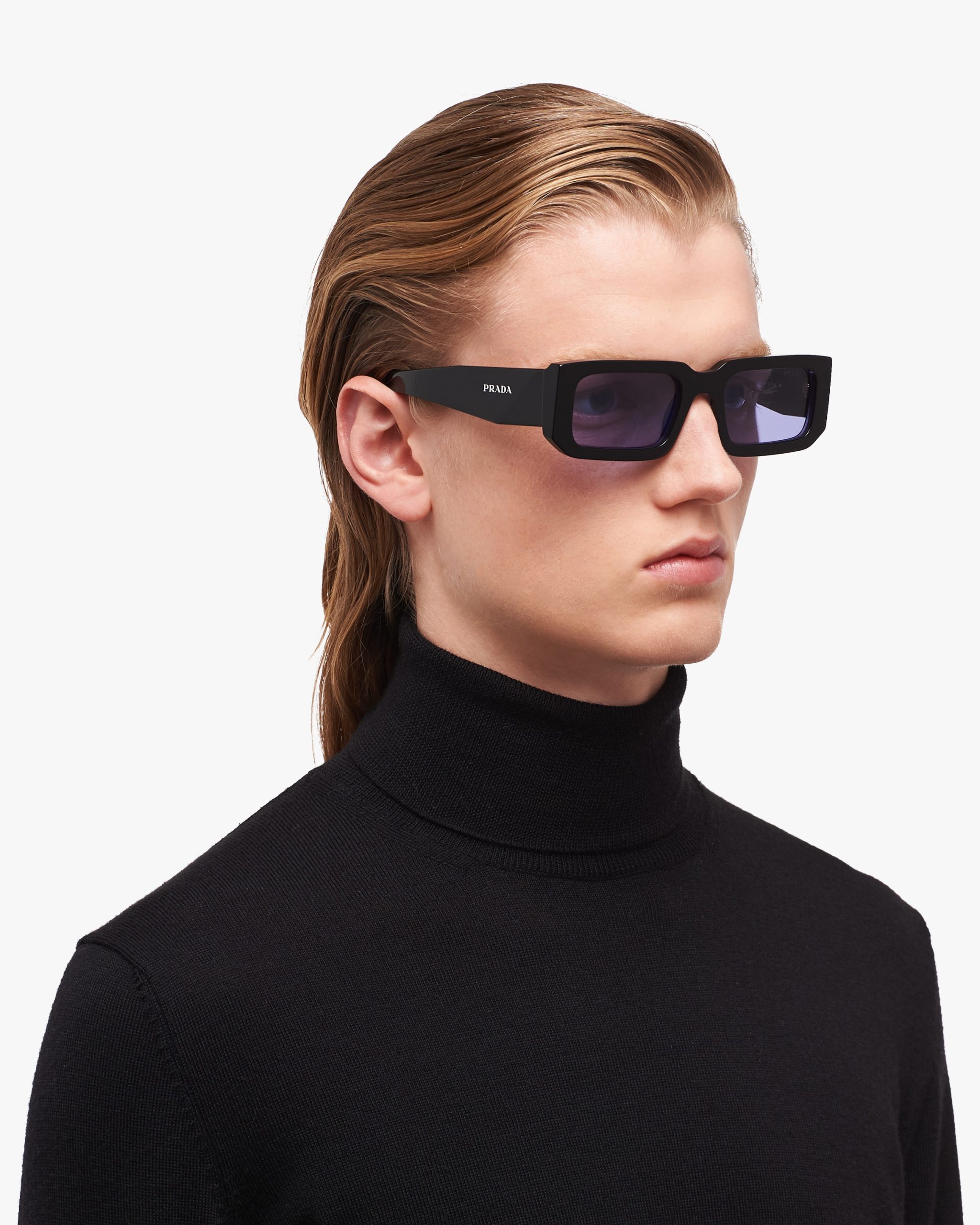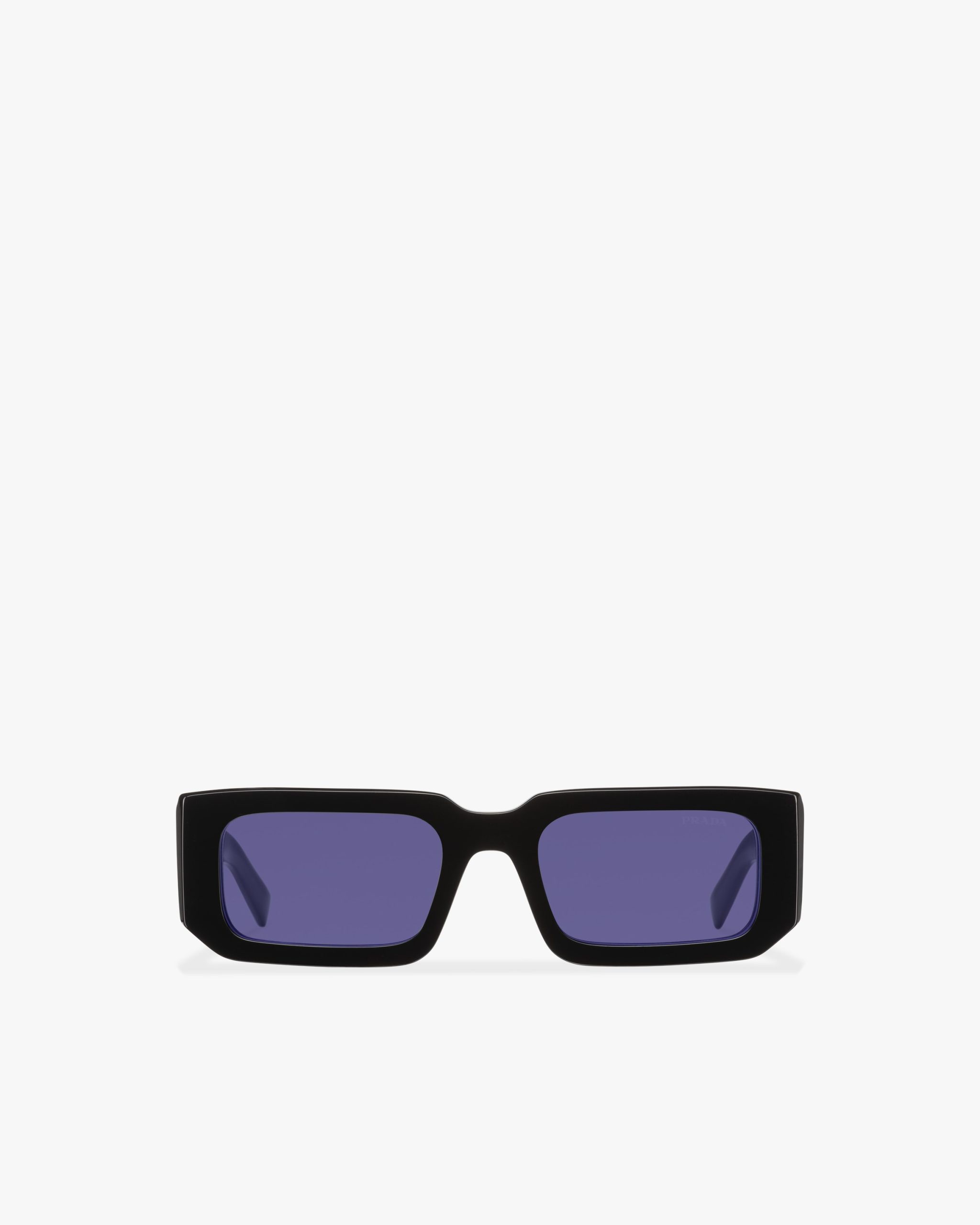Acetate sunglasses from the Prada Symbole collectsion. The bold rectangular frame is composed of a refined combination of acetate layers highlighted by contrasting colors on the lens rims. The three-dimensional workmanship on the temples features an iconographic interpretation of the traditional Prada triangle logo.
