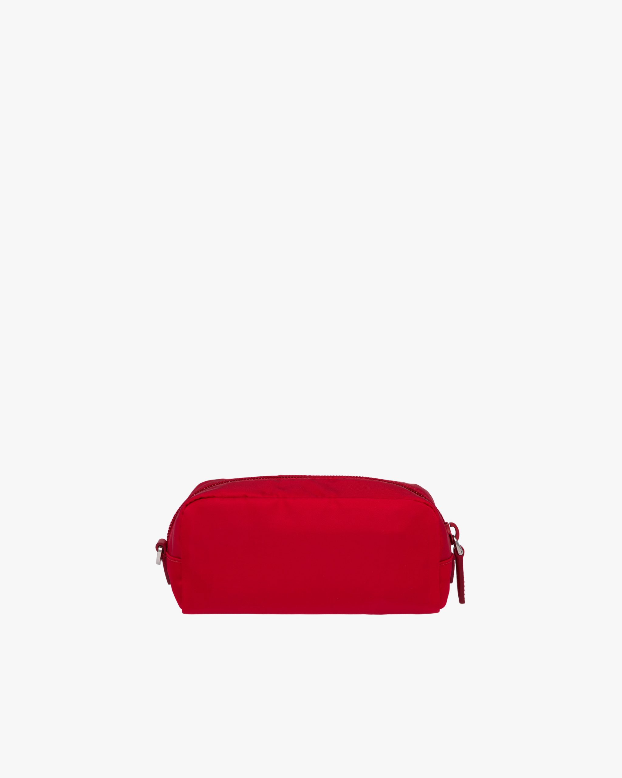 A cosmetic pouch with an elongated shape. Decorated with a Prada logo on the front and leather zipper pulls, it offers one spacious compartment and a practical, detachable leather wristlet.