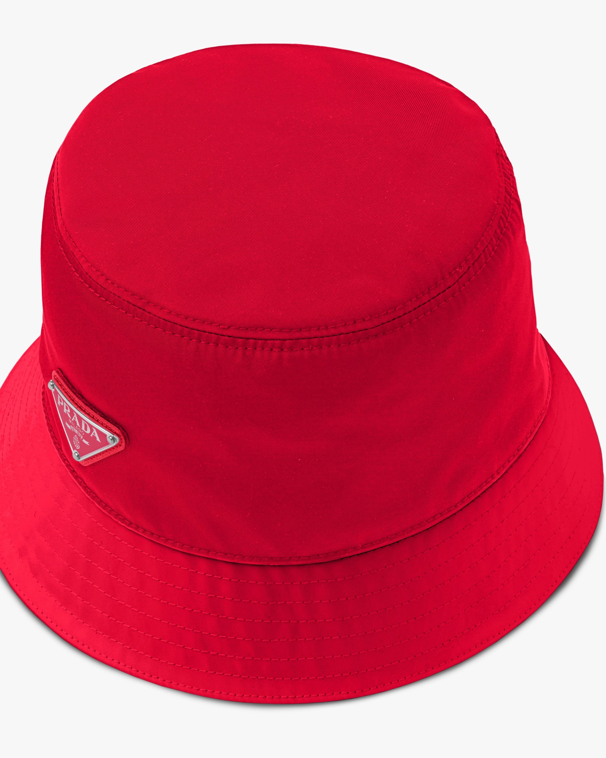 This bucket hat, an iconic accessory of Prada collectsions, is made of Re-Nylon: regenerated nylon yarn (ECONYL?)produced from recycled, purified plastic trash collectsed in the ocean, fishing nets and textile waste fibers.
