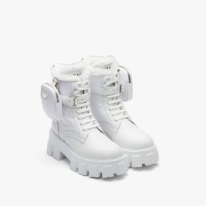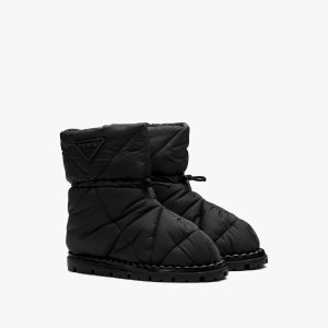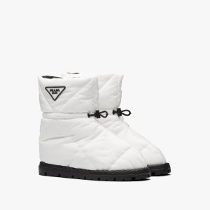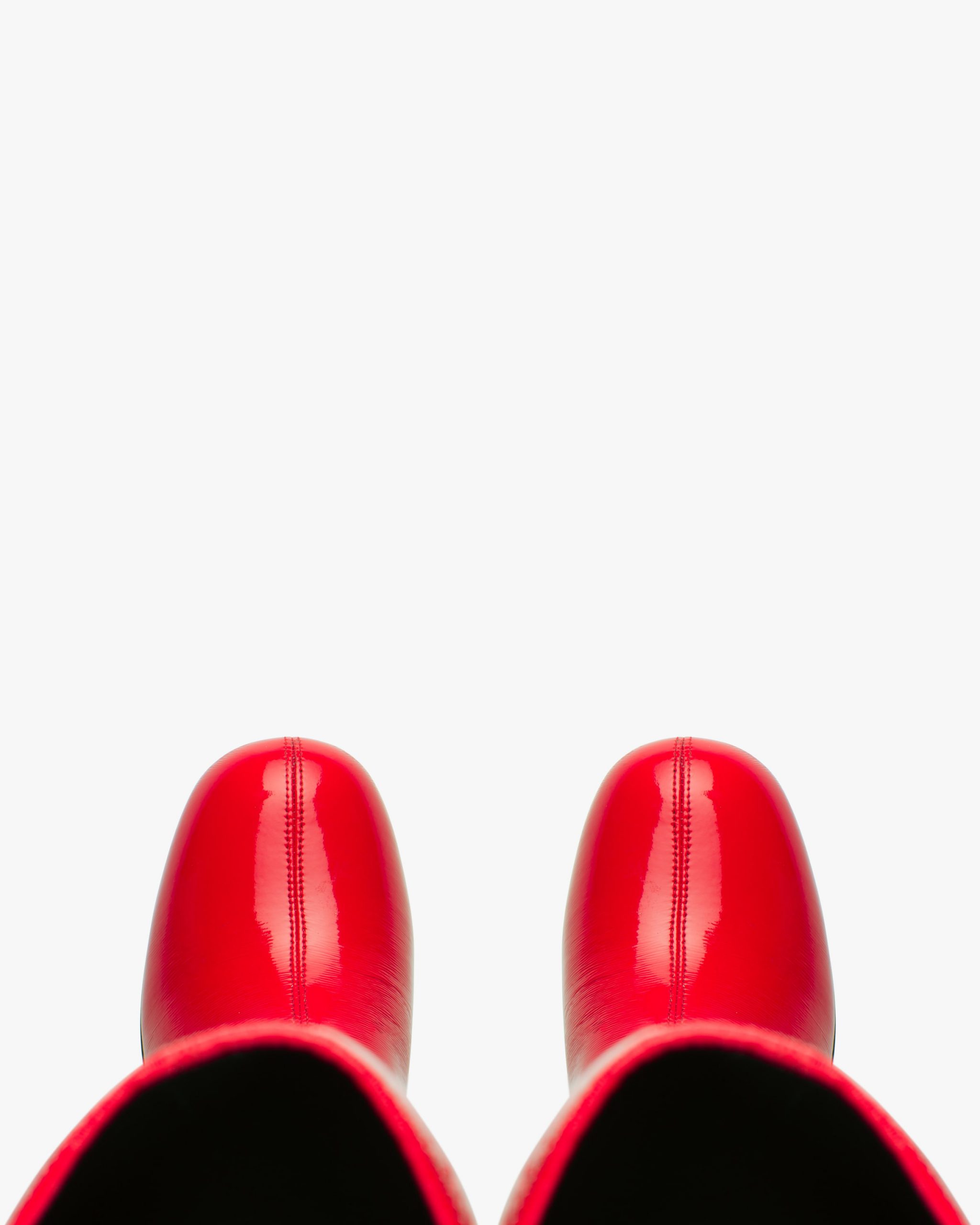 Contemporary charm characterizes these patent leather boots with side zipper and leather-covered midi heel. The logo decorates the leather and rubber sole.