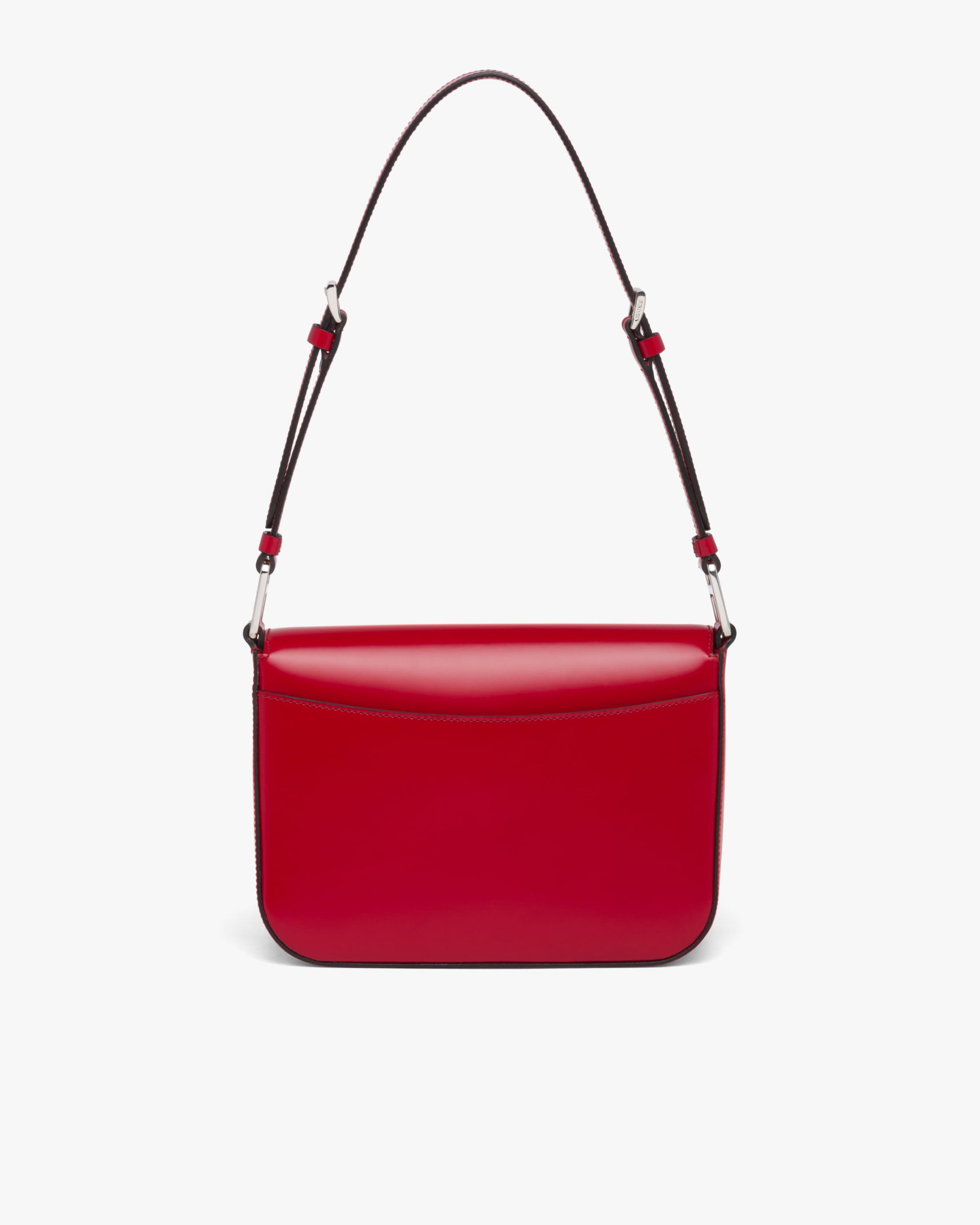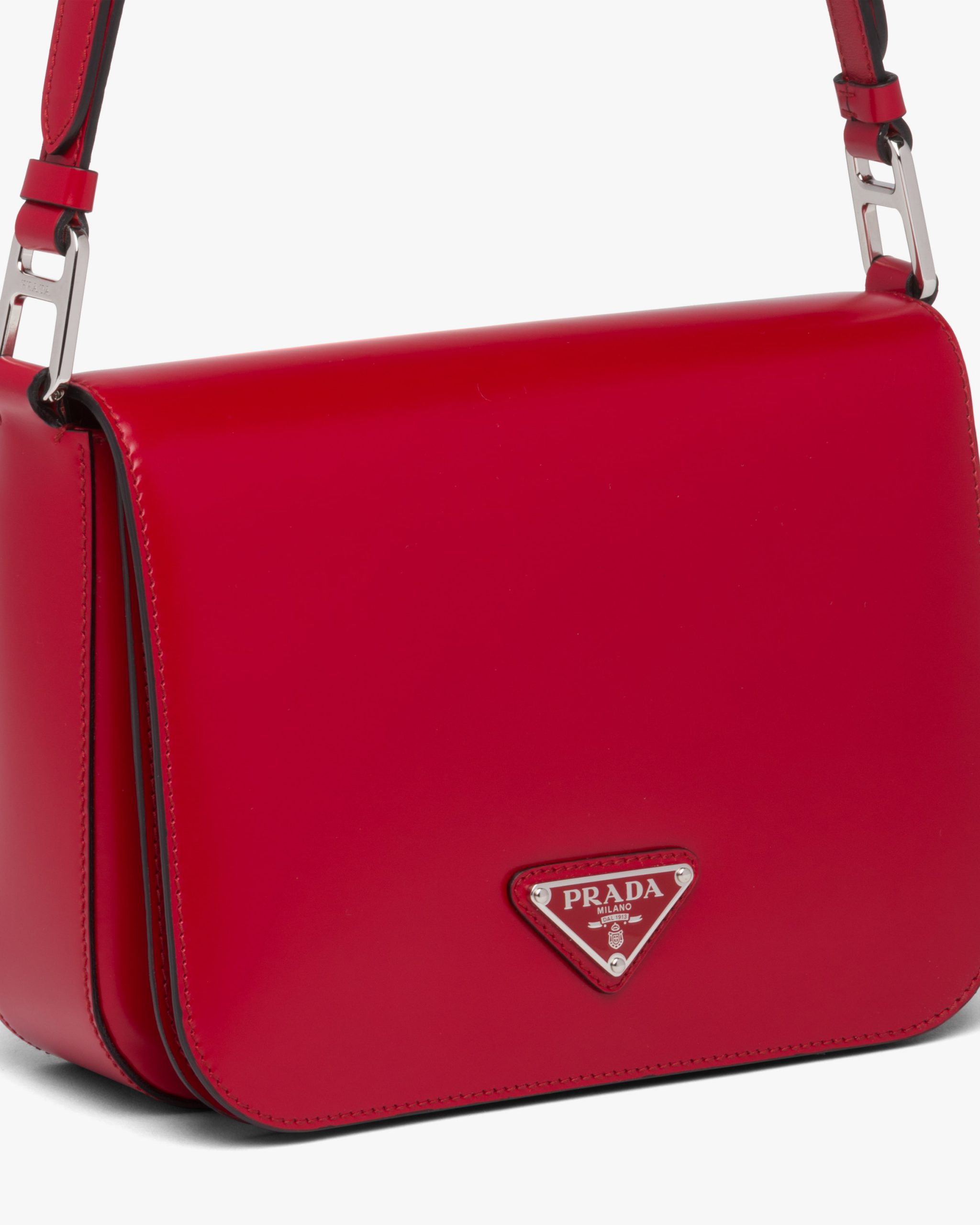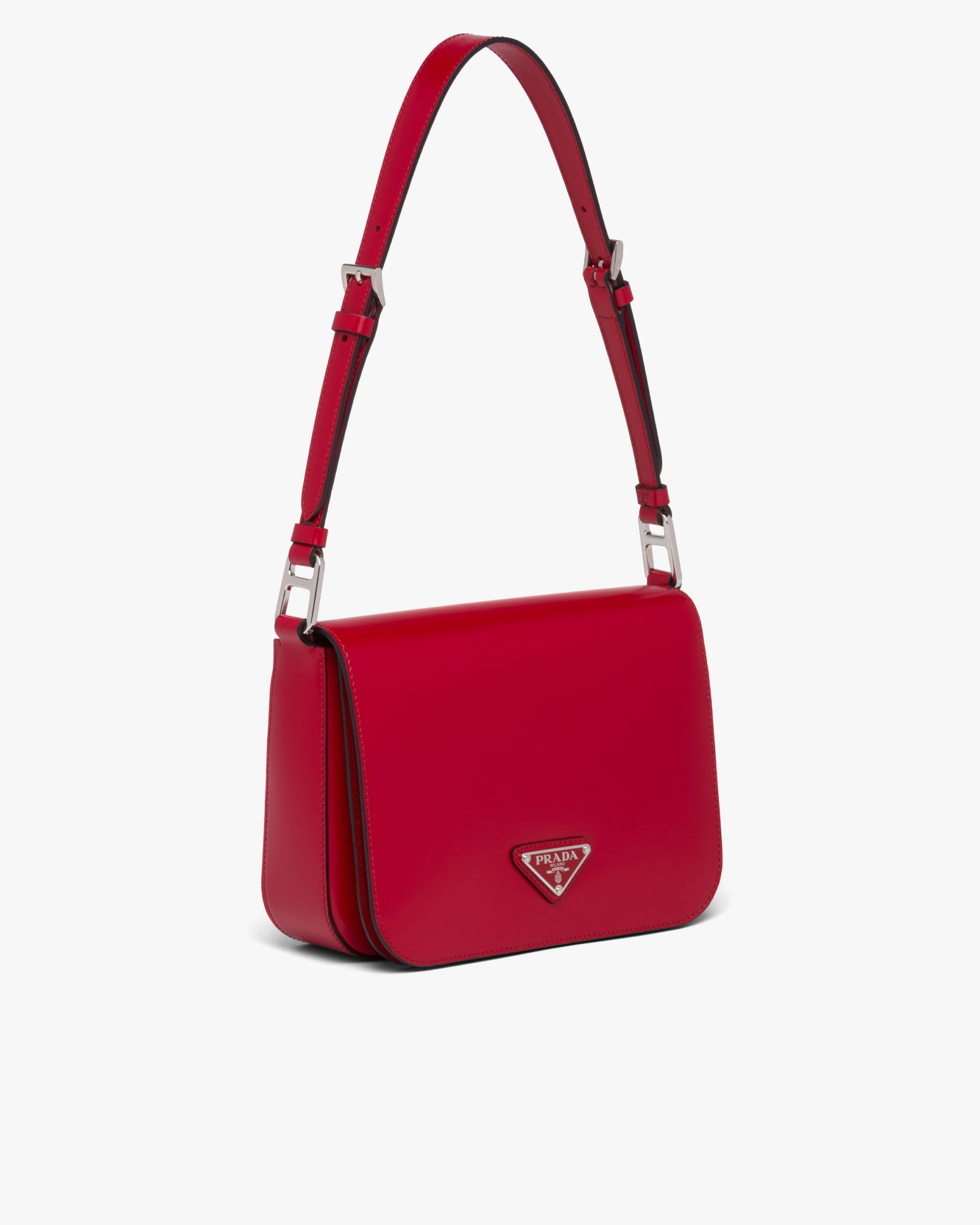 Elegance and practicality meet in this bag with a hybrid character that combines sleek and modern lines, functionality, and fine materials. Made of Prada’s iconic brushed leather, a material that is as chameleonic as it is luxurious, this rigid, curvy bag is characterized by its flap closure and leather shoulder strap that is adjustable for wear as a crossbody or shoulder bag. Decorating the flap is the emblematic enameled metal triangle logo created by founder Mario Prada and reinvented on contemporary designs.