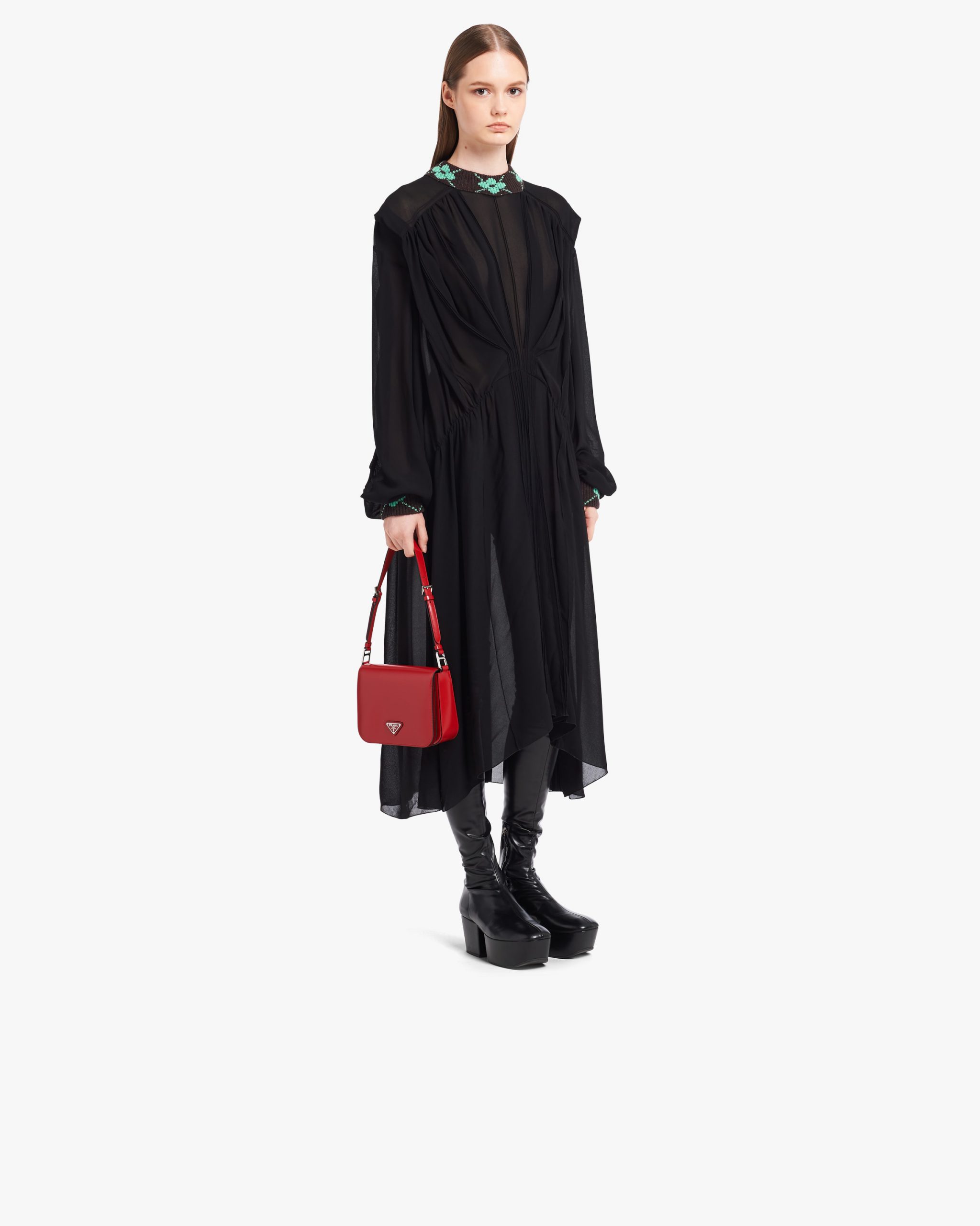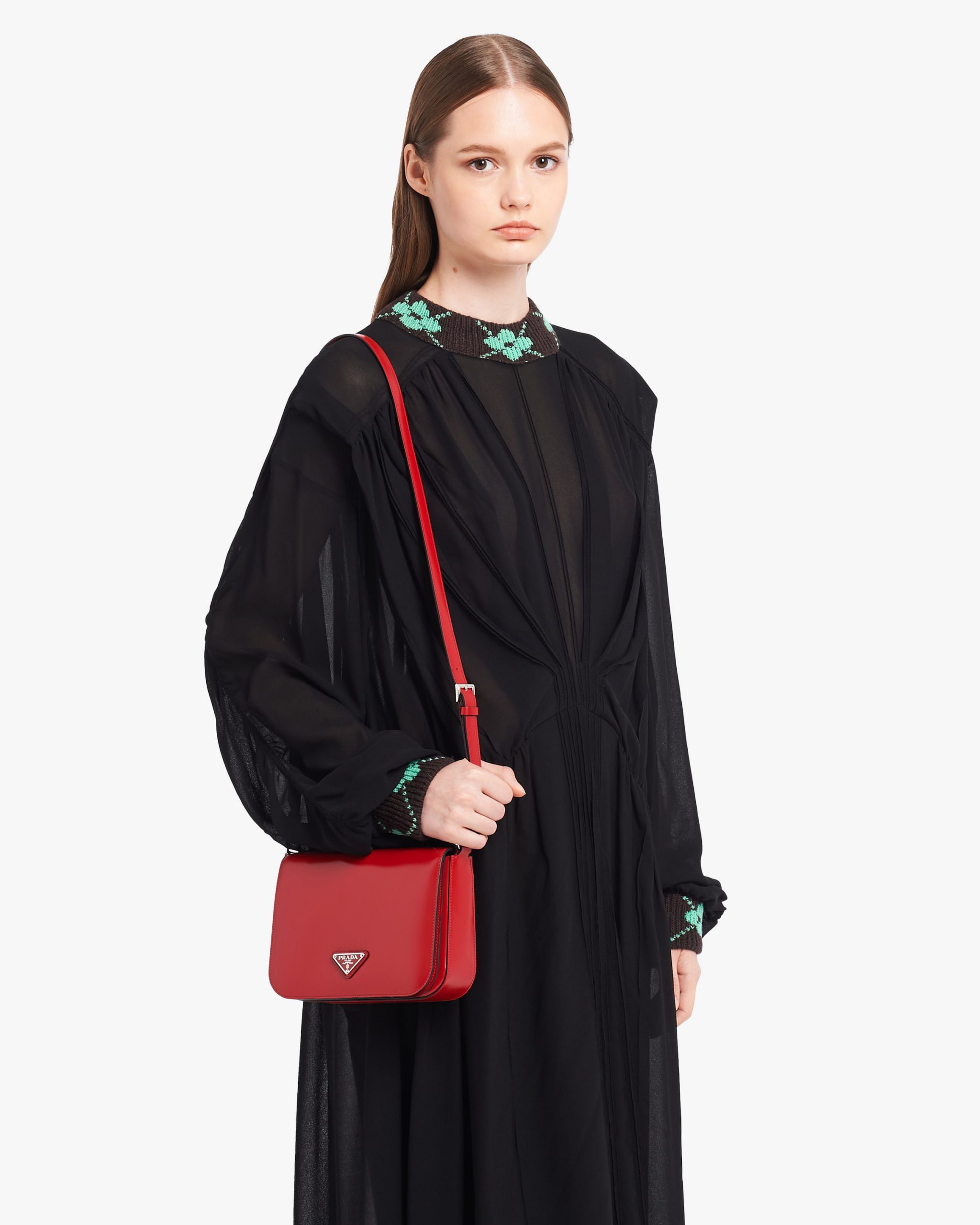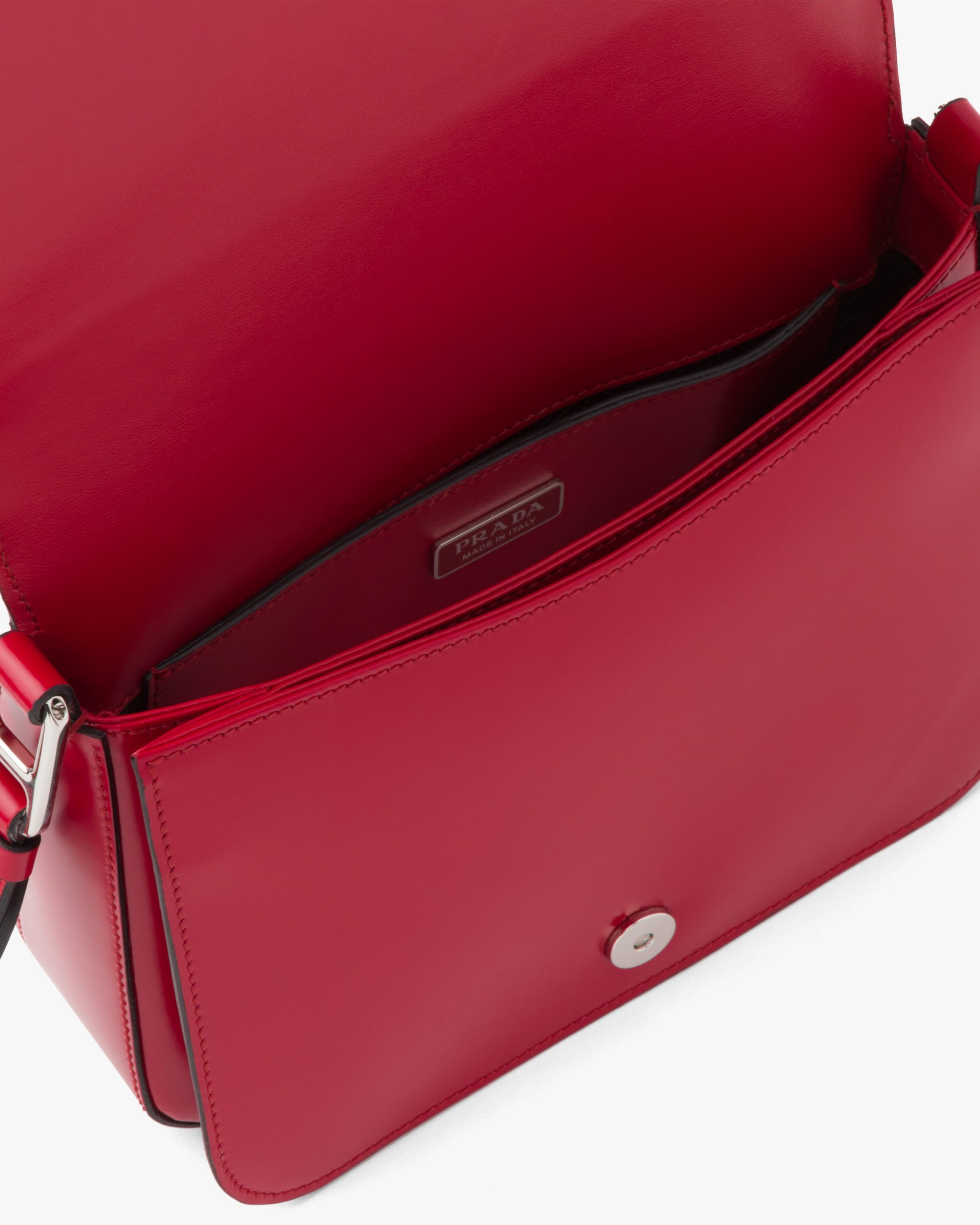 Elegance and practicality meet in this bag with a hybrid character that combines sleek and modern lines, functionality, and fine materials. Made of Prada’s iconic brushed leather, a material that is as chameleonic as it is luxurious, this rigid, curvy bag is characterized by its flap closure and leather shoulder strap that is adjustable for wear as a crossbody or shoulder bag. Decorating the flap is the emblematic enameled metal triangle logo created by founder Mario Prada and reinvented on contemporary designs.