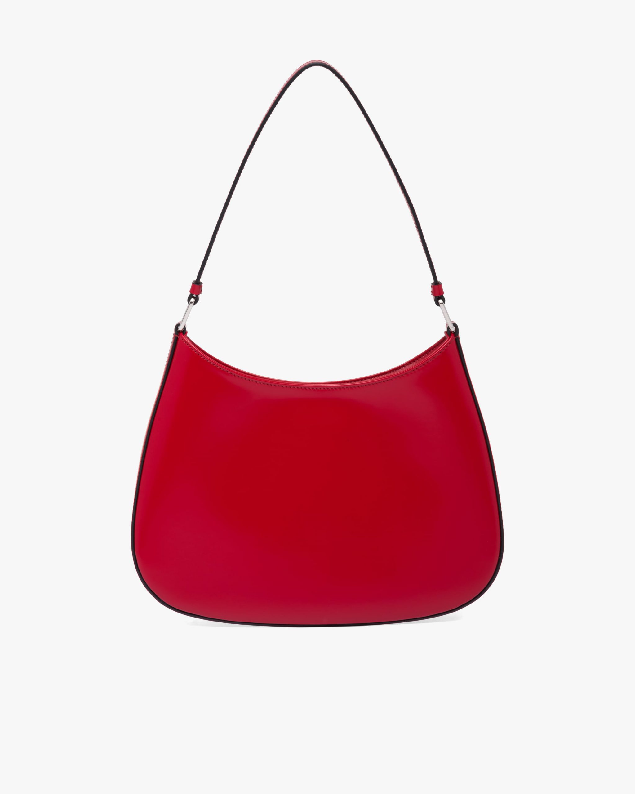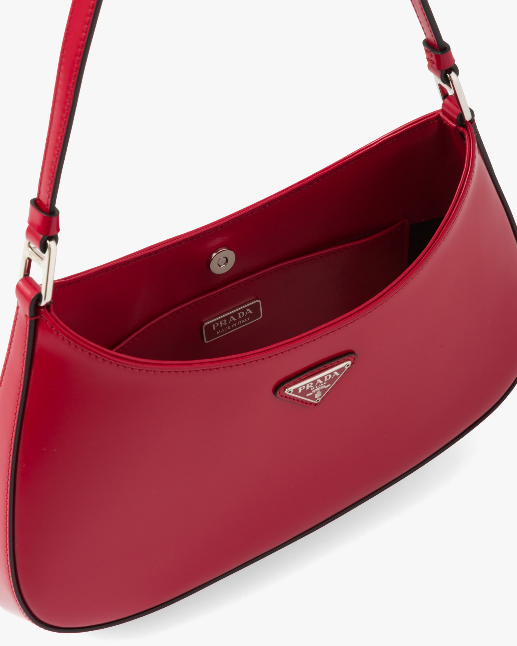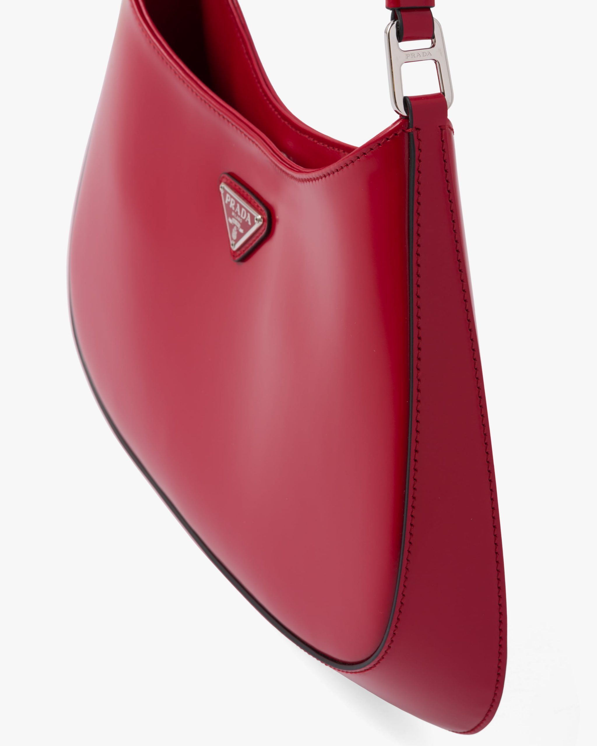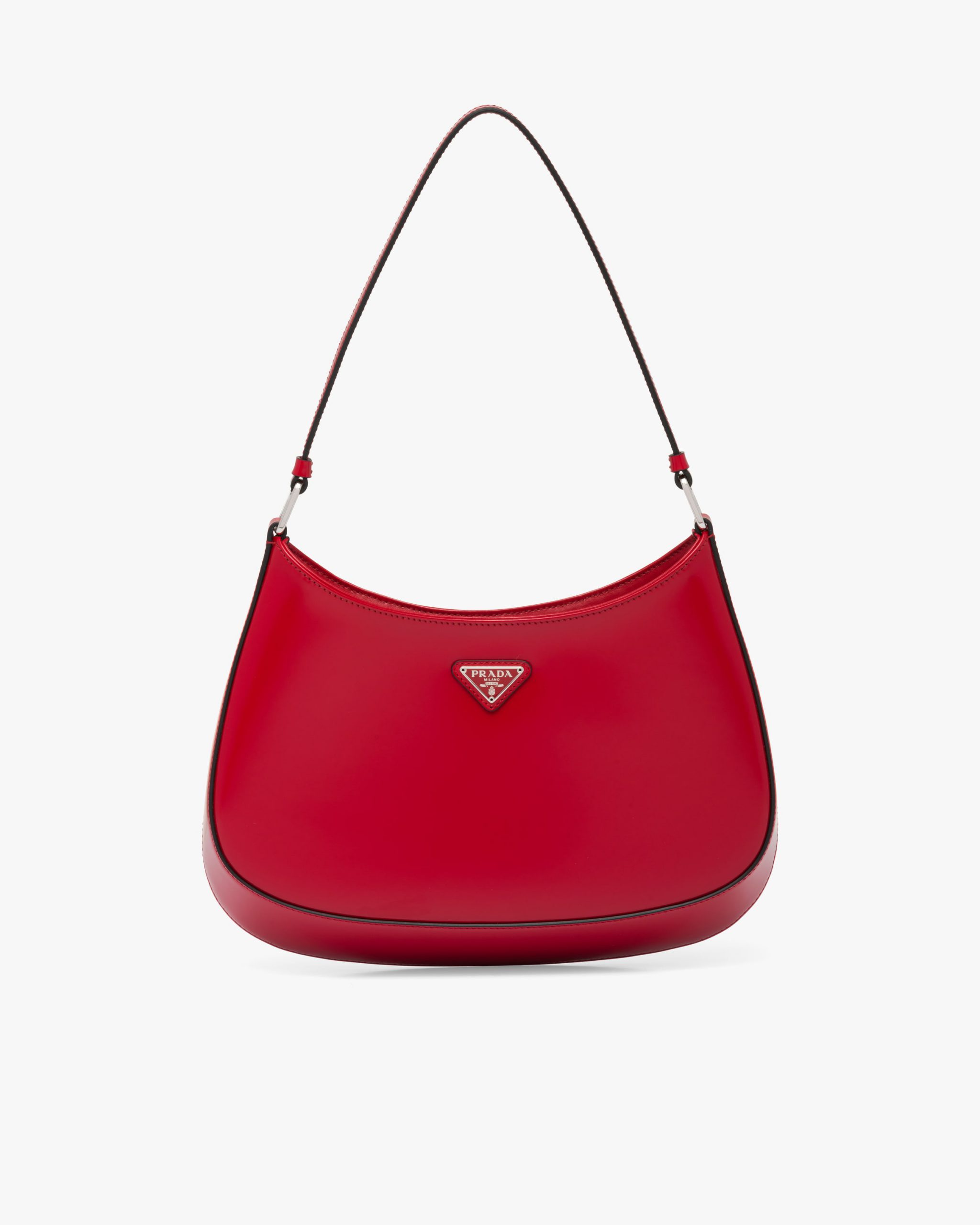 The Prada Cleo bag with sophisticated allure reinterprets an iconic design of the brand from the 1990’s. Sleek curved lines emphasized by the particular construction rounded on the bottom and sides give this hobo bag a soft, light look. Brushed leather, a modern and versatile material that is distinctive in Prada collectsions, is ideal for creating always new combinations and contrasts. The enamel triangle logo decorates the silhouette.