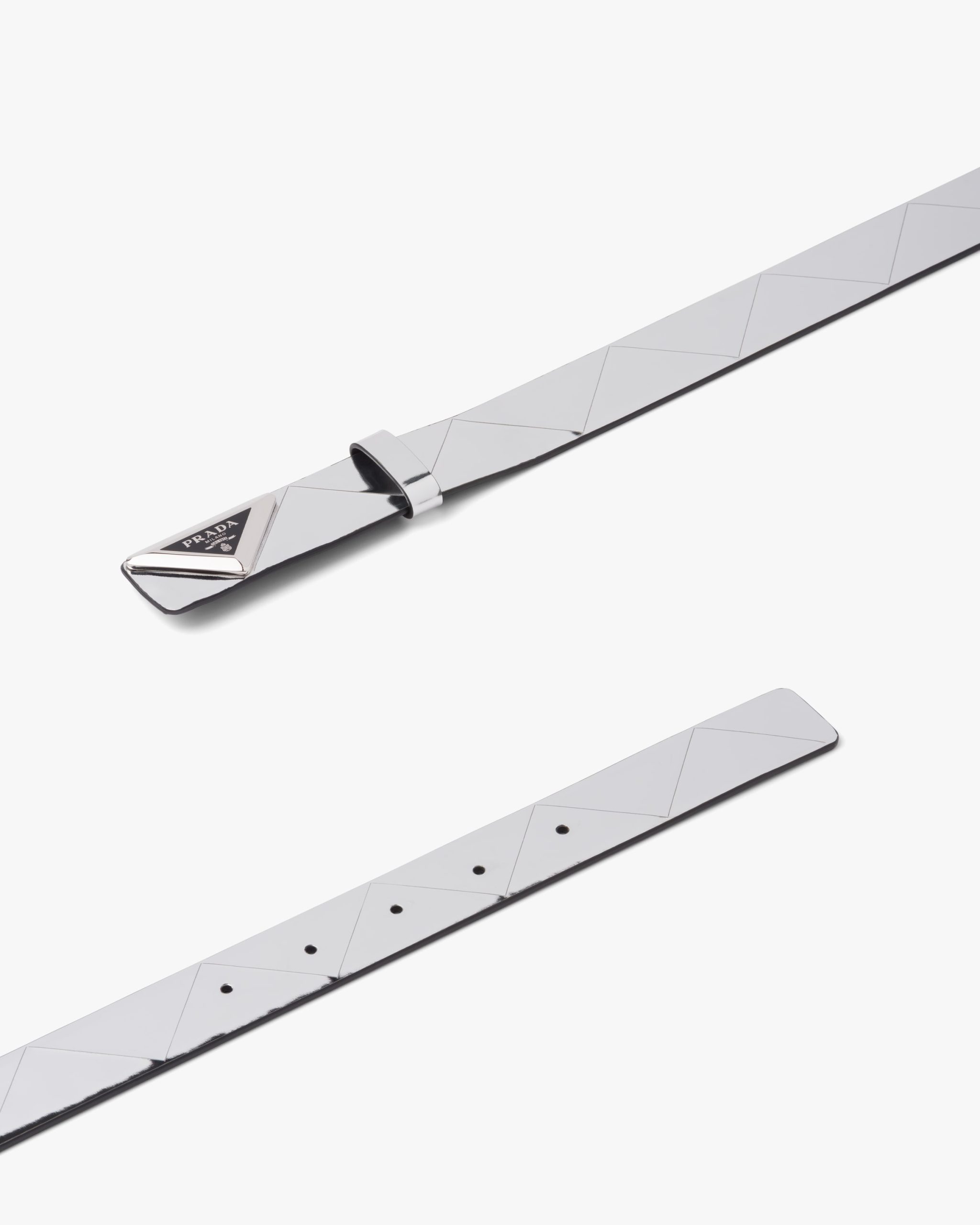 A mix of stylistic codes comes together in this belt with modern allure. A new triangle motif enhances the iconic brushed leather, creating elegant reflections. The refined buckle with enameled metal logo decorates the accessory.