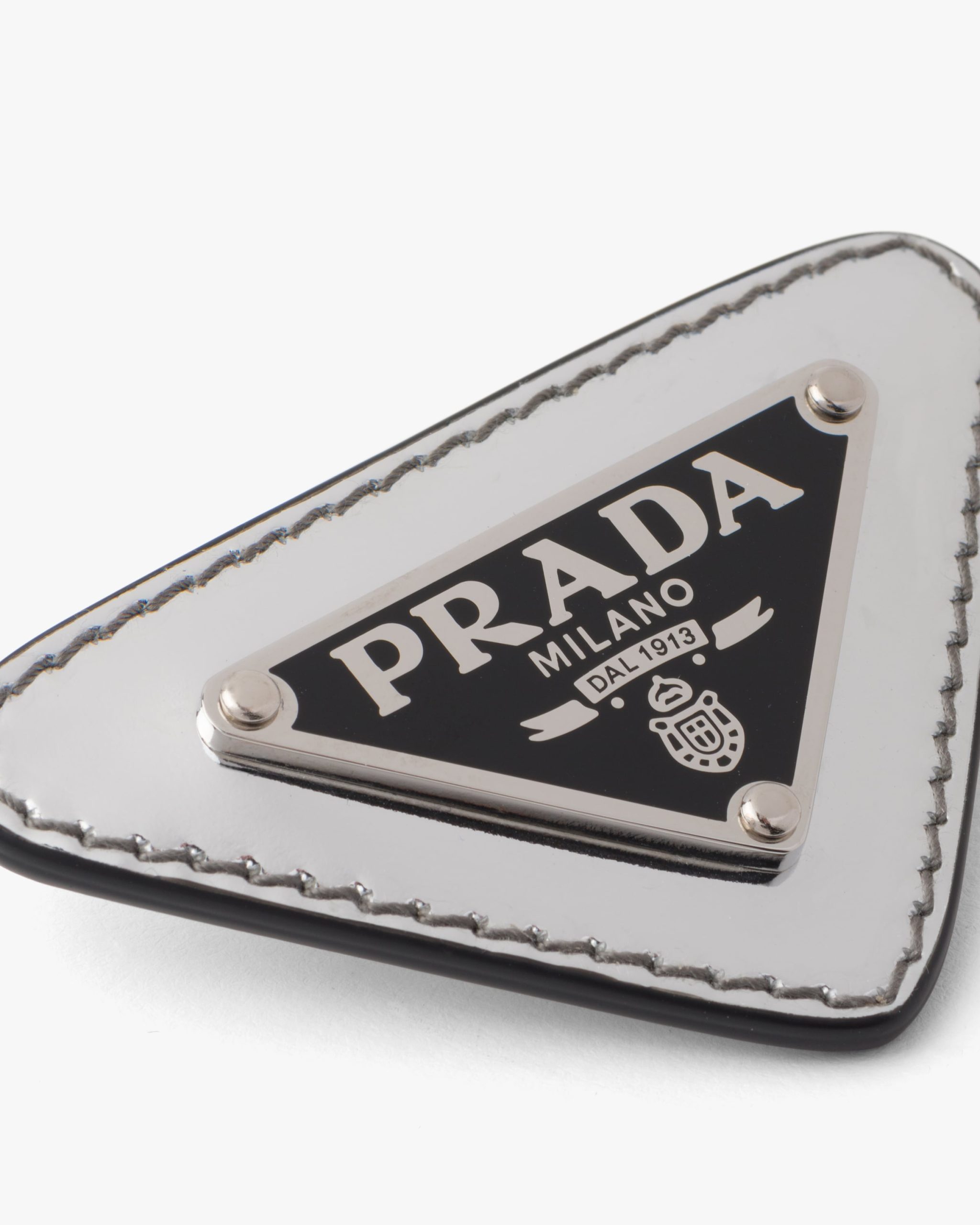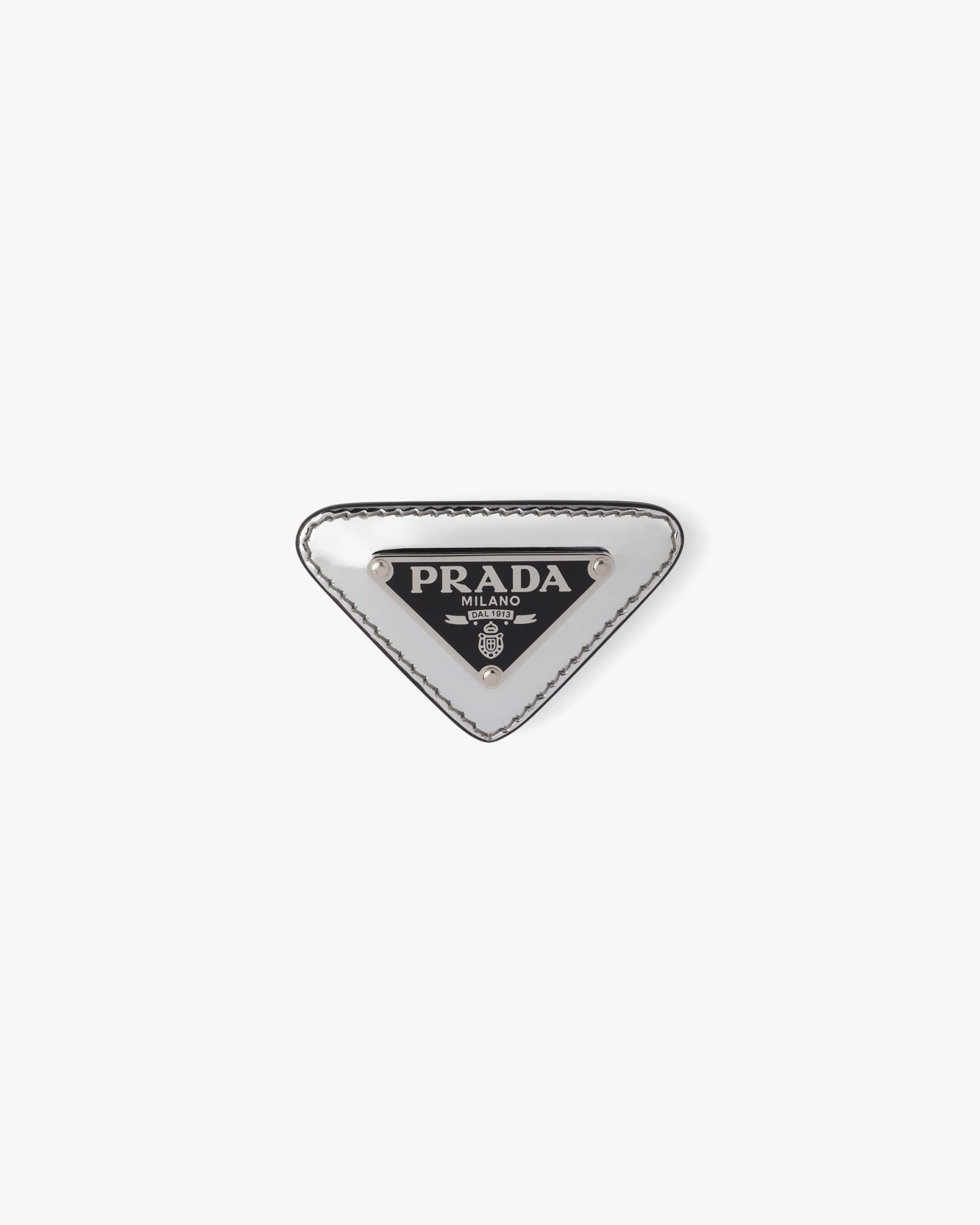 A contemporary interpretation of an 80’s trend, this brooch made of fine brushed leather gives every garment an iconic, sophisticated accent. The distinctive enameled metal triangle logo makes it an emblematic accessory.